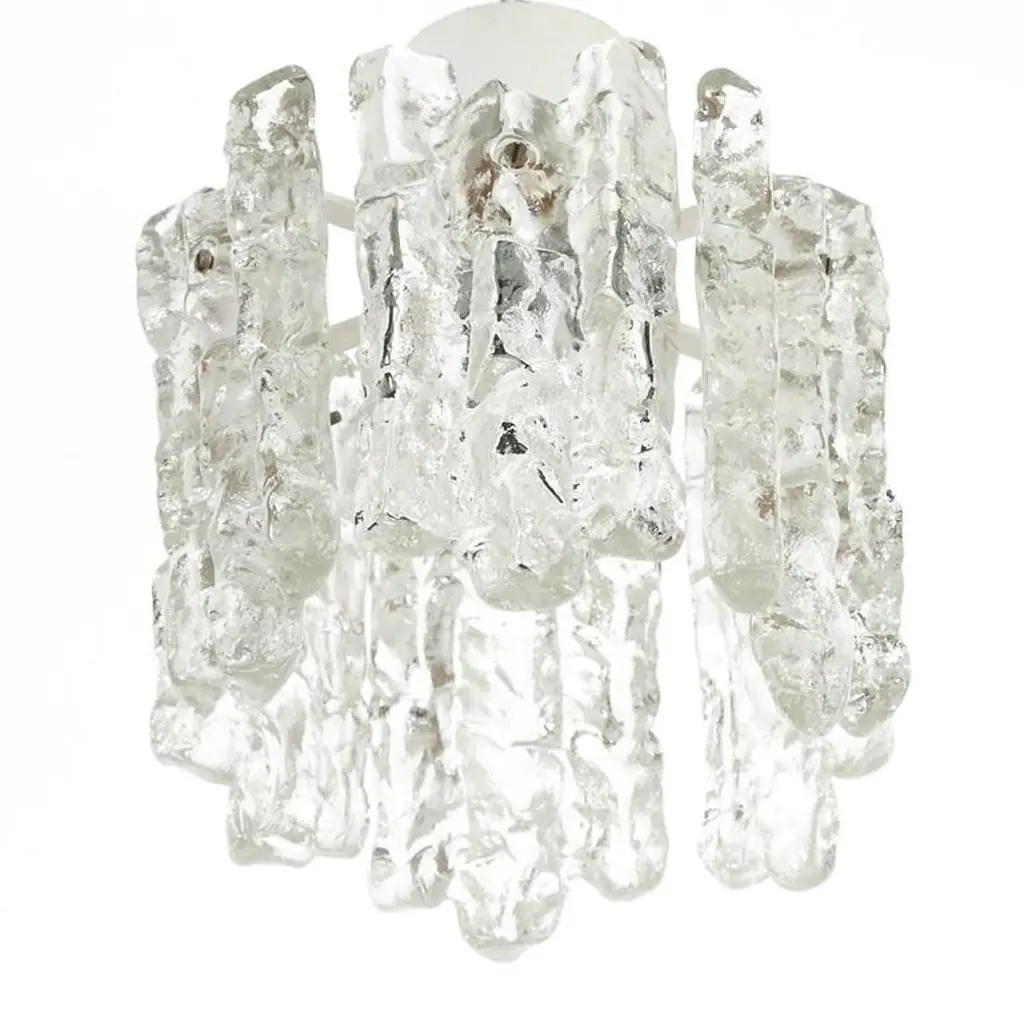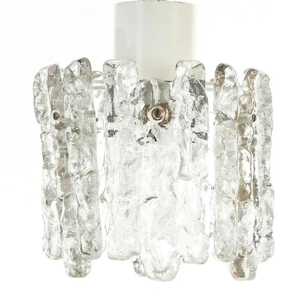 One of two nice ice glass flush mount light fixtures by Kalmar, Austria, manufactured in Mid-Century, circa 1970 (late 1960s or early 1970s).Each light takes one medium screw base bulb.The price is per lamp. They aresold individually or as pair.Matching sconces, pendant lights and chandeliers are also availabe. For details please make an inquiry.