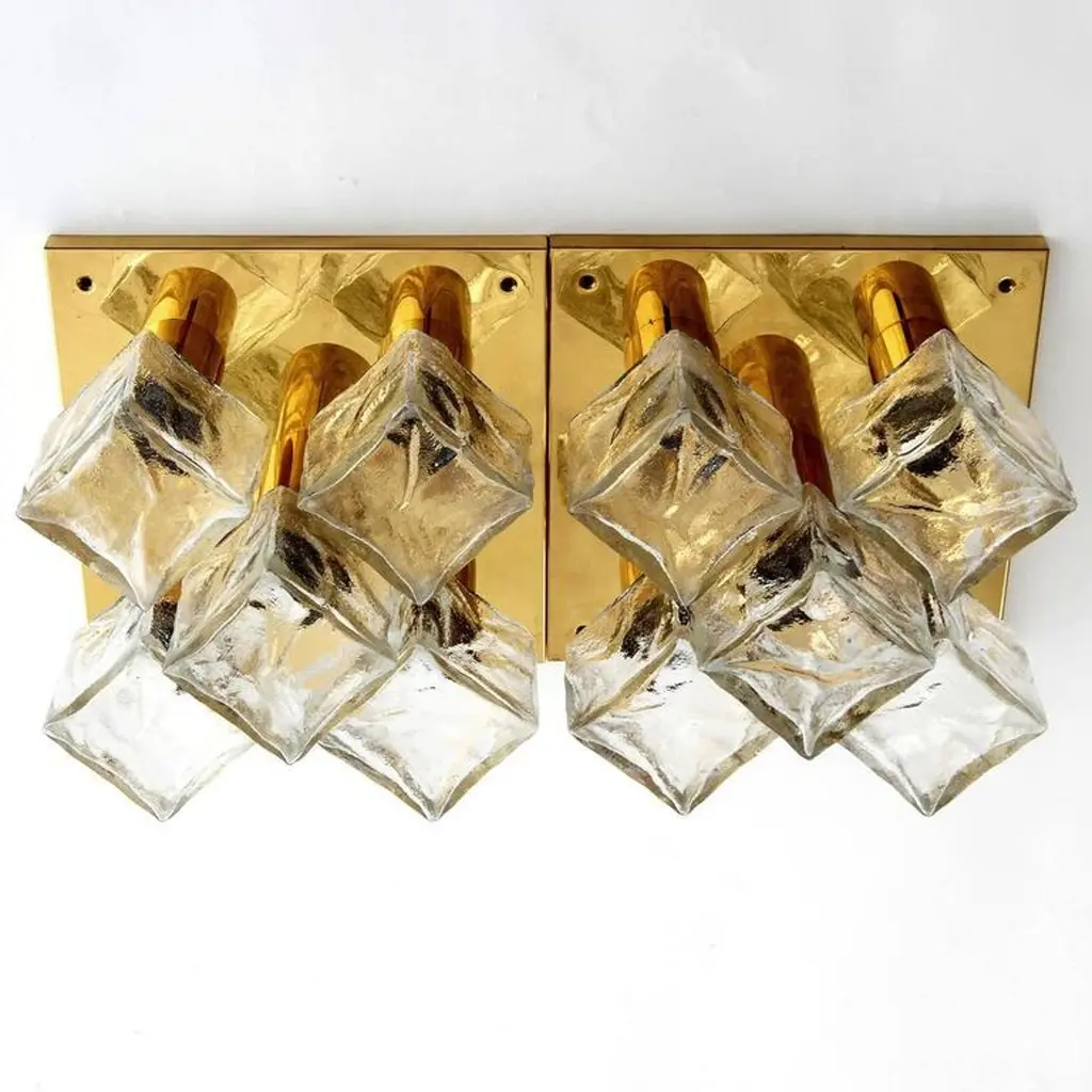 One of two modulare and square light fixtures model 'Cubus' (German 'Würfel') by J.T. Kalmar, Austria, manufactured in midcentury, circa 1970 (end of 1960s and beginning of 1970s).They are made of polished brass and frosted cubic glass lamp shades. Each fixture holds five textured ice glass cubes.They can be used as wall or flush mount lights.Each light has five sockets for small screw base LEDs or bulbs E14 (max. 40W per bulb).It is possible to install this fixture in all countries (US, UK, Europe, Asia, Canada,) although it may be necessary to purchase different light bulbs suitable to local electricity. It also can be used with a dimmer.The price is per lamp. They are sold individually or as pair.In total there are four lights available.The lamps can be grouped and arranged individually to larger light sculptures (please see images).