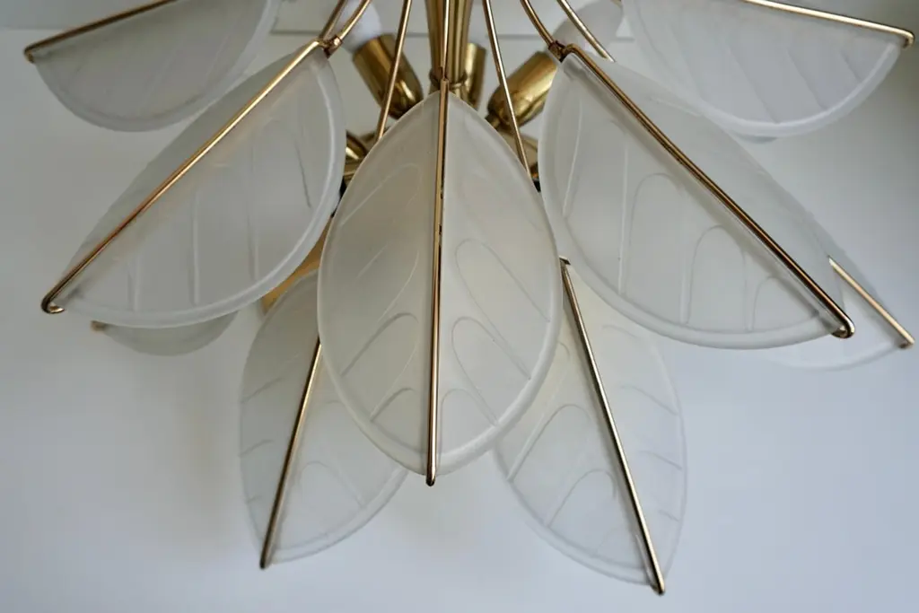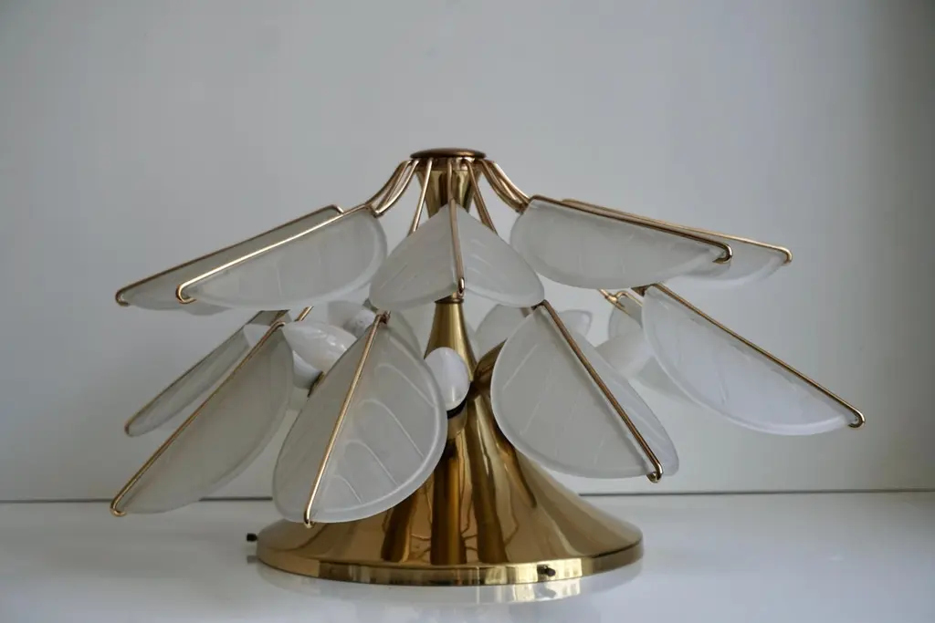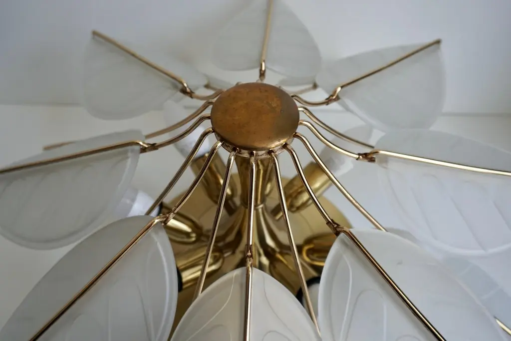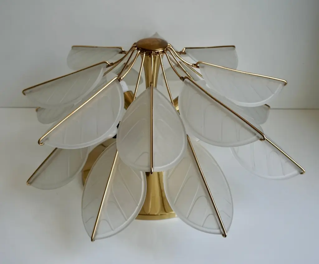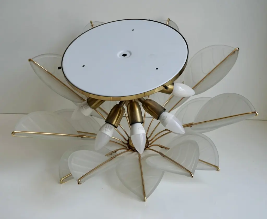 Italian brass flushmount ceiling light In the shape of a star or flower with ribbed Murano glass leaves. Condition: Excellent vintage condition, minor wear consistent with age and use.Dimensions flush mount or wall light;Height: 12.9"Diameter:24"The light requires eight single E14 screw fit lightbulbs (60Watt max.) LED compatible.This ceiling lamp can also be used as a wall lamp.