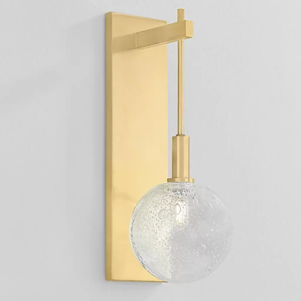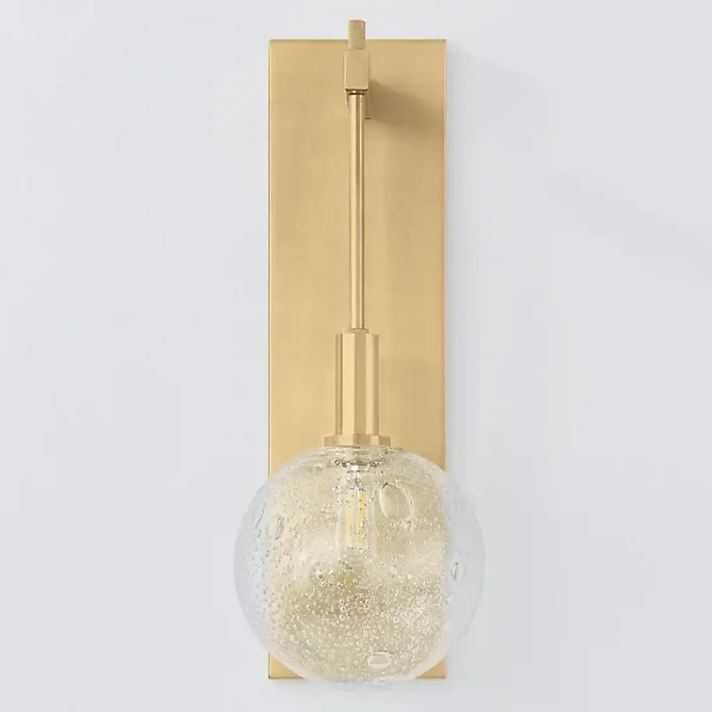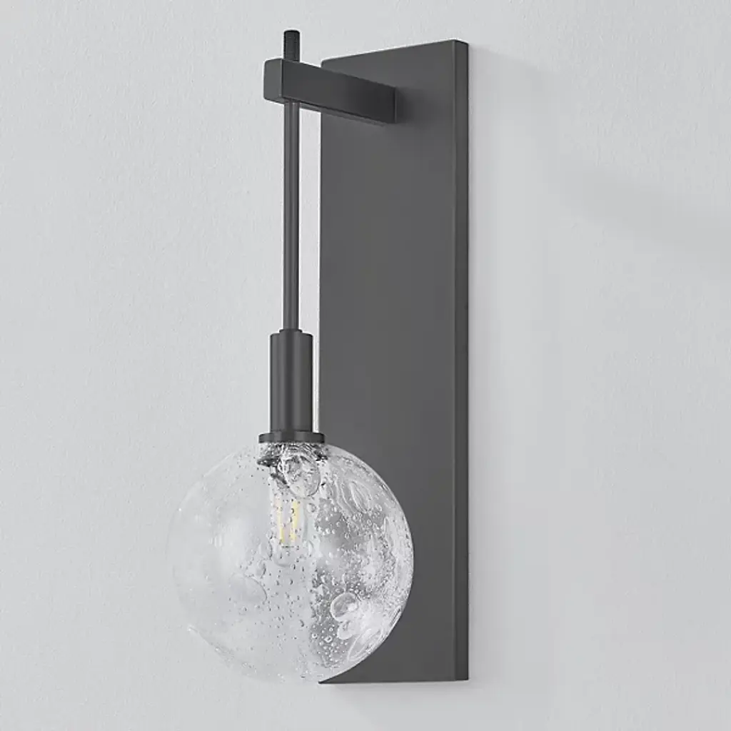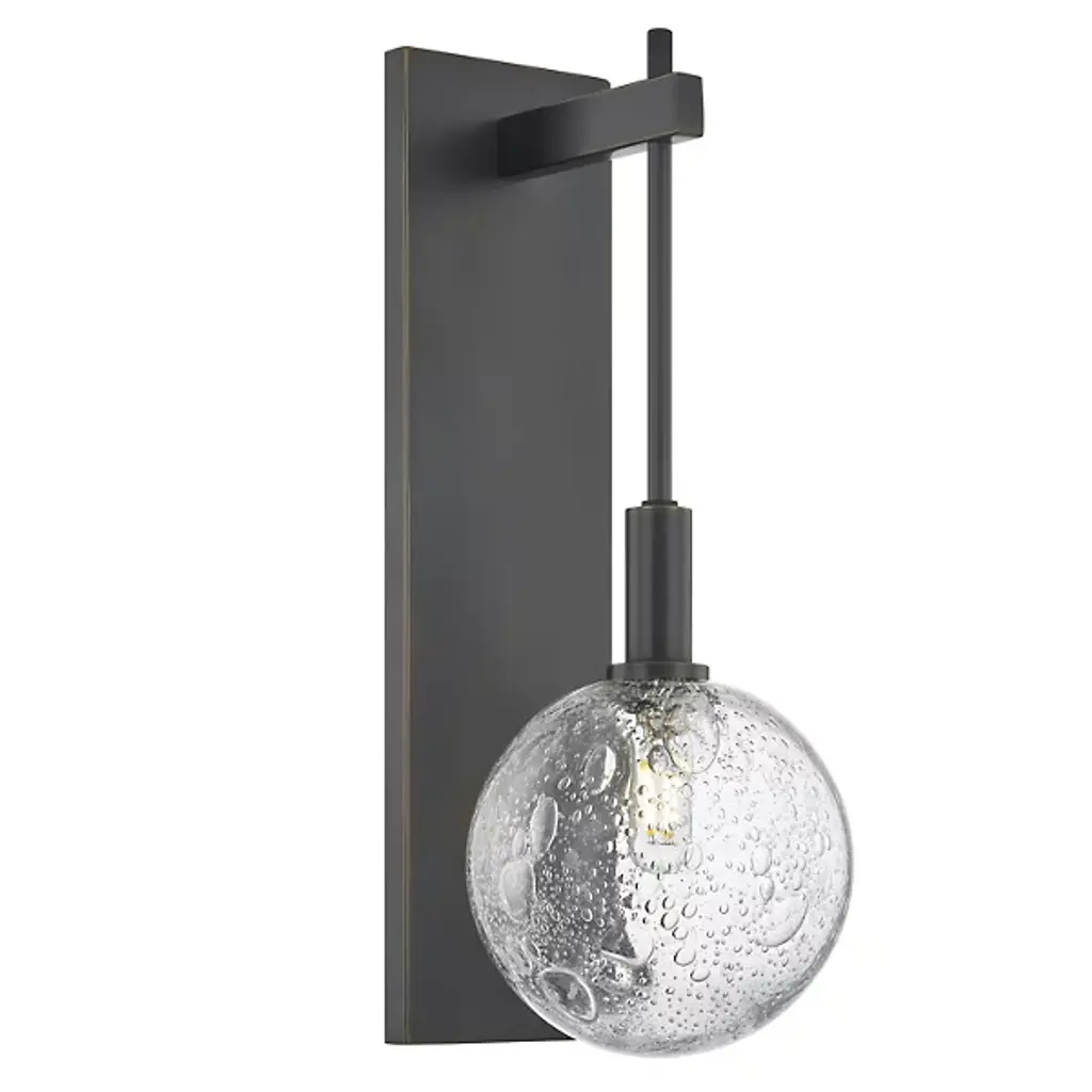The Onteora Wall Sconce from Hudson Valley Lighting takes cues from pendulum clocks of yesteryear. The vertical arrangement emphasizes its long, lean profile, while seed bubbles trapped within the glass sphere offer sparkle and charm. The extended arm positions the light perfectly, complementing the precision of its mechanical inspiration. Rather than merely mimicking timepiece elements, this sconce reinterprets them through a fresh lens. The metalwork provides clean, purposeful support for the decorative glass globe.