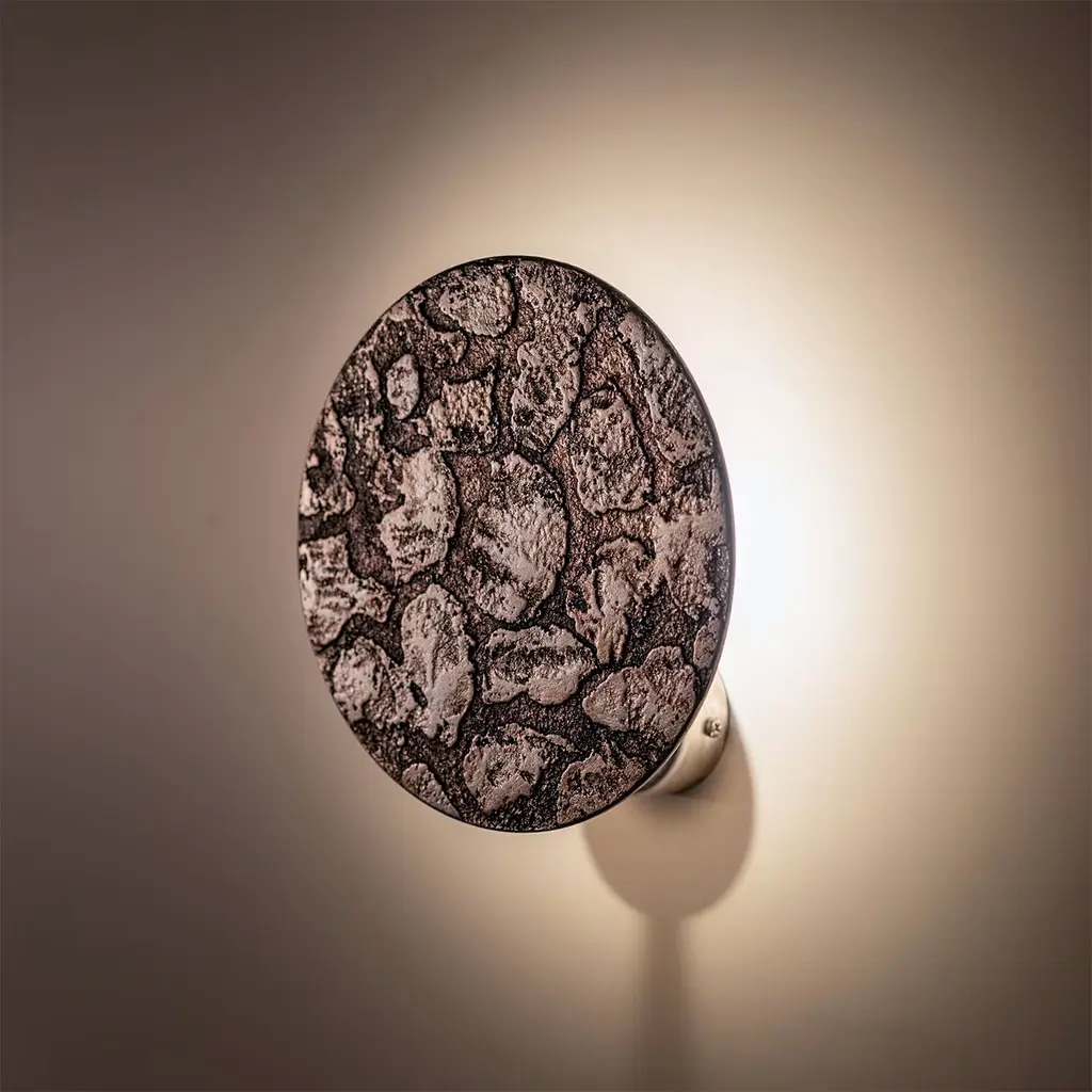 A lighting fixture conceived to impress with its singular artistic impact, this sconce is an ode to the uniqueness of hand-molded textures. Glow is elegantly shaded by a thin bronze disk boasting a rich texture reminiscent of dry soil and indeed evoking sophisticated earthy imagery. Singular and modern, it is best displayed in multiples on hallways' walls or over nightstands. For US electrified version, a disk of the same finish will be applied behind the lamp base to hide the jbox. Please contact the Concierge for more information.