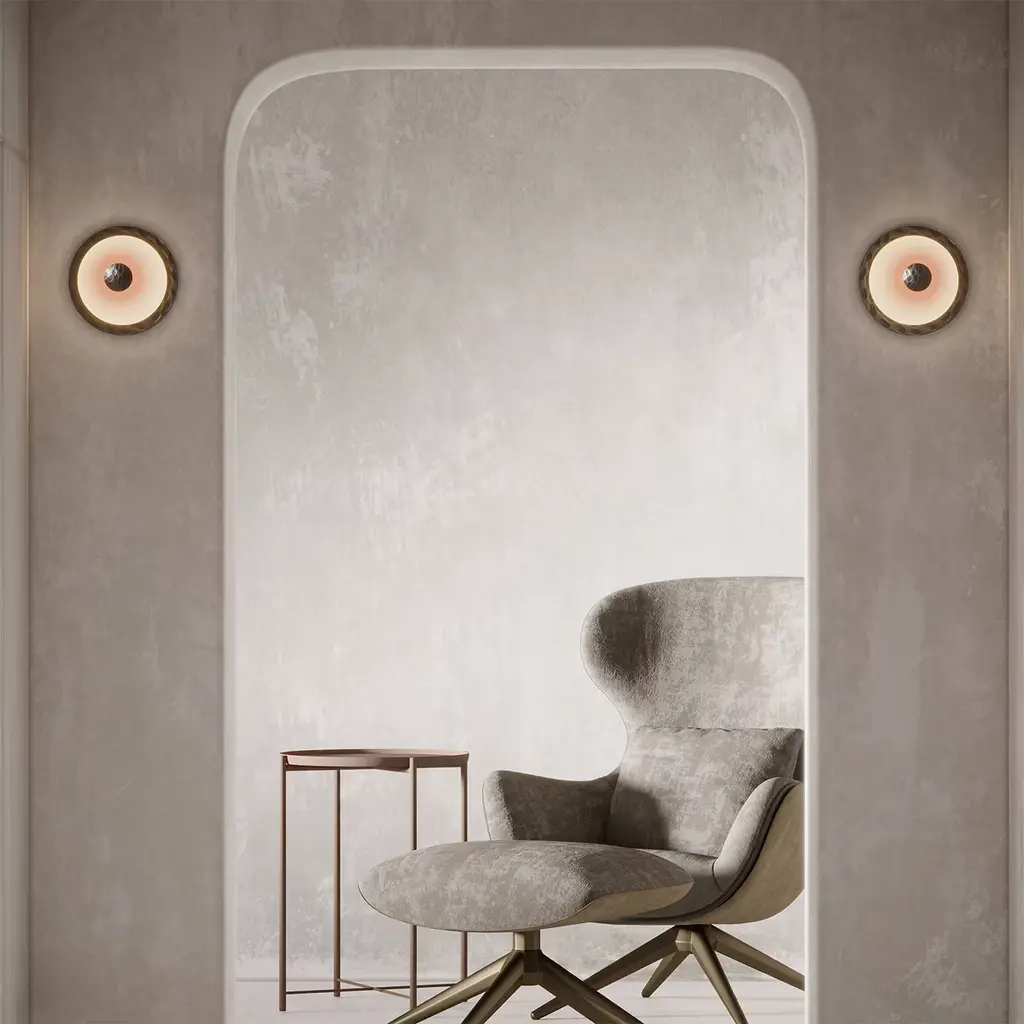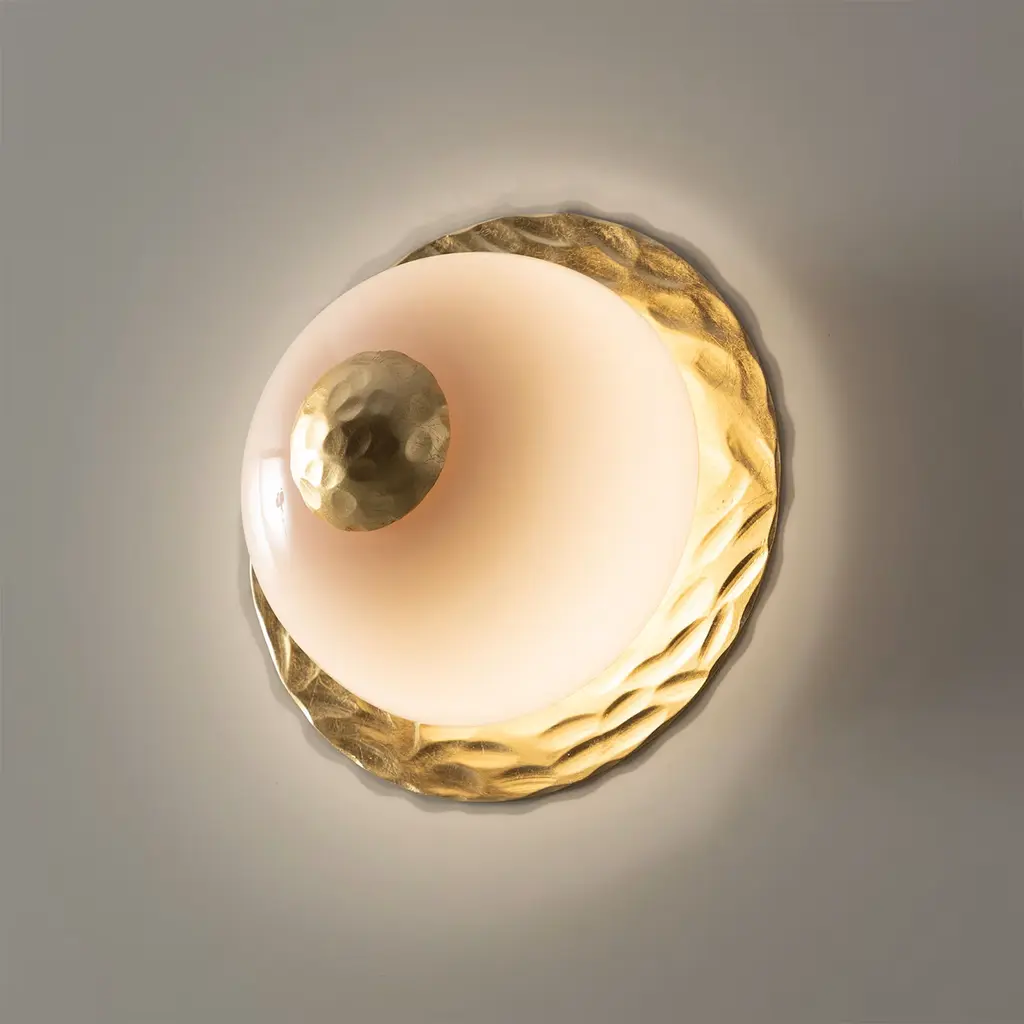 This wall lamp embodies the radiant form of the sun, featuring pink-colored glass that casts a warm and inviting glow. The circular golden frame creates a striking contrast of colors, adding to its visual allure. This Stillux lamp reflects years of artisanal refinement, where meticulous attention to detail and elegance culminate in unique pieces. The artisan's dedication to excellence is evident in every nuanced light that emanates from our creations.