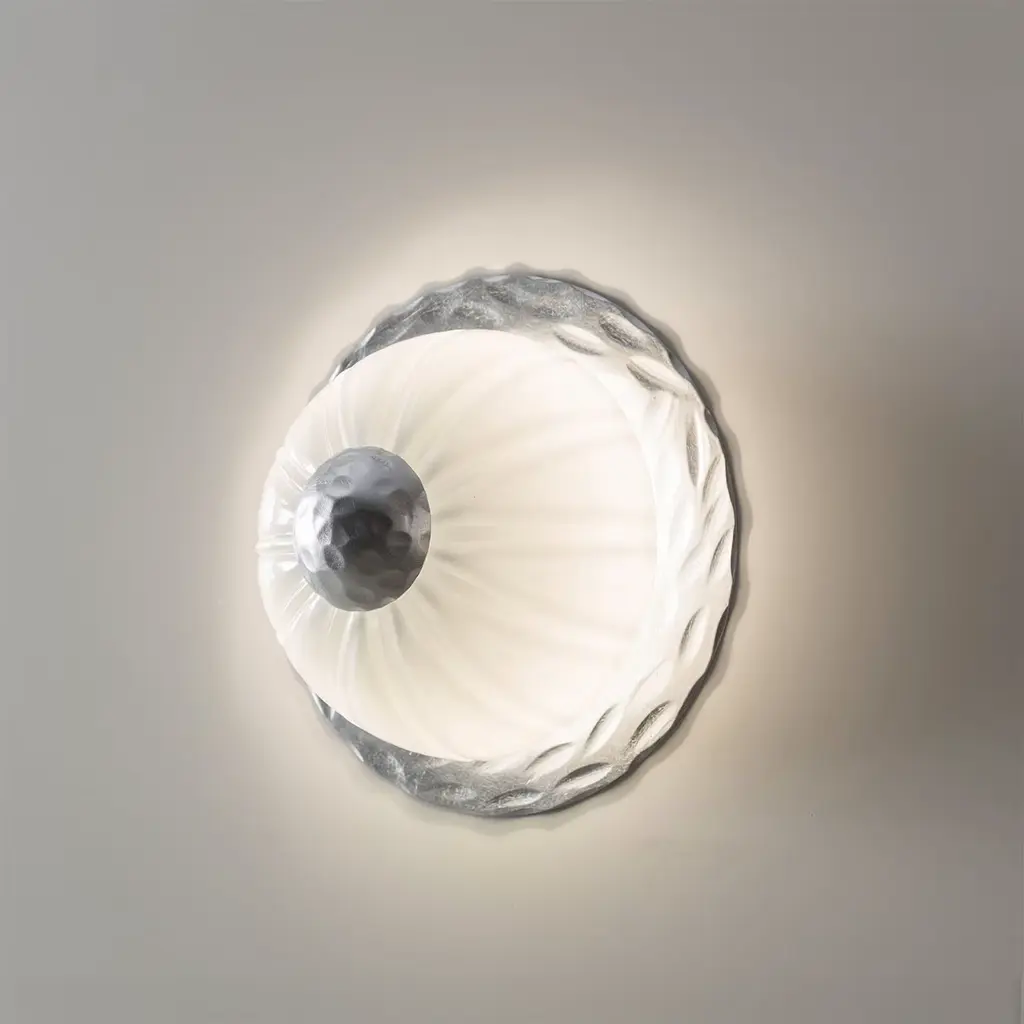 A celebration of radiant elegance, this wall lamp embodies the luminous essence of the sun with opalescent white glass that casts a soft and inviting glow. Its circular metal frame provides a striking contrast, elevating its visual appeal to new heights. Crafted with meticulous artistry and refined elegance, this Stillux masterpiece embodies years of artisanal mastery. The artisan's unwavering commitment to excellence is palpable in every subtle beam of light that emanates from this artwork.