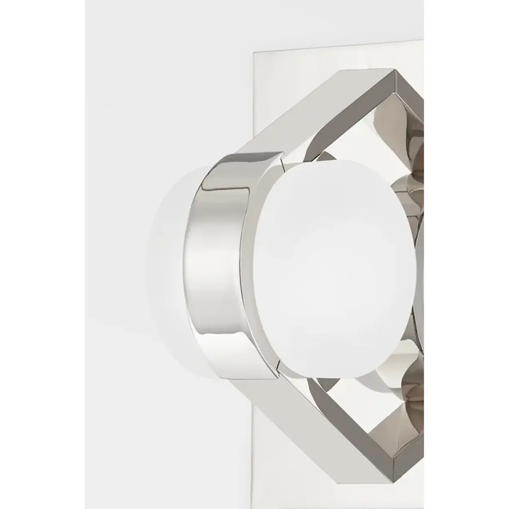 Start a conversation with this statement-making design. A study in shapes, Orbit combines sharp angles with cylindrical shades adding a sense of movement and wonder to any room. Integrated LED lights softly glow from within each opal glass diffuser. The chandelier can be mounted close to the ceiling and the sconce can be mounted horizontally or vertically. Available in a shiny Polished Nickel or a more subdued Aged Brass finish.