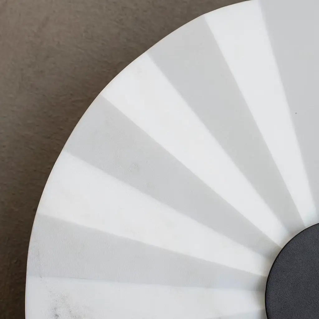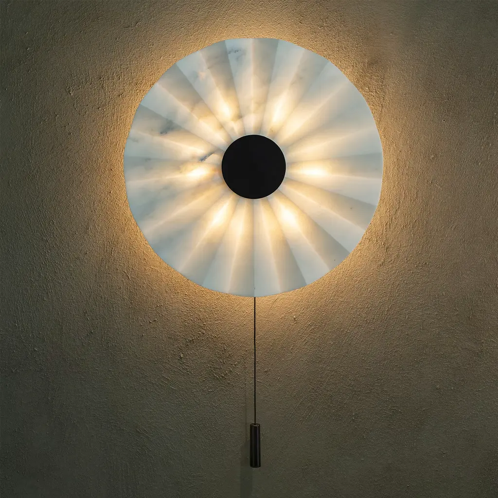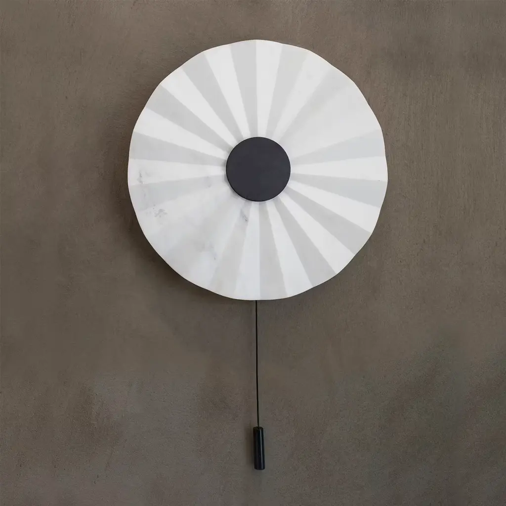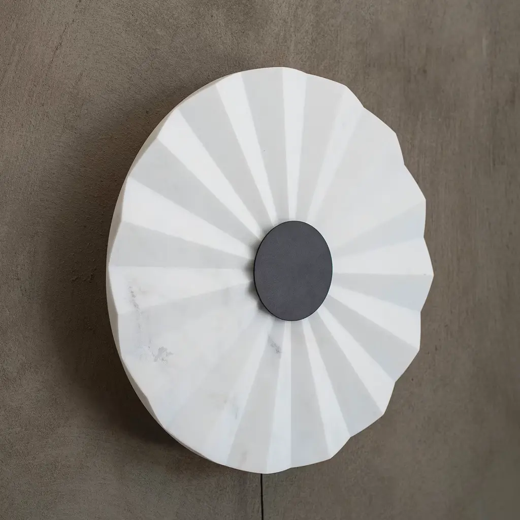 A tribute to the Japanese art of folding paper to create dainty paper figurines, this superb wall lamp employs white marble for its ultra-thin, folded diffuser resembling an exquisite origami design. The light filters through the marble for an enchanting ambiance, but the lamp does not lose its charm even when the light is off. Also offered in a larger variant, please check pricing with the Concierge.