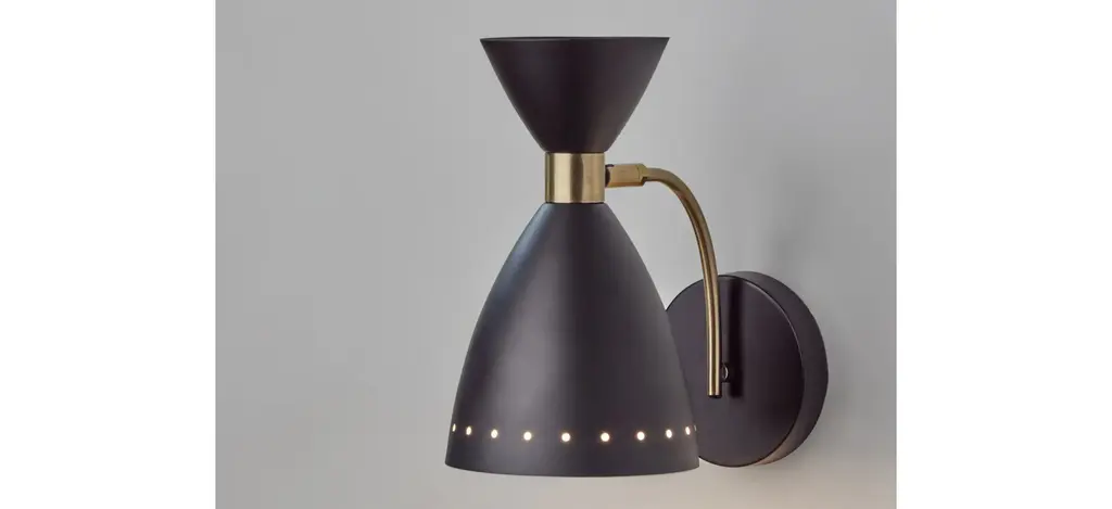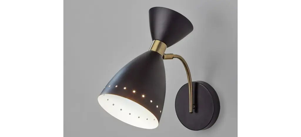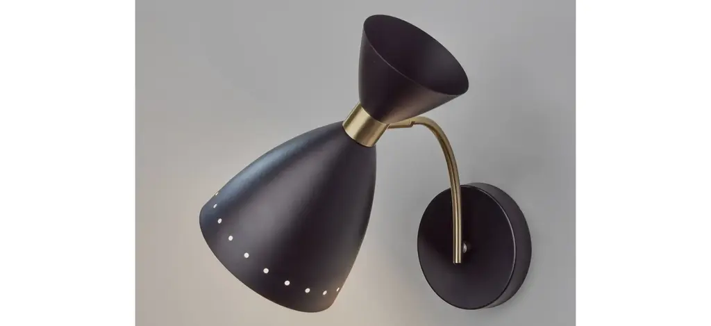 The Oscar wall light brings a mid-century modern look and finish to your space. The lamp features a 5" diameter painted metal base supporting an upwardly arcing antique brass stem. The black metal cone-shaped shade is ringed with holes to add unique lighting patterns. While the brass stem is fixed, the base of the shade features an articulation point, allowing you to rotate the shade up or down and side to side to direct the light wherever it's needed. The wall lamp powers a 40W bulb or is compatible with dimmable LED bulbs for added versatility.