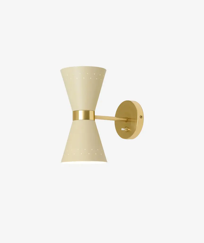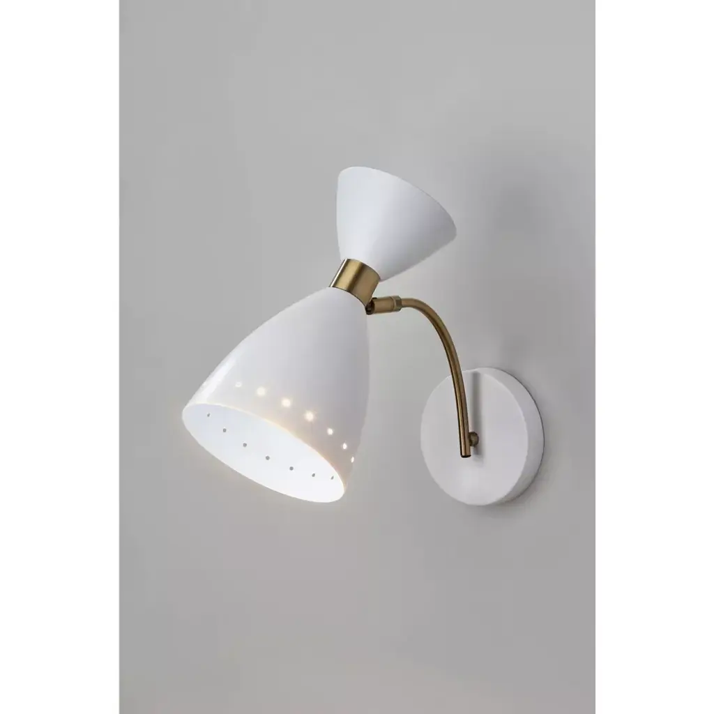 Combining monochromatic white metal construction and antique brass accents, the Oscar wall light brings a mid-century modern look and finish to your space. For symmetrical design, pair two of these sconces on either side of beds, fireplaces, or mirrors or place individually in entryways or other spaces for a pop of light. The lamp features a 5" diameter painted metal base supporting an upwardly arcing antique brass stem. The white metal cone-shaped shade is ringed with holes to add unique lighting patterns to your room. While the brass stem is fixed, the base of the shade features an articulation point, allowing you to rotate the shade up or down and side to side to direct the light wherever it's needed. The wall lamp powers a 40W bulb or is compatible with dimmable LED bulbs for added versatility. For a contrasting color scheme, the Oscar wall lamp is also available with a black metal finish and antique brass accents.