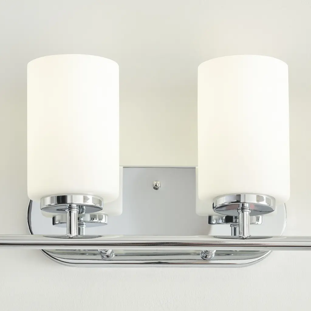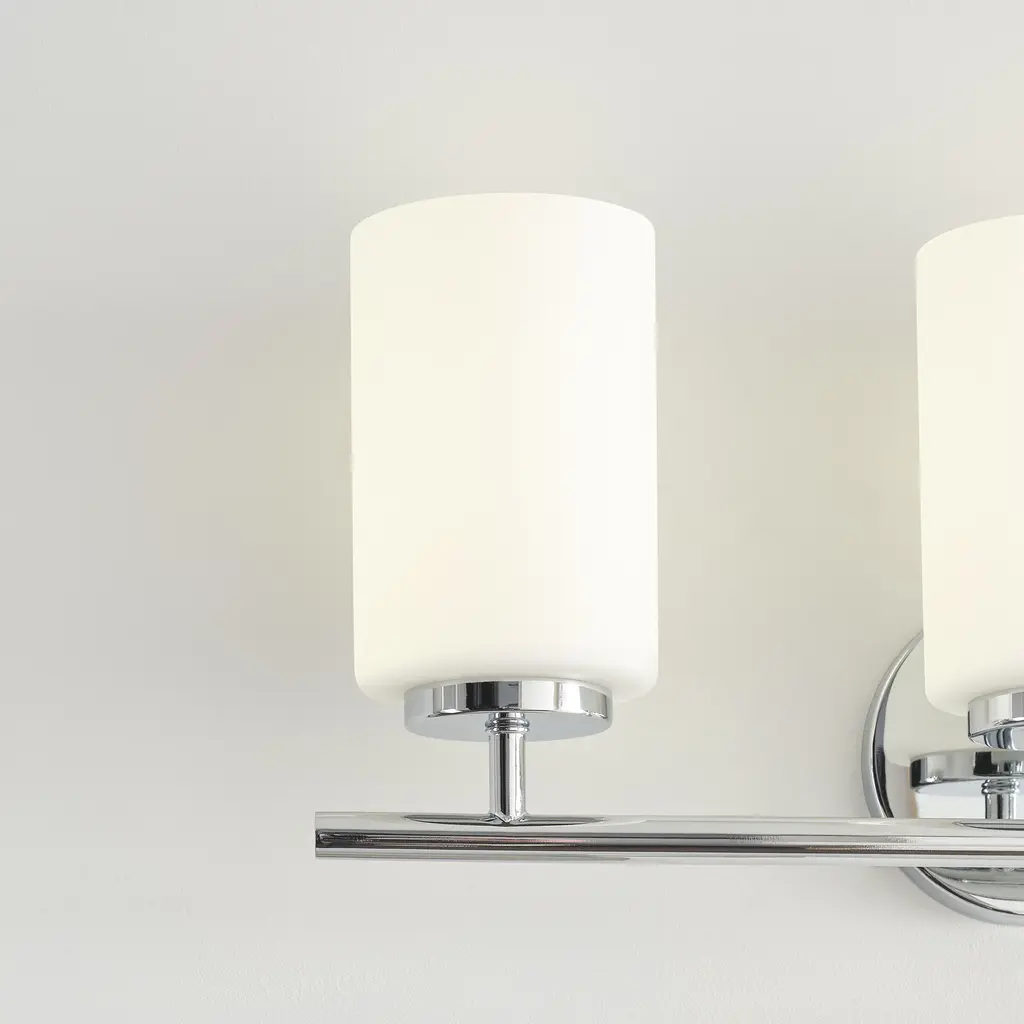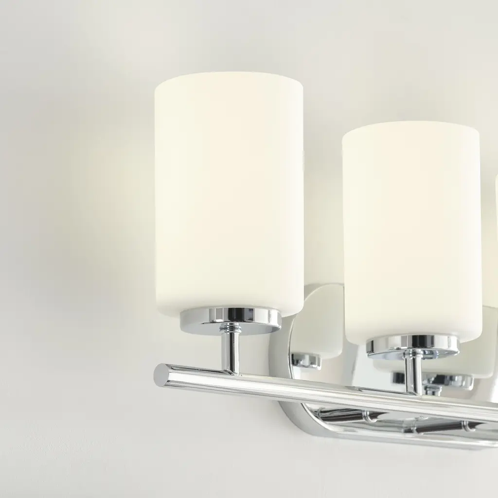 The Oslo four light vanity fixture in chrome provides abundant light for your bath vanity, while adding a layer of today's style to your interior design. The Oslo lighting collection by is a sleek design, with smooth and clean lines. The Opal Etched glass adds to this collection's contemporary and minimalist character. Offered in Chrome, Brushed Nickel, Burnt Sienna and textured Blacksmith finishes, the collection includes nine-, five-, and three-light chandeliers, pendants in four sizes, both flush and semi-flush ceiling fixtures, as well as one-, two-, three- and four-light wall/bath fixtures. Both incandescent lamping and ENERGY STAR-qualified LED lamping are available. All fixtures are California Title 24 compliant.