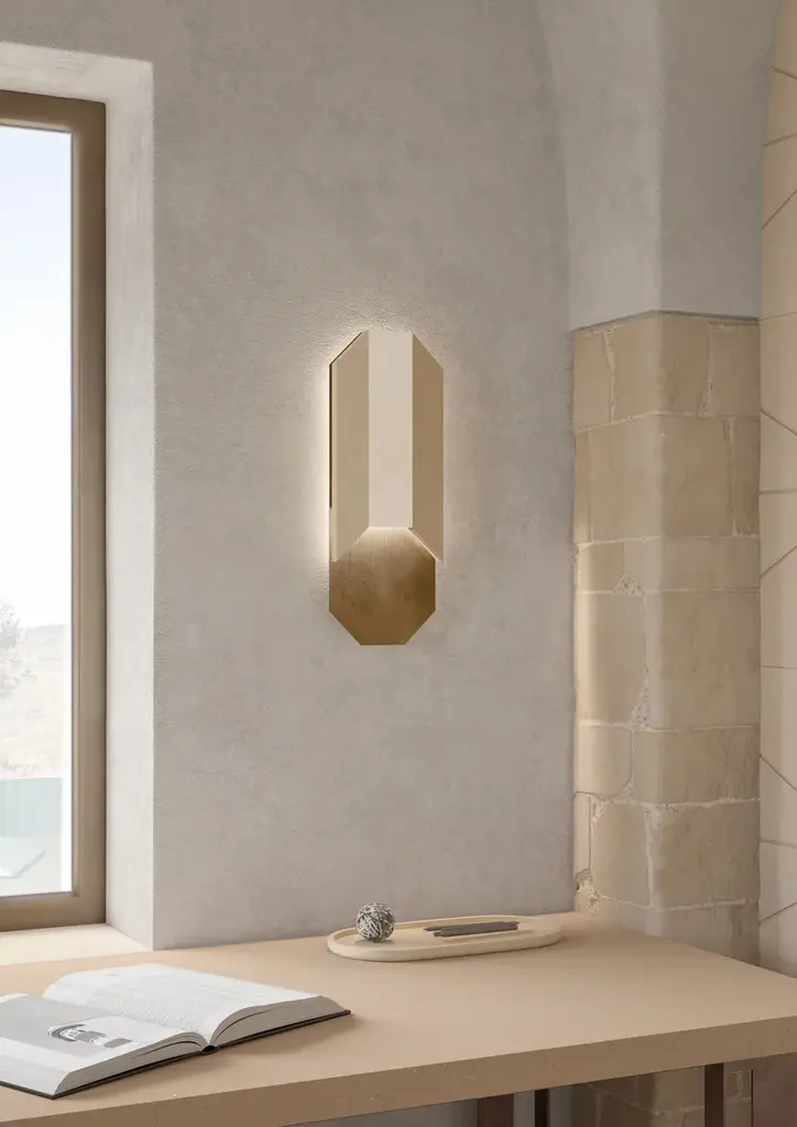 Ottagono is a wall lamp that pays homage to Apulian architecture and territory, with optical effects punctuated by the colours of Pimar stone. A material dialogue between stone and burnished brass.Dialogues between materials, between man and nature, between nature and architecture, spatiotemporal dialogues; territorial identity, nature and architecture, at the basis of Pimar's narration and through a design path defined by an open gallery, a reference to architecture, to the portico, to the peristyle of the Roman house, as vestiges immersed in luxuriant nature. The Dialoghi Materici collection conceived by the AposPersano duo, becomes a sort of perceptive experience, a layered reading between minimal, almost primordial signs, references to art, optical, the result of a continuation of research into visual perception. Stone in its essentiality lends itself to multiple uses, from architecture to design. The new products, designed by AposPersano for Pimar, have essential sculptural forms with geometric rigour, punctuated by material colours in shades of white, beige and grey and marked by striped or smooth and silky textures, where the stone material is in dialogue with new materials.