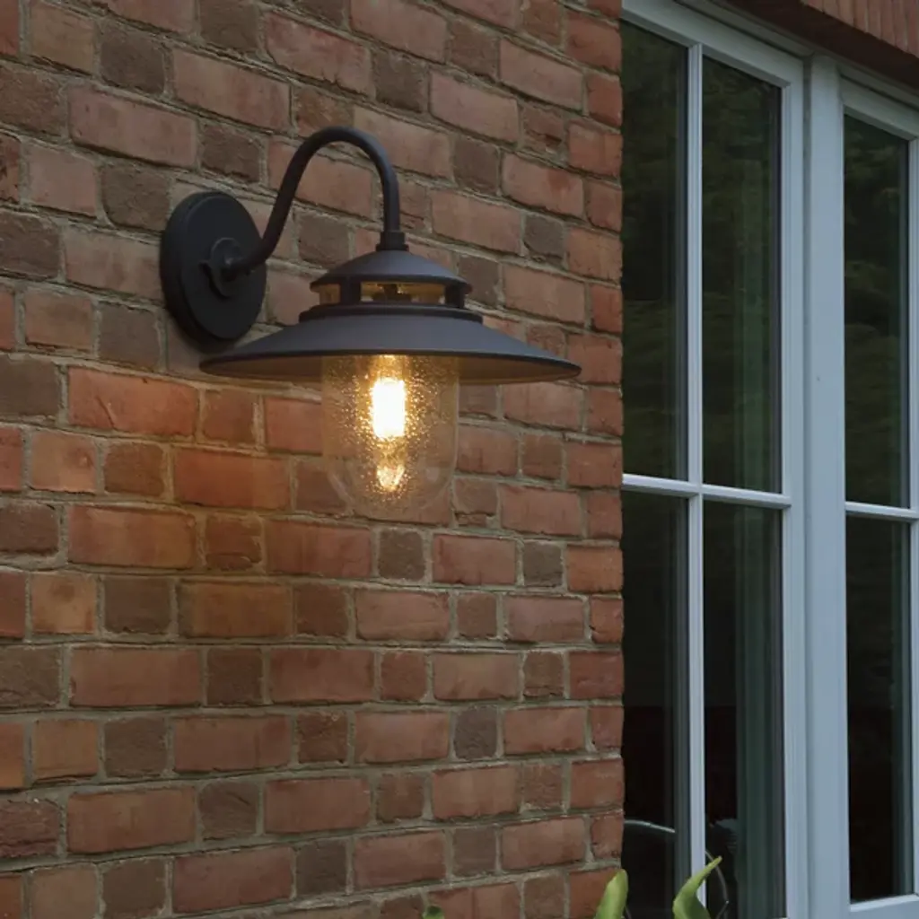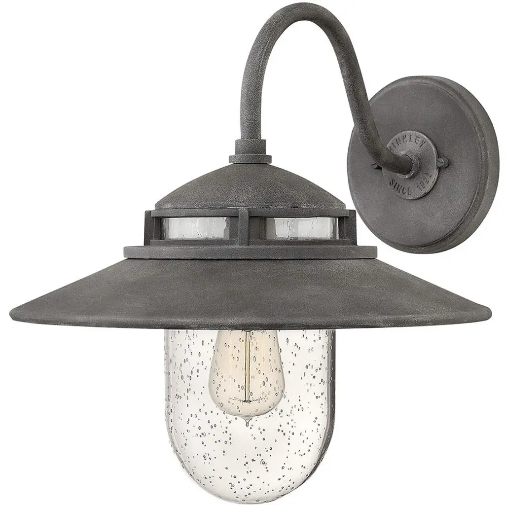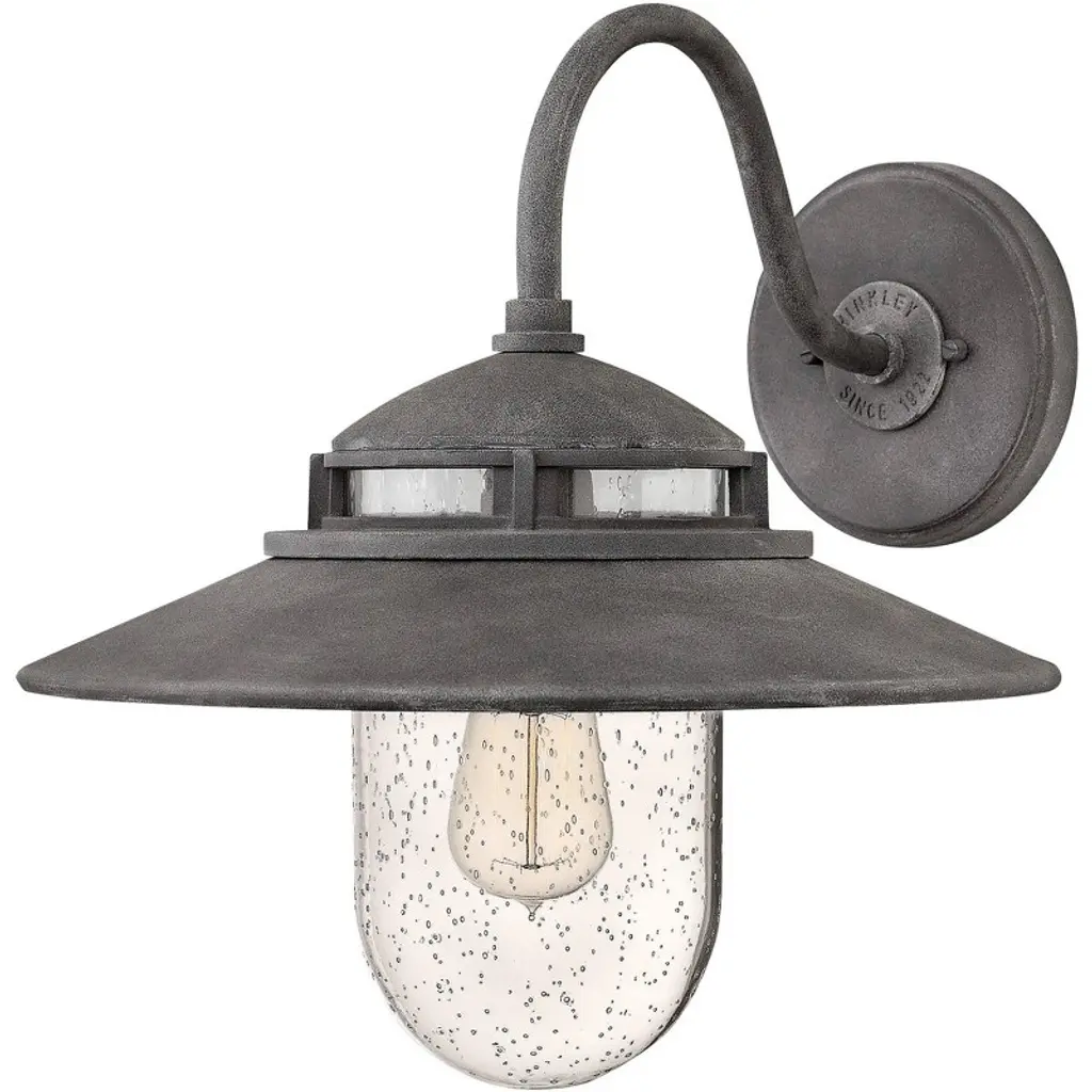 The Hinkley Lighting Atwell Outdoor Wall Sconce is a classic piece honoring the timeless Restoration aesthetic. A sloping rod hosts a clear seeded glass shade, topped with a broad aluminum shade. Inside the glass shade the antique reproduction bulb remains visible, contributing to the signature style.