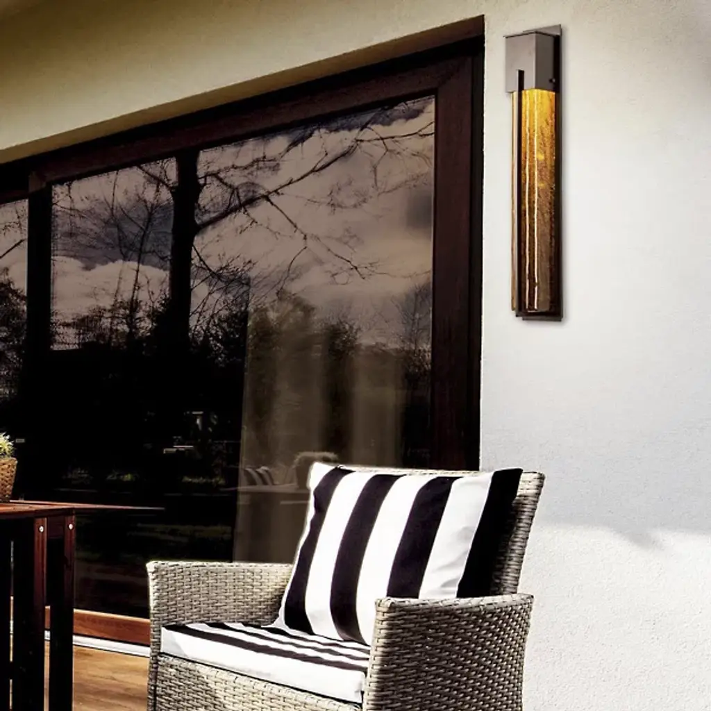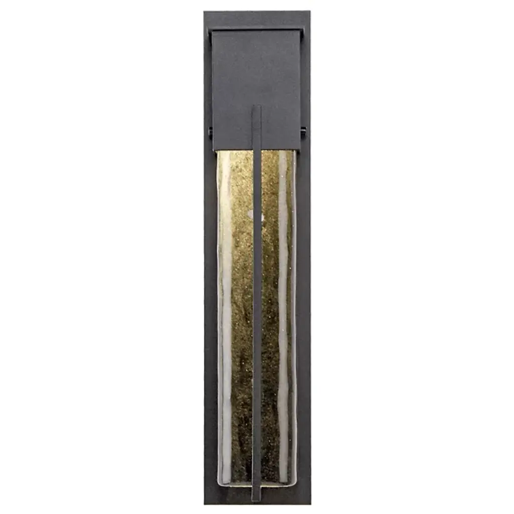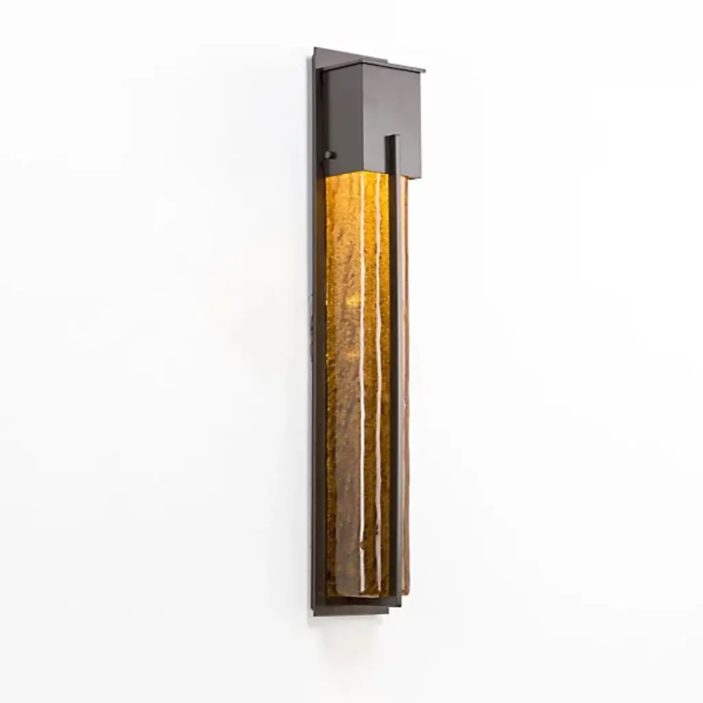 Light your way during dim mornings and dark nights with the tastefully-textured lines of the Outdoor Wall Sconce from Hammerton Studio. A metal rectangular wall mount set vertically holds out an angular housing from its upper end, set around wet-rated lamping, capped in turn with a rounded glass diffuser that’s been hand-textured and kiln-fused. The diffuser’s curved surfaces provide excellent visual contrast with the sharp-cornered metal frames, offering a more natural note to a fixture with a clean-surfaced sculptural style.