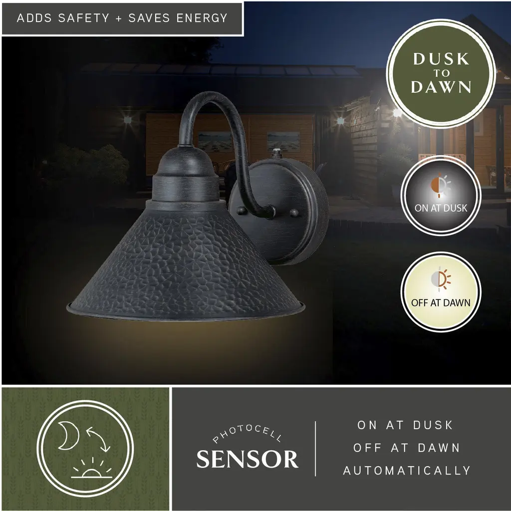 Designed with stately, yet rustic sophistication, the Outland collection is a solid choice for your outdoor space. The finish gives this barn light a warm and inviting elegance, and the finish inside the shade adds to the charm. This fixture is dark-sky compliant and will complement any industrial, cottage, modern country, or farmhouse style home. Dusk to dawn photo cell automatically turns fixture on in the dark and off in the light for added safety and security, saving energy during daylight hours. This outdoor wall light is ideal for your porch, entryway, garage, or any other area of your home.