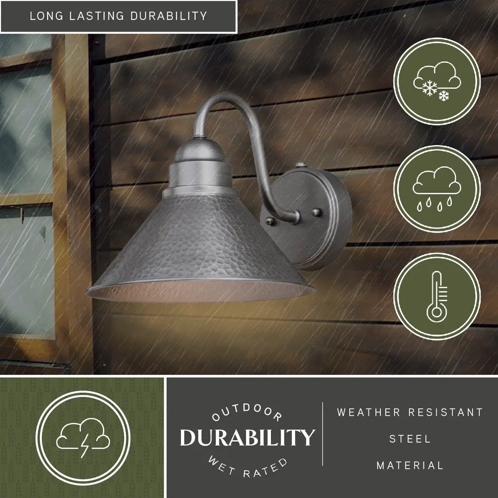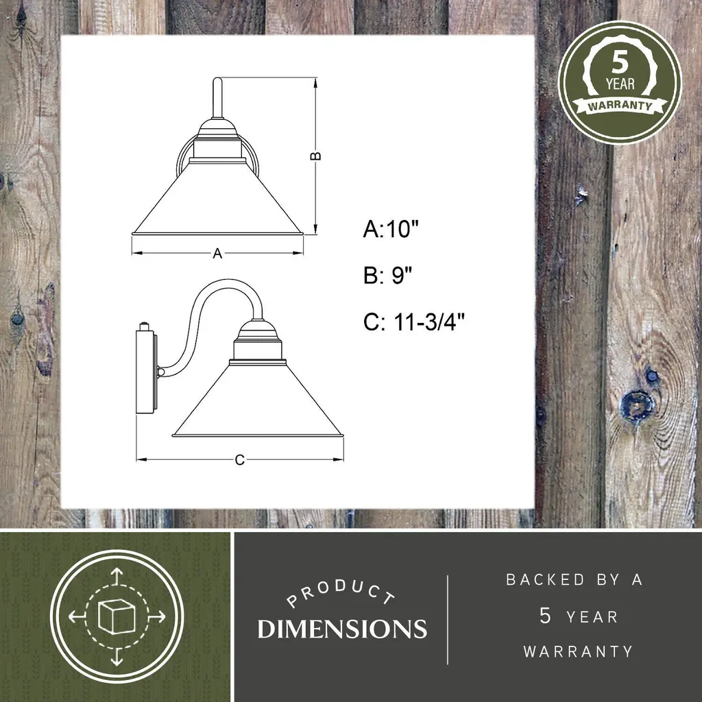 Designed with stately, yet rustic sophistication, the Outland collection is a solid choice for your outdoor space. The finish gives this barn light a warm and inviting elegance, and the finish inside the shade adds to the charm. This fixture is dark-sky compliant and will complement any industrial, cottage, modern country, or farmhouse style home. Dusk to dawn photo cell automatically turns fixture on in the dark and off in the light for added safety and security, saving energy during daylight hours. This outdoor wall light is ideal for your porch, entryway, garage, or any other area of your home.