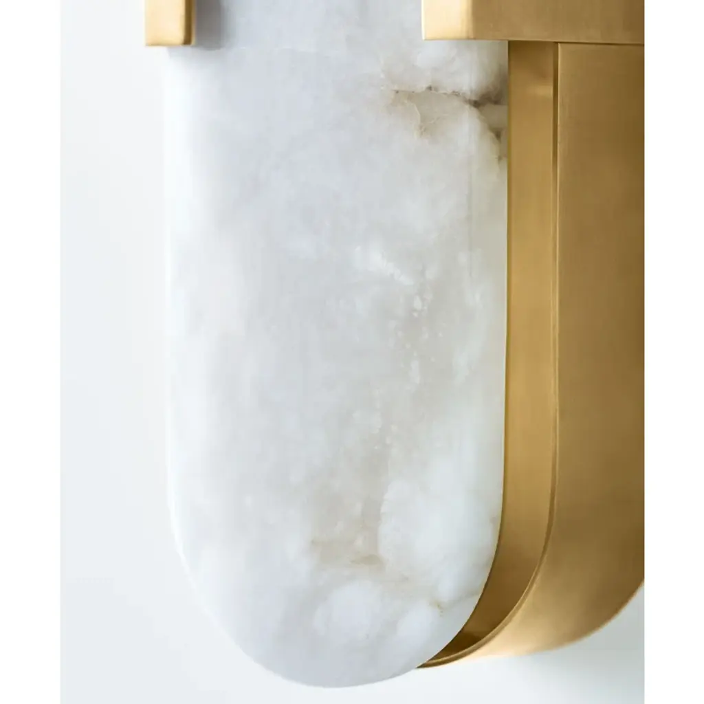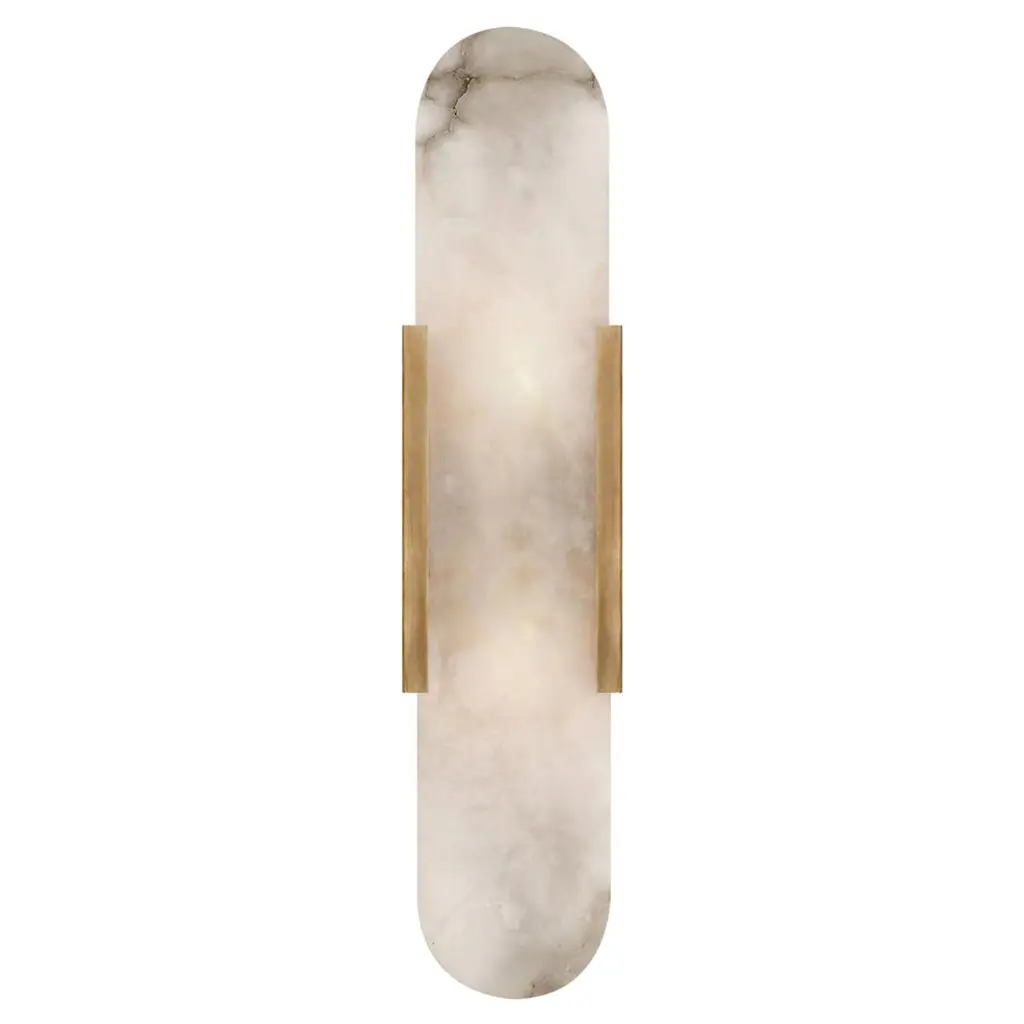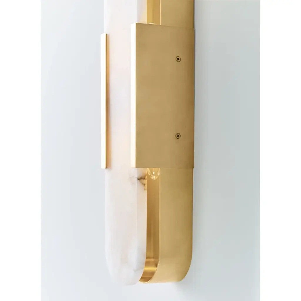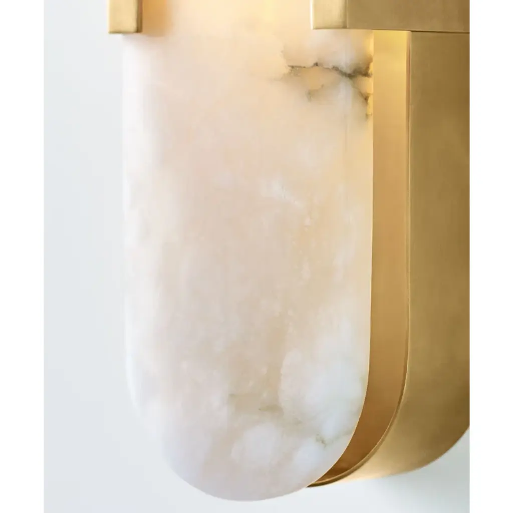 The incredibly unique design of this sconce takes inspiration from a pearl, sling-shaped pendant necklace. The teardrop silhouette is crafted from antique brass iron that showcases an opal glass globe, which sits in the frame. A matching glass and antique brass iron backplate with an opal glass accent create cohesiveness throughout. Consider multiples for a more dramatic lightscape. Damp-rated, although limited covered outdoor areas may affect the finish.