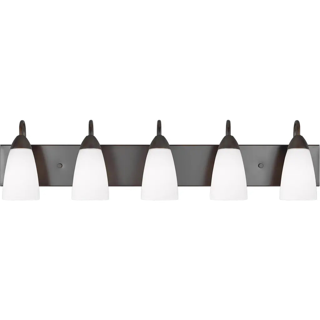 Transform your space with the sleek Oxbridge 5-Light Bath Bar. Installation is a breeze - simply connect it to a 120 volt power supply and enjoy. Achieve the perfect ambiance with its dimmable lighting feature (dimmer not included). This energy-efficient light is LED compatible, adding convenience to your lighting choices. Suitable for use with standard medium base bulbs, enjoy easy and seamless set up. Cleaning is a breeze, just use a damp cloth and do not use chemical cleaners. With its streamlined hardwired design, rest assured that this product is made to last. It''s suitable for damp locations and boasts a durable glass shade that ensures even light diffusion. Explore the range of finish, color, and glass size options to find the perfect match for your space.Features:• Easy to install and use with 120 volt power supply• Create the perfect ambiance with dimmable lighting (dimmer not included)• Energy-efficient and LED compatible for long-lasting illumination• Versatile lighting options with compatibility for standard medium base bulbs• Easily maintain cleanliness with a damp cloth, do not use chemical cleaners• Streamlined installation and seamless integration with hardwired design• Safely rated for damp location useDimensions:Bath Bar Light• Assembled Product: 46.5 inches wide x 6.5 inches deep x 10 inches high• Shade Width: 4 inchesRequirements:• Bulb Base: E26• Bulb Type: LED Bulb, IncandescentFor over 40 years, Toltec Lighting has been dedicated to creating extraordinary lighting experiences for our customers. Our extensive online catalogue showcases a diverse range of contemporary and timeless collections, offering over 40 glass shade choices to personalize each fixture to your unique taste. Whether you seek traditional, transitional, or contemporary styles, our fixtures effortlessly complement any decor. With an unwavering commitment to quality, value, and exceptional service, we prioritize your satisfaction by ensuring hassle-free transactions. Toltec Lighting stands proudly as a beacon of reliability and brilliance, and we look forward to illuminating your home for years to come.