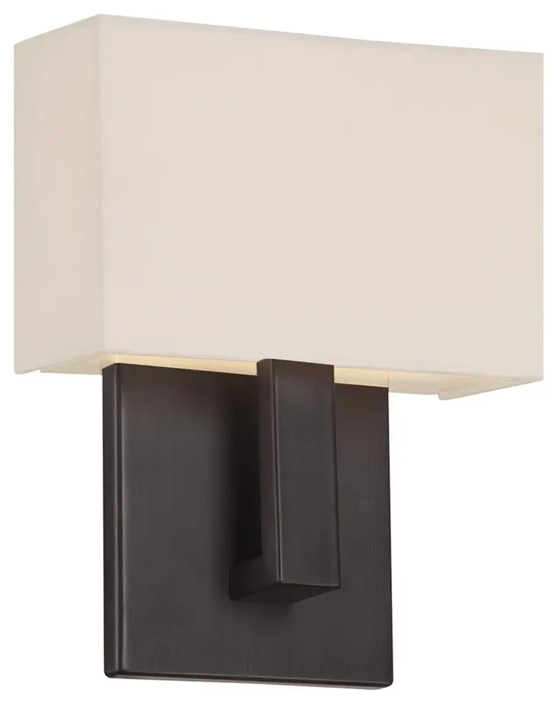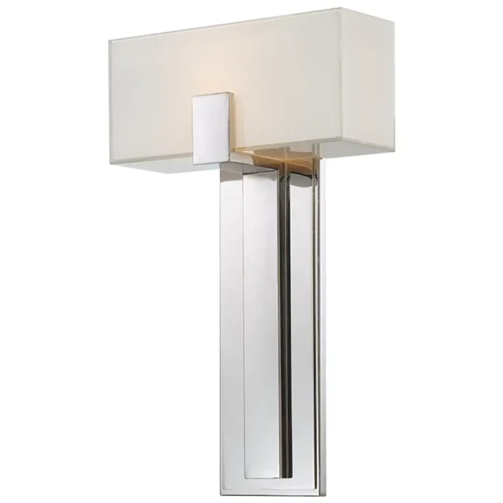 A sharp, understated fixture for modern spaces. The George Kovacs P1704 Wall Sconce features a miter-edged glass shade with a light-diffusing White interior. This horizontal rectangle is supported by a vertical one, a lengthy metal base in either a Polished Nickel or Copper Bronze Patina finish. ADA compliant.