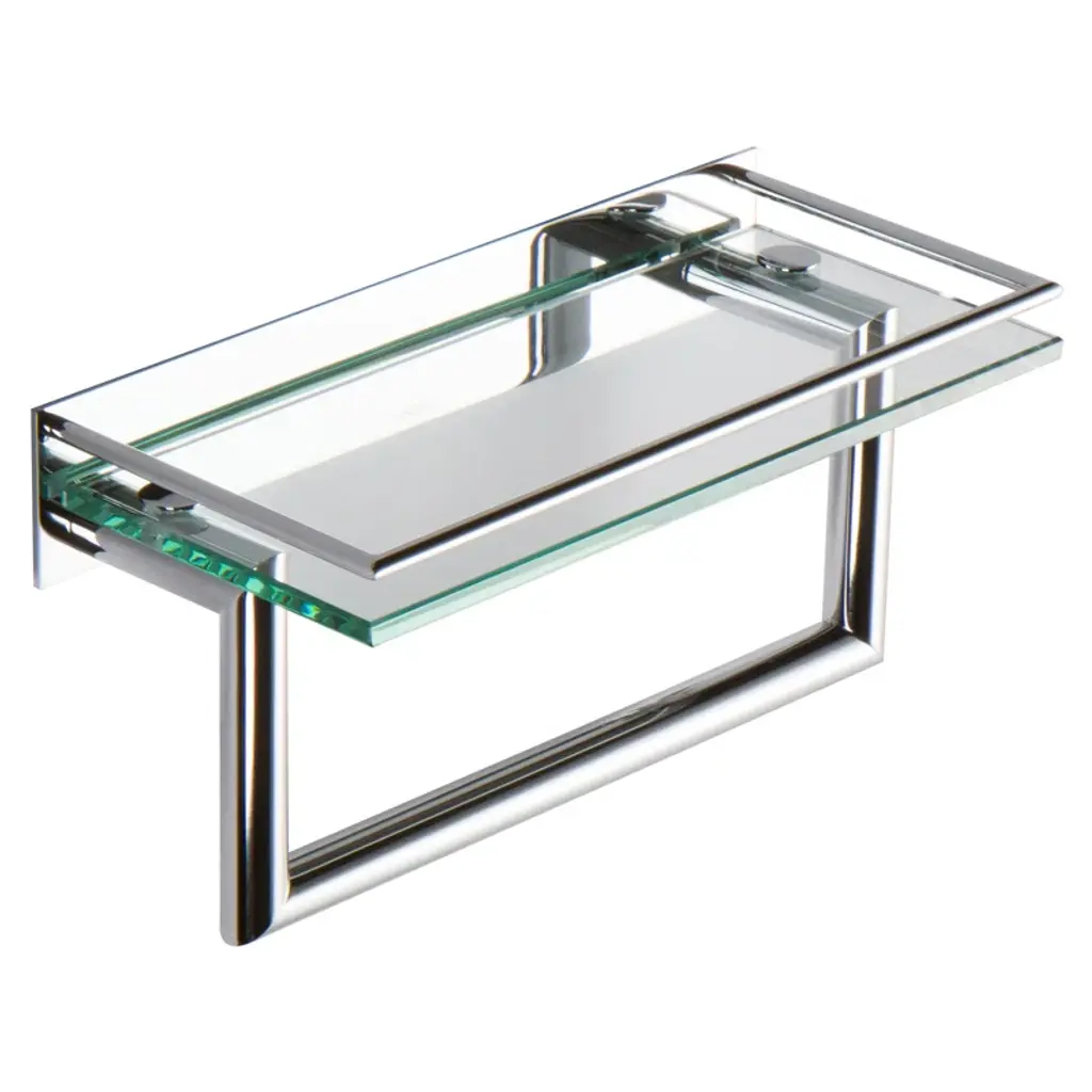 Make a design statement in your bathroom with this elegant and functional shelf unit. Its classic design with acrylic accents will compliment your decor as you add space and organization to your bathroom. Featuring beveled-edged glass this shelf is crafted for durability, strength and style. Made from solid brass this decorative shelf will provide a lifetime of use.Brushed Bronze, a satin-like texture, metallic dark golden finishCrafted from the finest solid brass materialsConcealed screw mounting hardware installs easilyTwo shelves for extra storage spaceAcrylic components subtly accentuate this elegant designContemporary design with traditional design elementsProvided with a Limited lifetime warranty