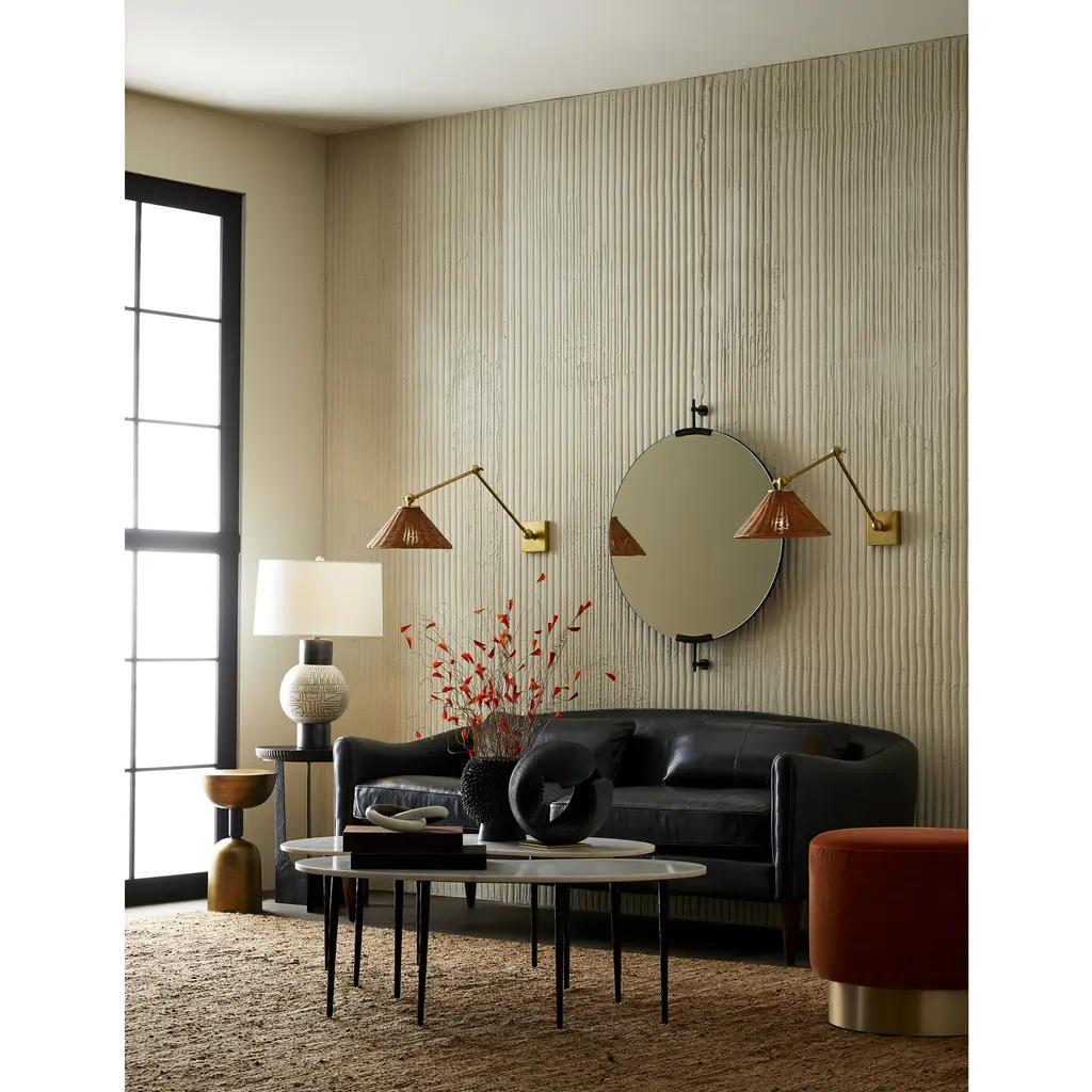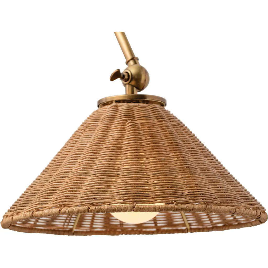 Our versatile articulating wall light dons a woven wicker shade for a fun textural mix. Finished in antique brass it's useful as a reading lamp picture light or as accent lighting over bookcases.