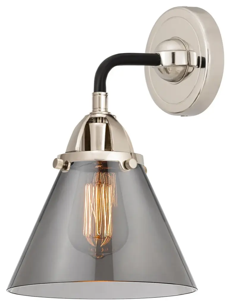 The contrast between the gleaming metal hardware and the painted exterior of the metal shade brings contemporary flair to this retro-chic sconce. Because the sconce is damp rated, you can use it in your bathroom as well as beside your bed, in an entryway, or just about anywhere else in your home.