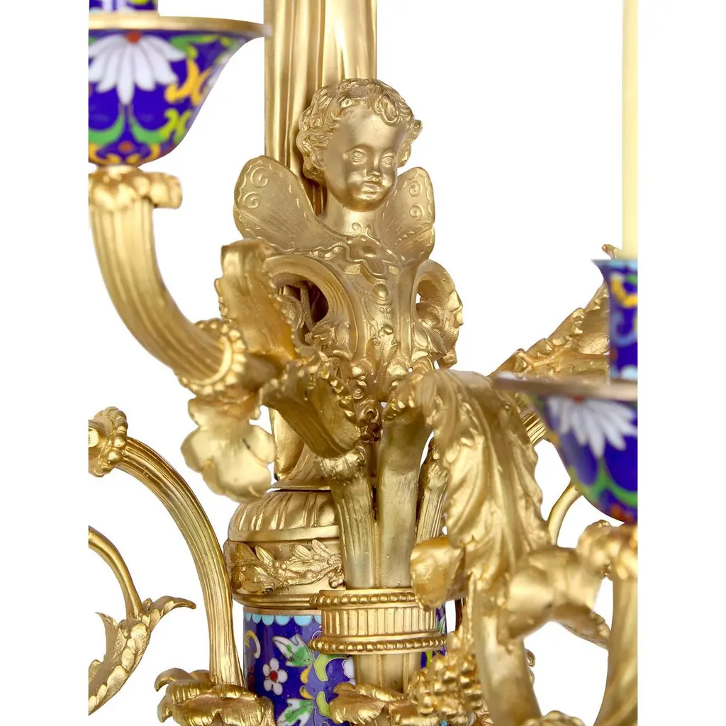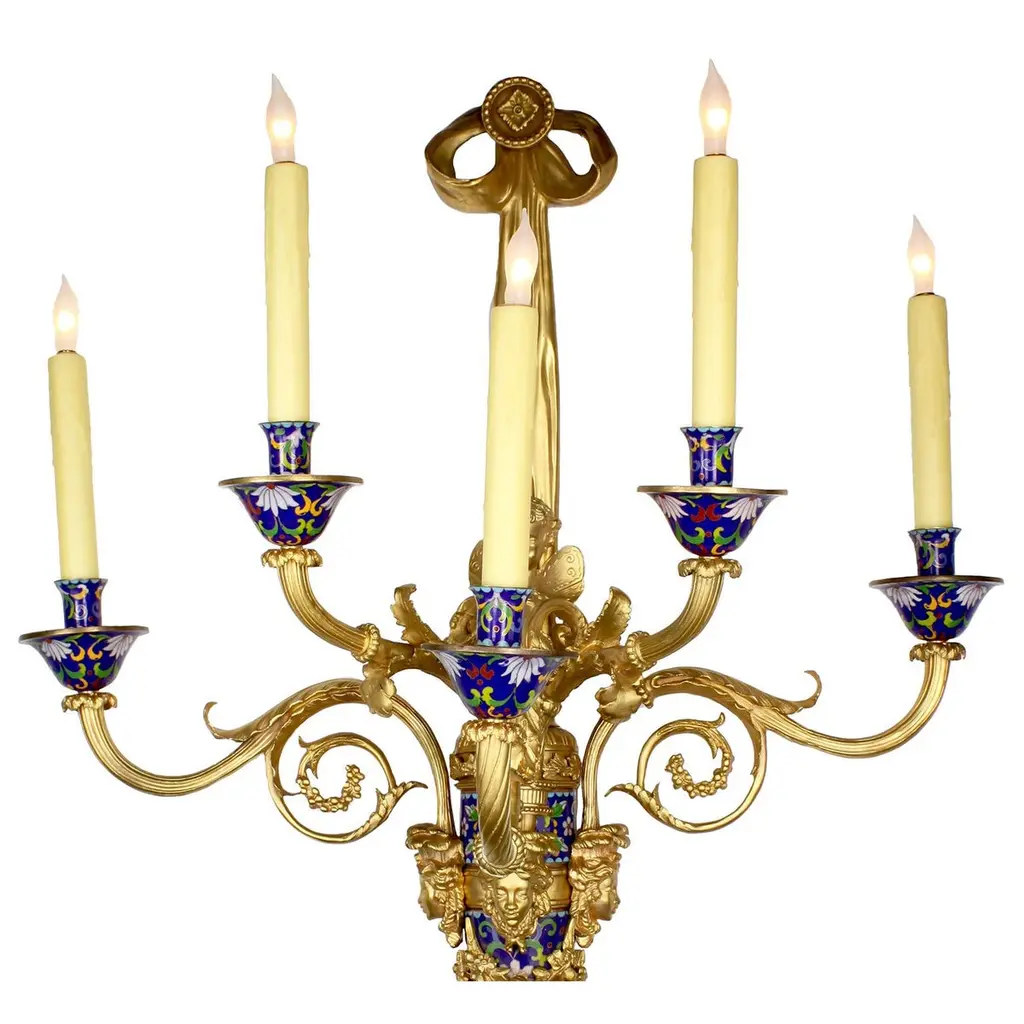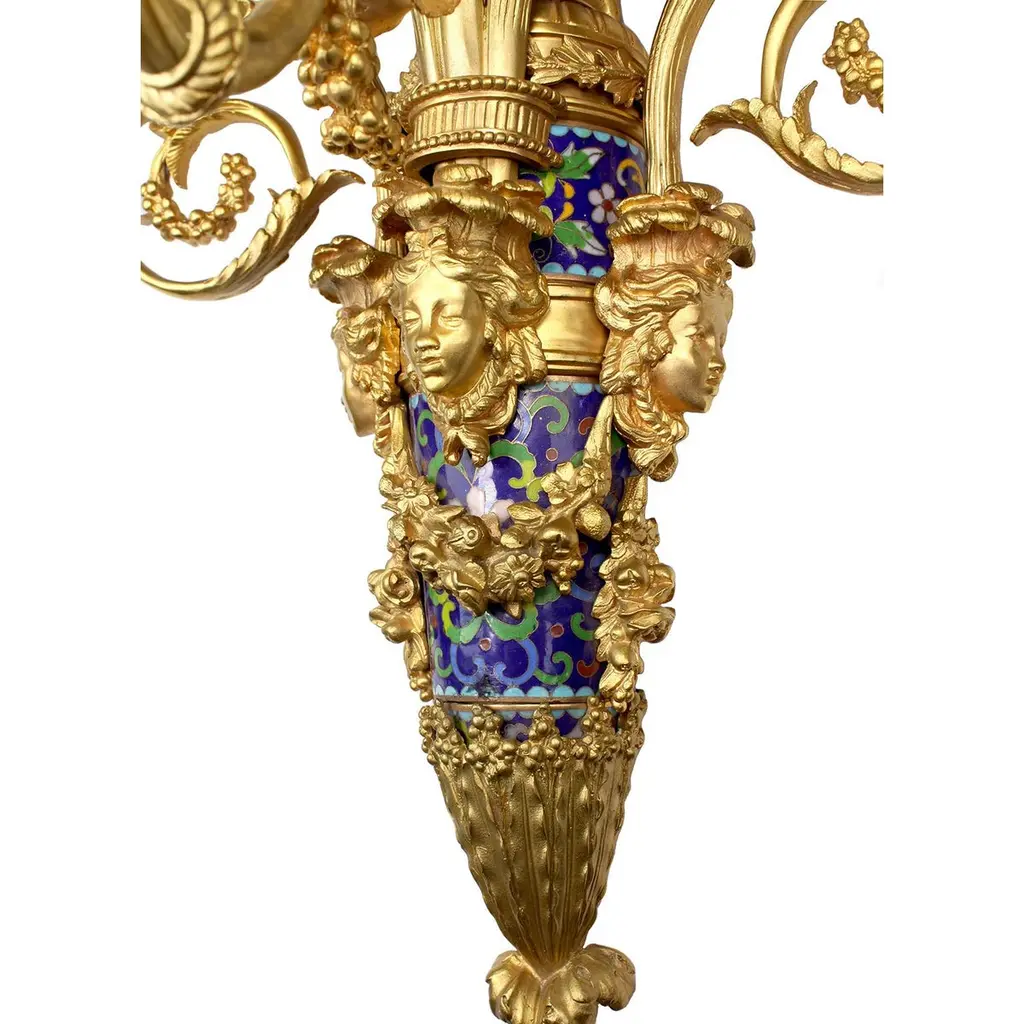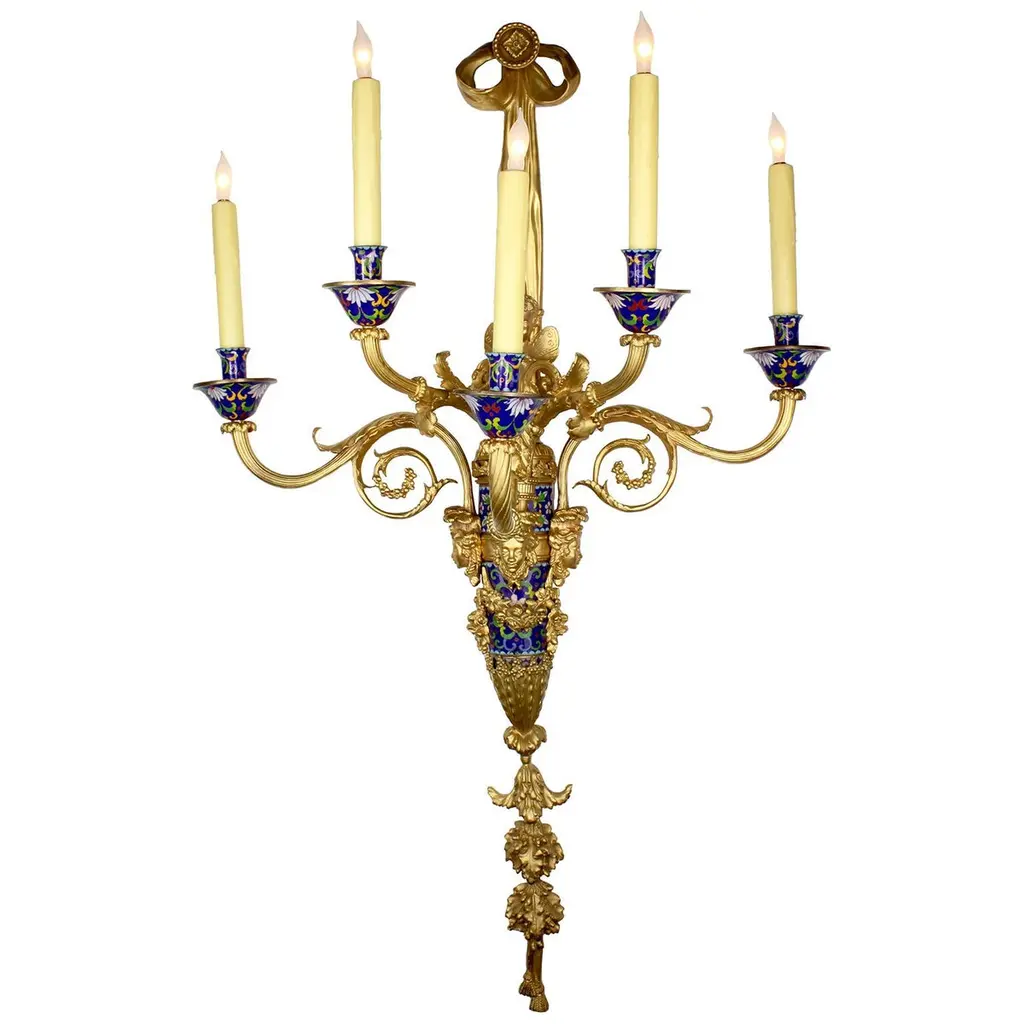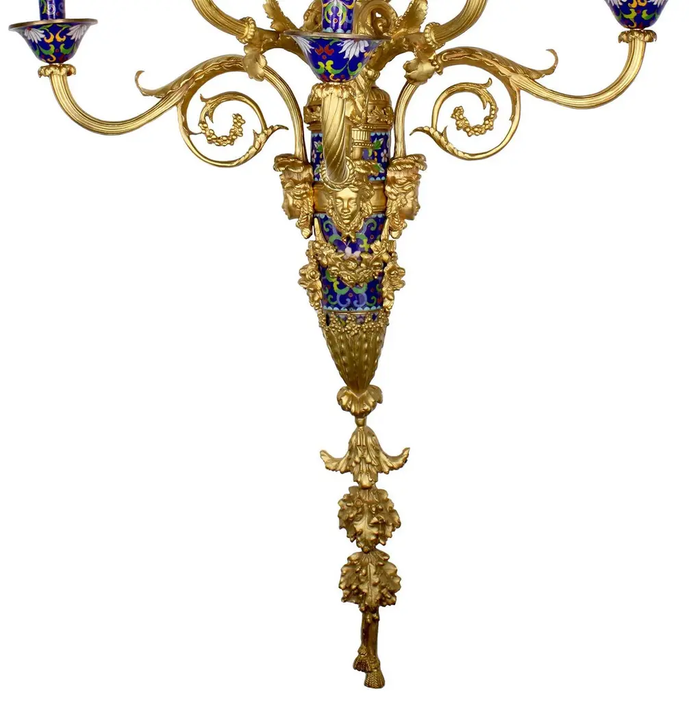 Pair Louis Xvi Style Gilt-Metal & Champlevé Enamel 5-Light Wall-Lights-Sconces