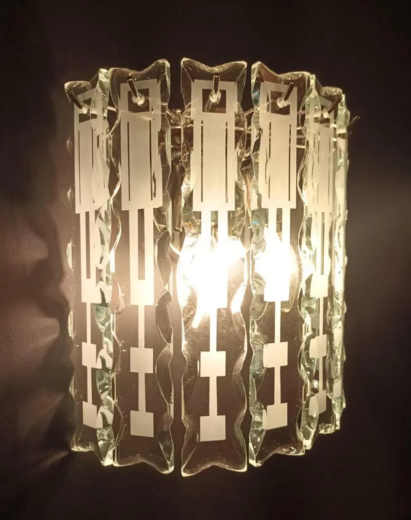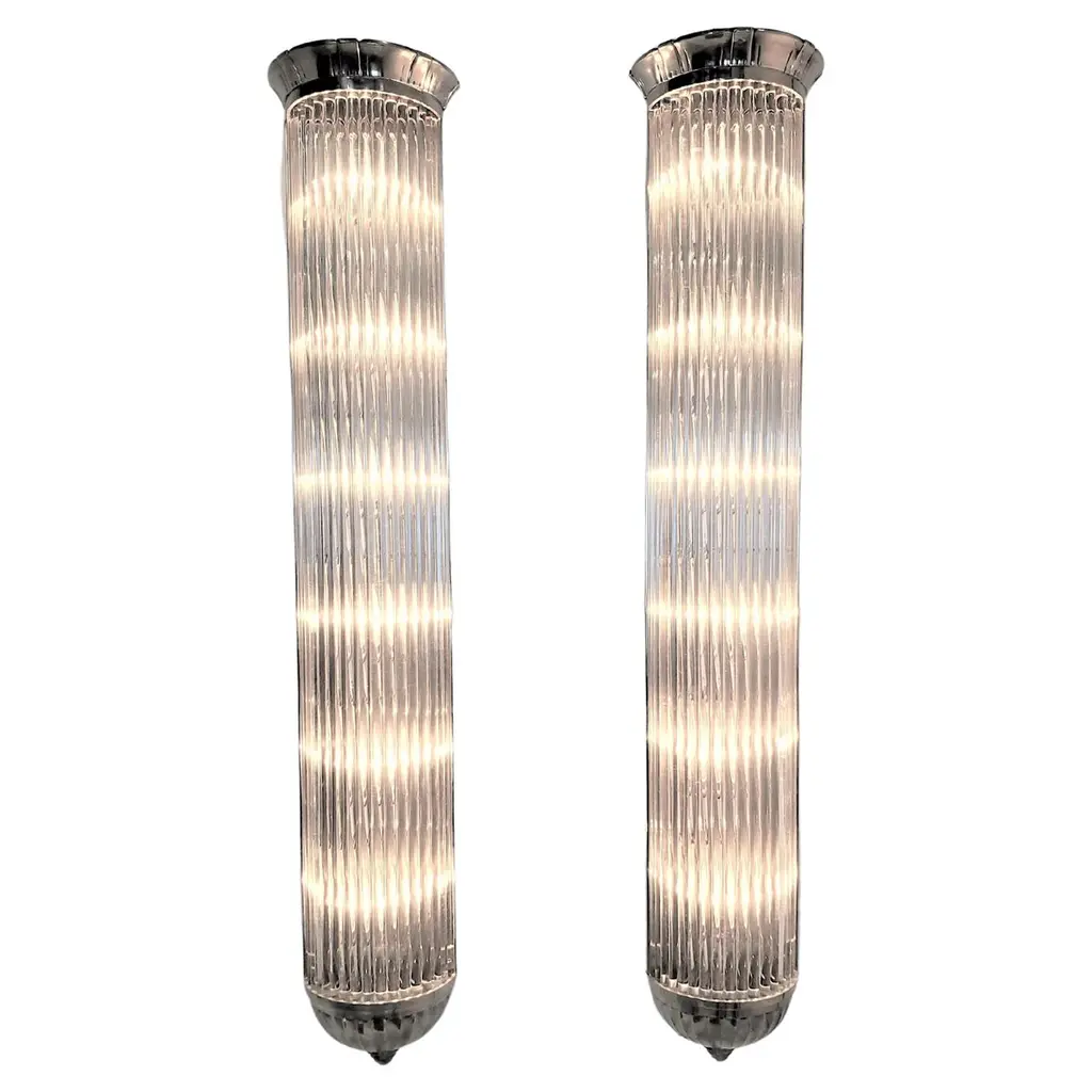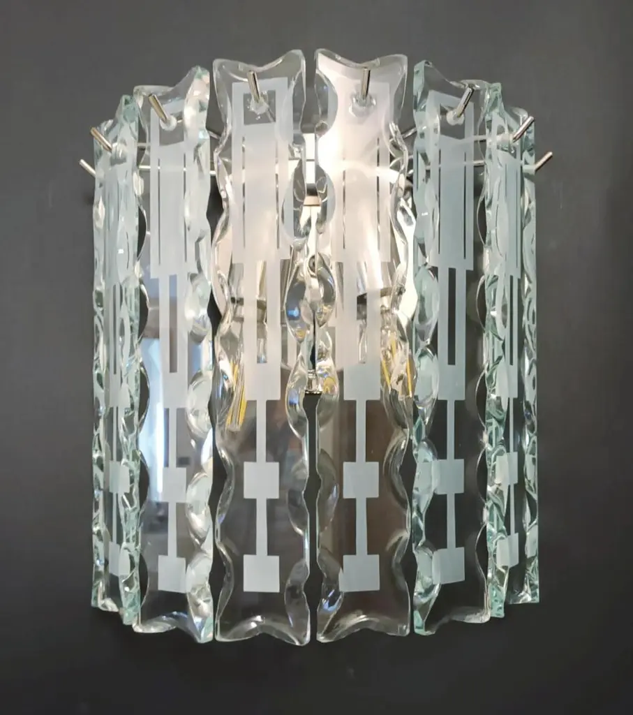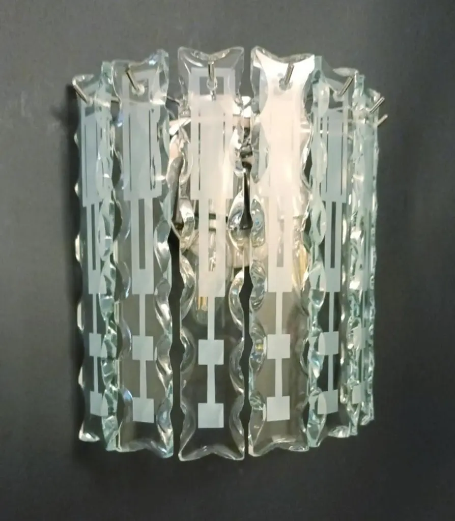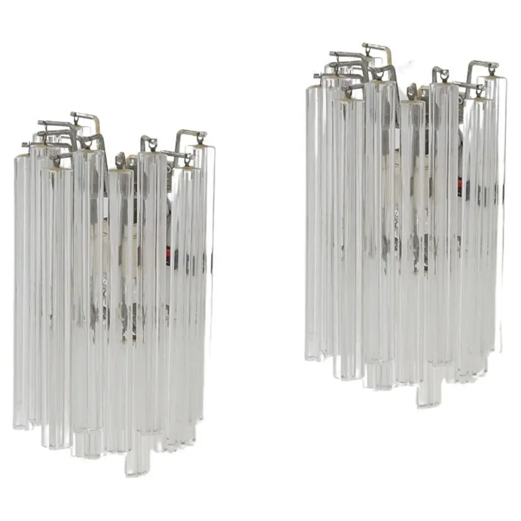 Vintage Italian wall sconces with deco beveled glass bars mounted on chrome frames / Made in Italy by Cristal Arte, circa 1960s2 lights / E12 or E14 type / max 40W eachMeasures: height 10 inches, width 10 inches, depth 5 inches3 pairs in stock in Italy, price is for each pairOrder reference #: FABIOLTD H072