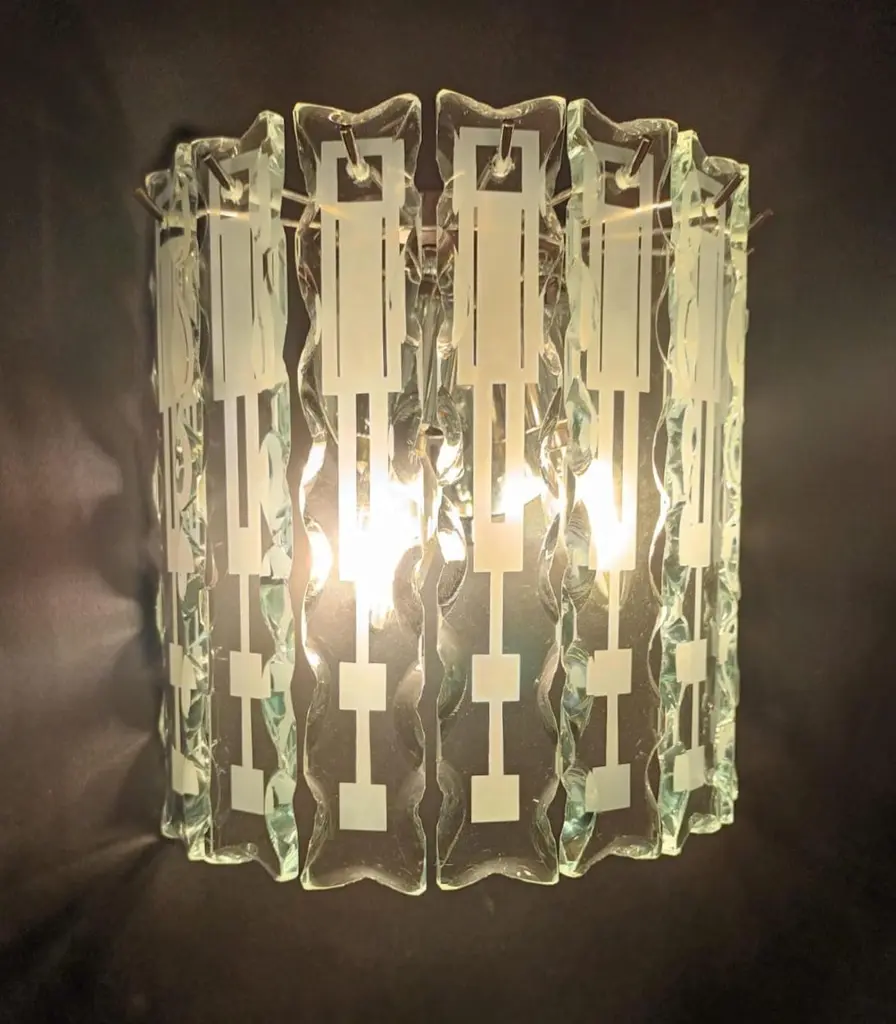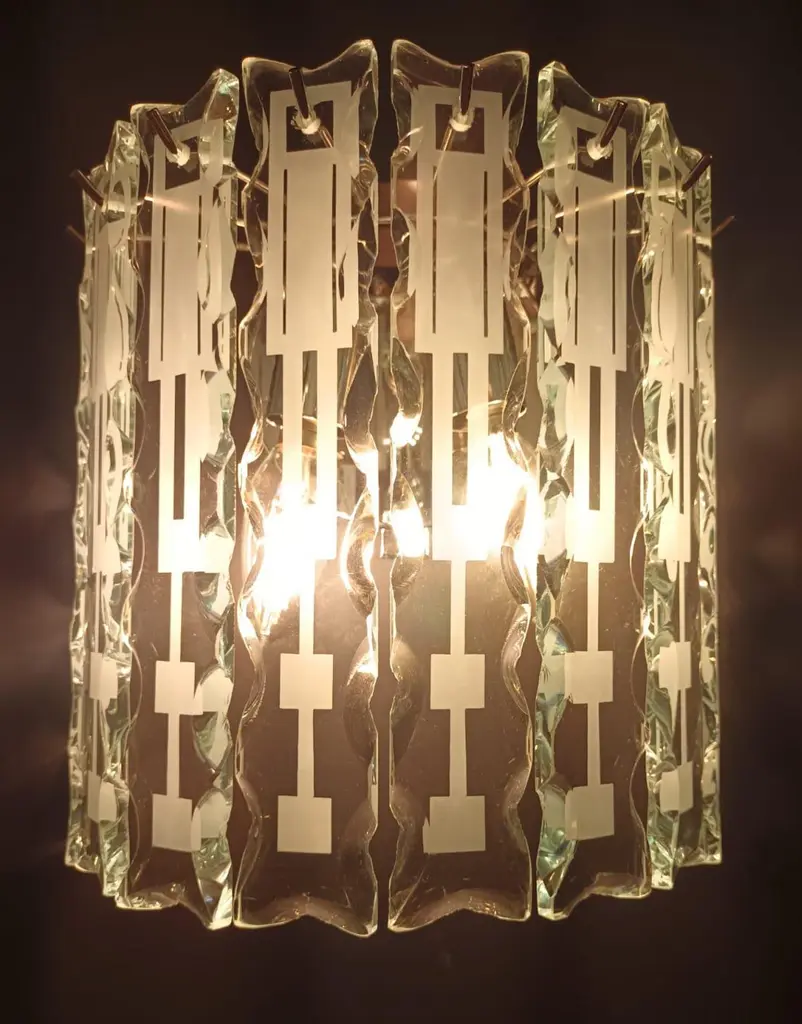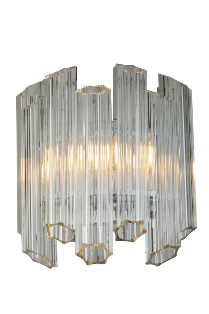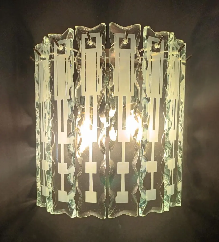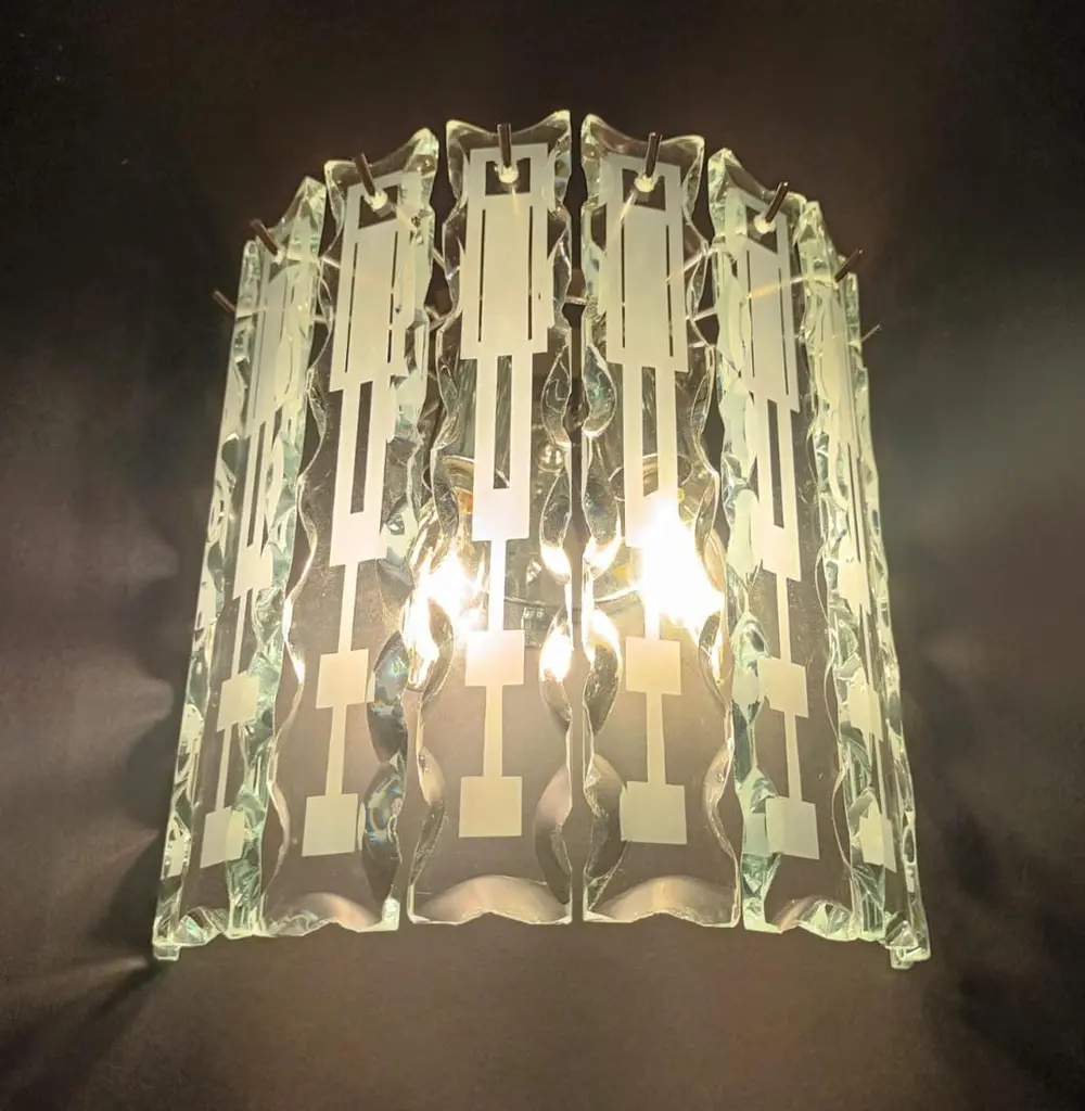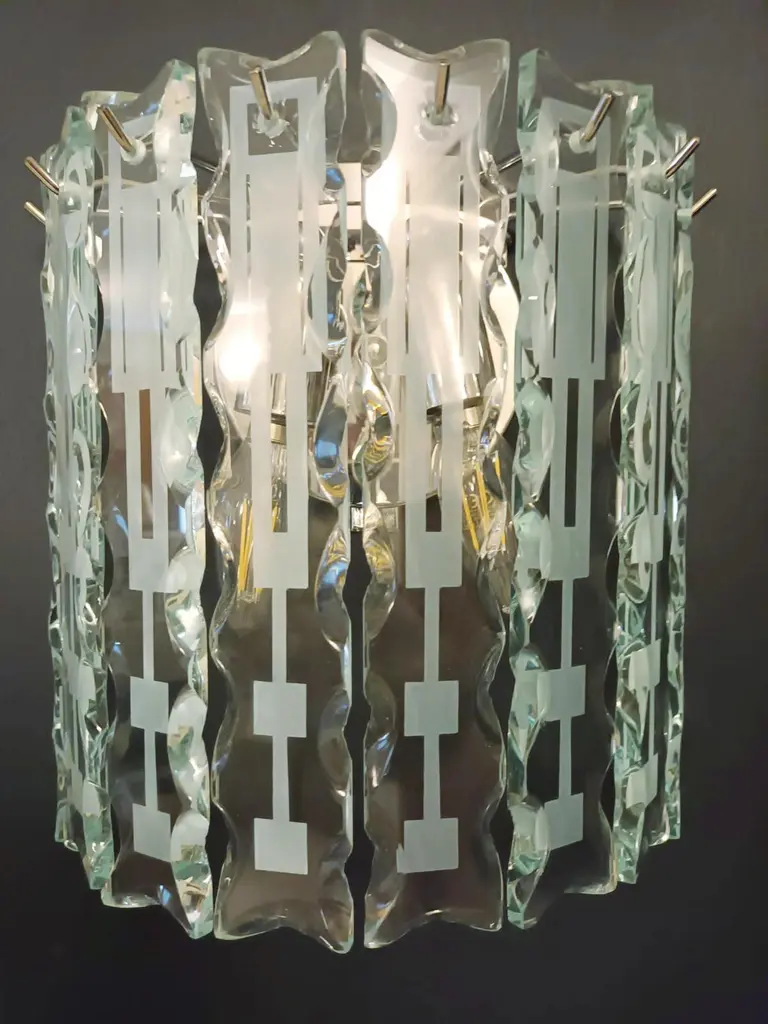 Vintage Italian wall sconces with deco beveled glass bars mounted on chrome frames / Made in Italy by Cristal Arte, circa 1960s2 lights / E12 or E14 type / max 40W eachMeasures: height 10 inches, width 10 inches, depth 5 inches3 pairs in stock in Italy, price is for each pairOrder reference #: FABIOLTD H072