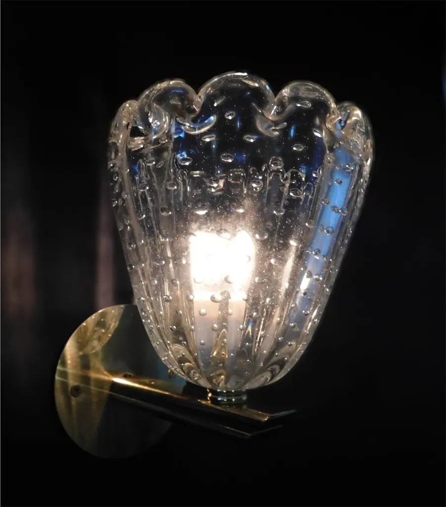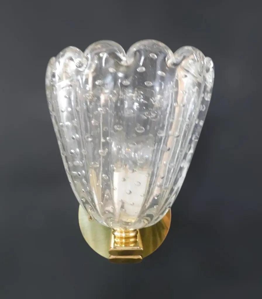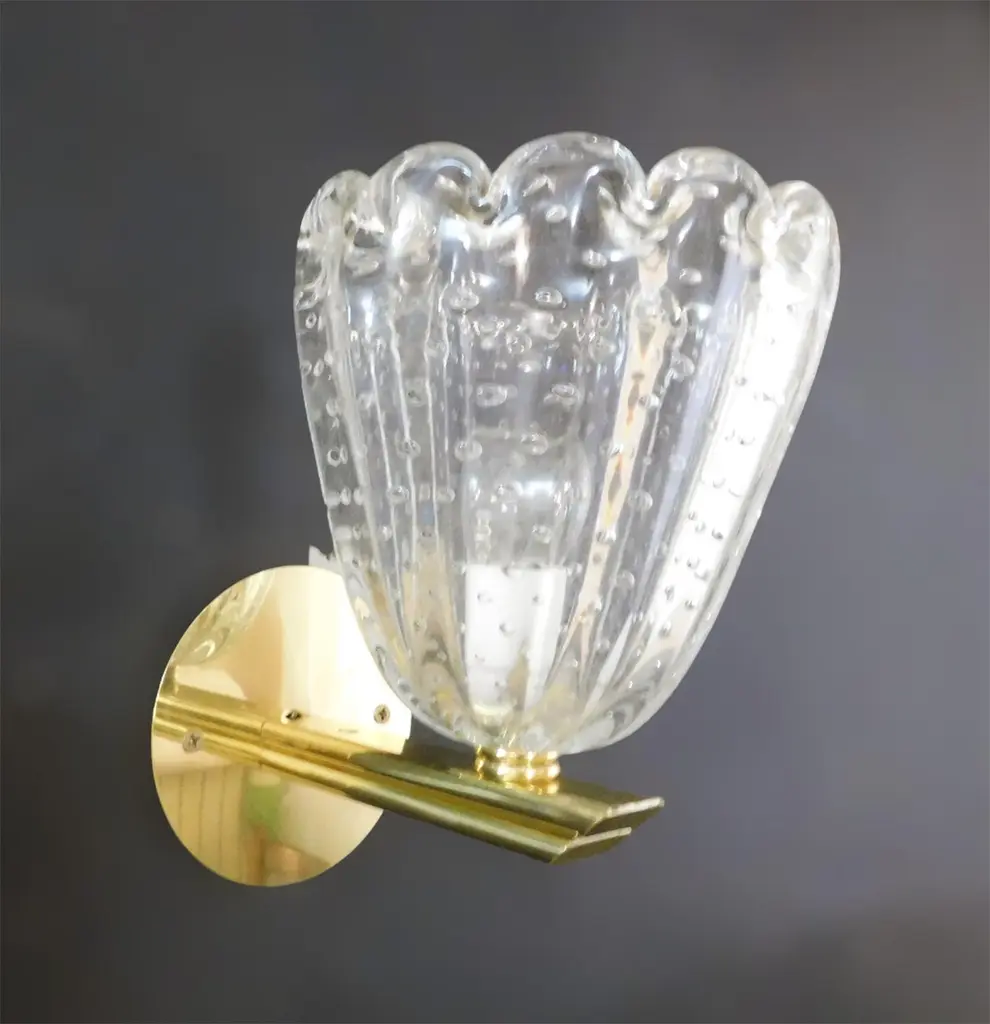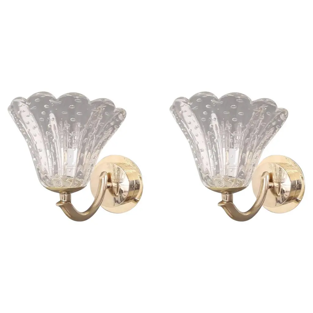 Vintage Italian wall lights with clear Murano glass cups hand blown with bubbles inside the glass using Bollicine technique, mounted on brass frames / Made in Italy, circa 1950sMeasures: Height 8 inches, width 7 inches, depth 8.5 inches1 light / E12 or E14 type / max 40W3 pairs available in stock in Italy, price is for each pairOrder reference #: FABIOLTD L47