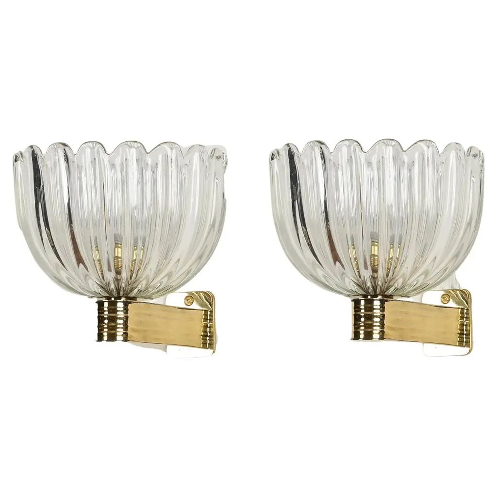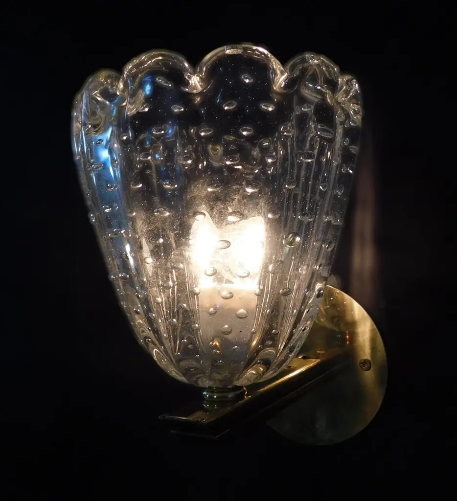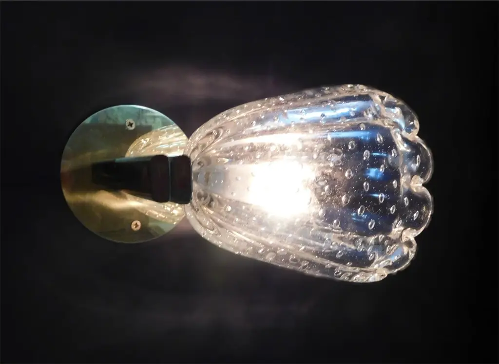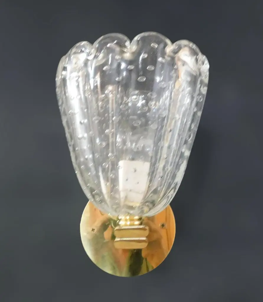 Vintage Italian wall lights with clear Murano glass cups hand blown with bubbles inside the glass using Bollicine technique, mounted on brass frames / Made in Italy, circa 1950sMeasures: Height 8 inches, width 7 inches, depth 8.5 inches1 light / E12 or E14 type / max 40W3 pairs available in stock in Italy, price is for each pairOrder reference #: FABIOLTD L47