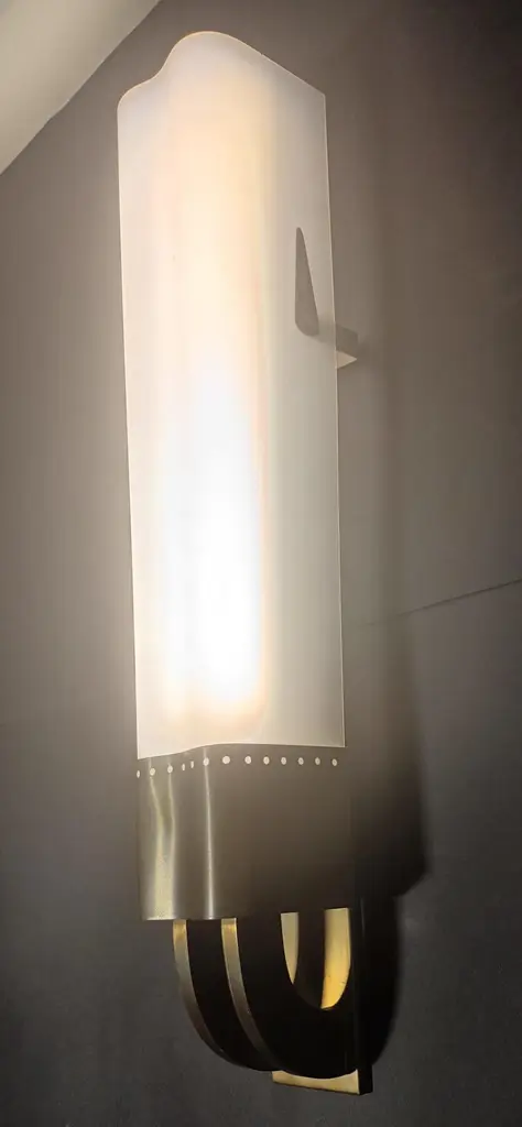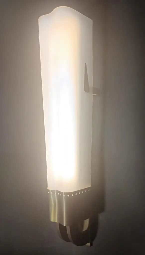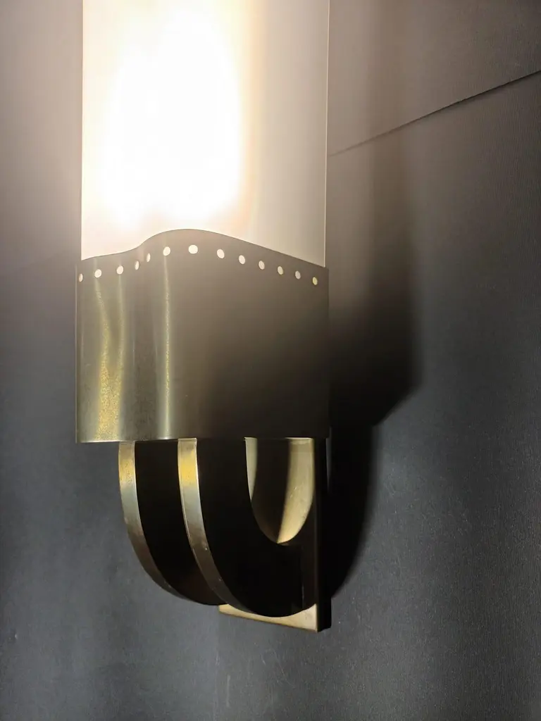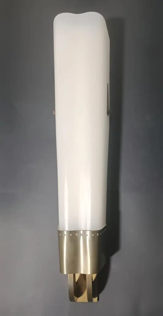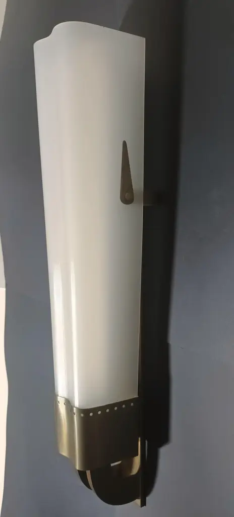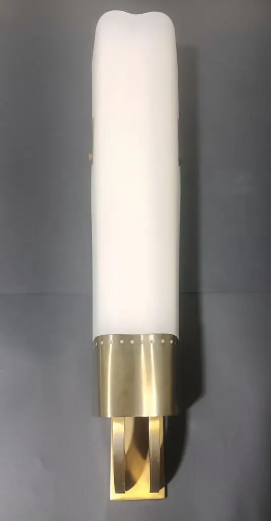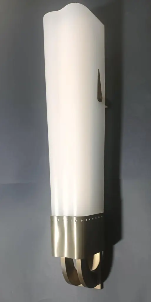 Oversized Italian Art Deco style wall lights with frosted white acrylic shades mounted on brass frame / Made in Milan Italy, circa 1950sNewly rewired with LED stripsMeasures: Height 33.5 inches, width 8 inches, depth 7.5 inches2 pairs available in stock in Italy, price listed is for each pairOrder Reference #: FABIOLTD H117.