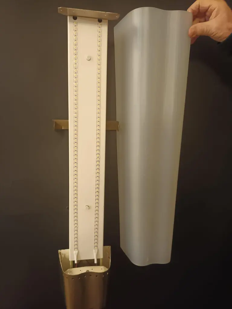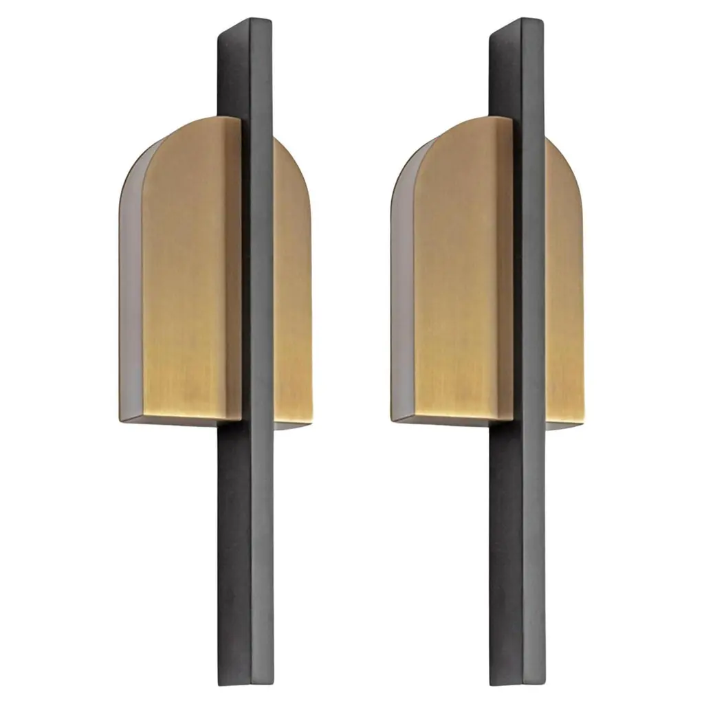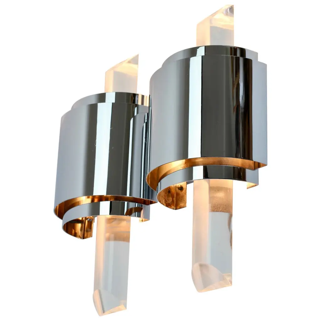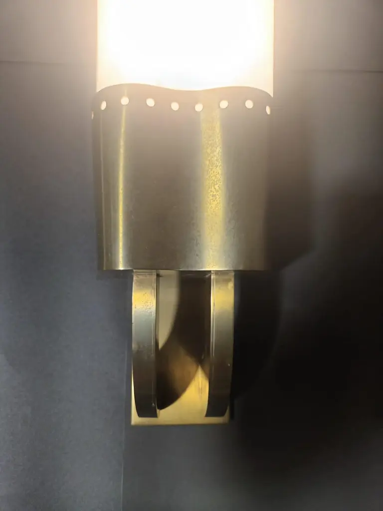 Oversized Italian Art Deco style wall lights with frosted white acrylic shades mounted on brass frame / Made in Milan Italy, circa 1950sNewly rewired with LED stripsMeasures: Height 33.5 inches, width 8 inches, depth 7.5 inches2 pairs available in stock in Italy, price listed is for each pairOrder Reference #: FABIOLTD H117.