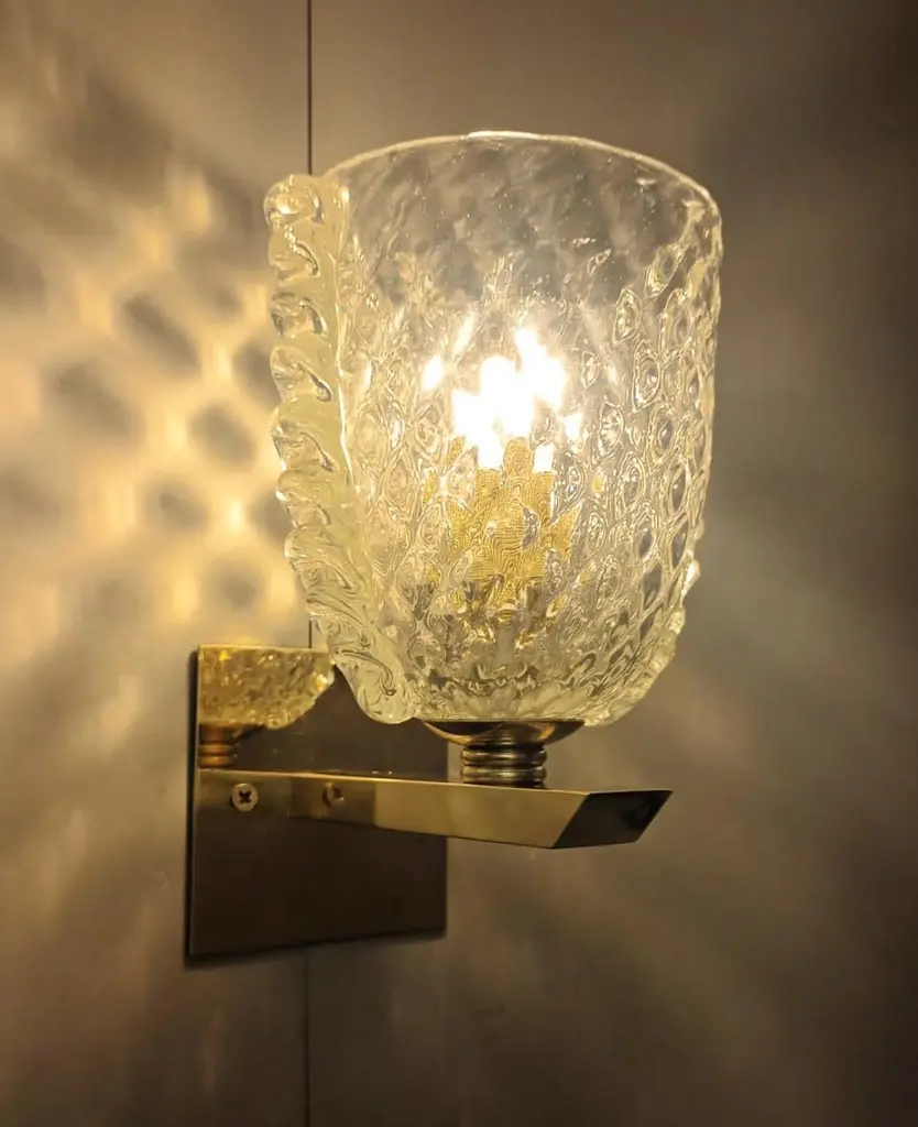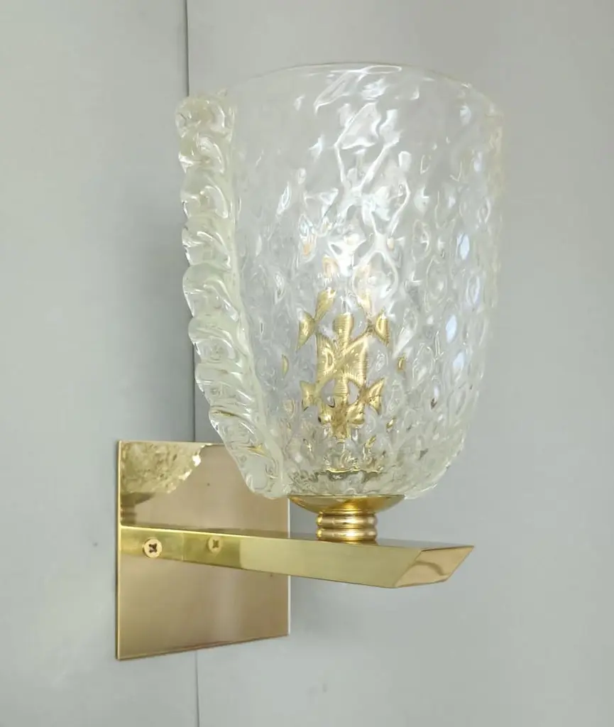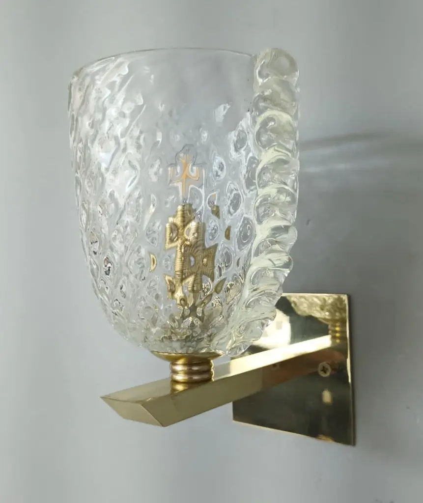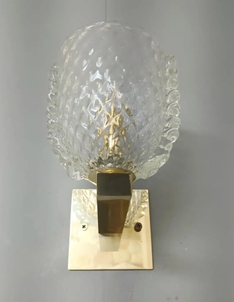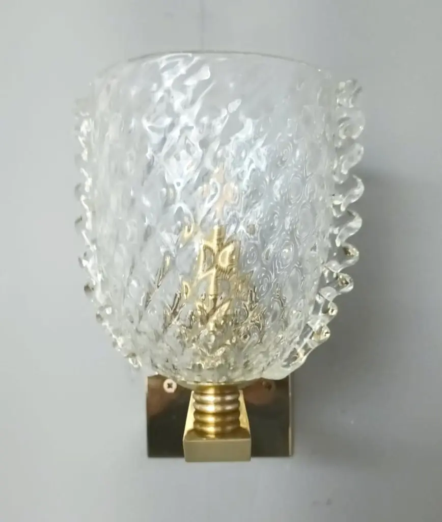 Italian wall lights with clear textured Murano glass shades mounted on brass frames / Made in Italy by Barovier e Toso, circa 1950s.Original mark on the backplate.Measures: height 9 inches, width 6 inches, depth 6 inches, backplate width 4 inches and height 4 inches.1 light / E12 or E14 type / max 40W2 pairs available in stock in Italy, price is for each pairOrder reference #: FABIOLTD H111