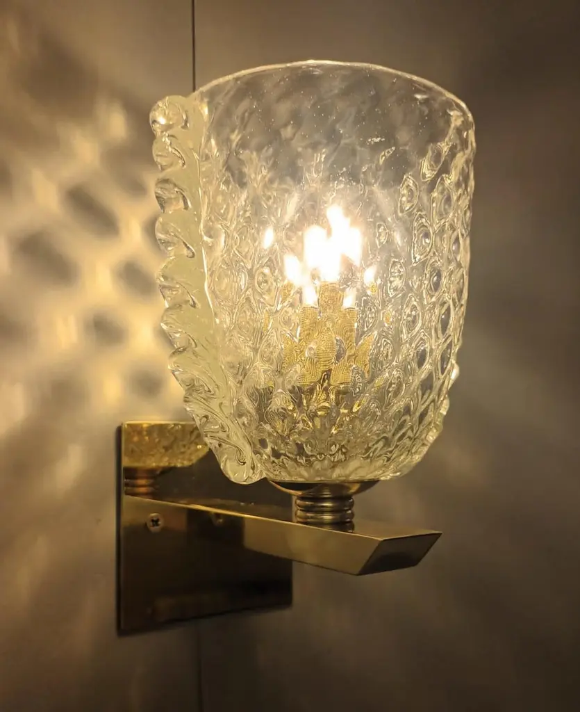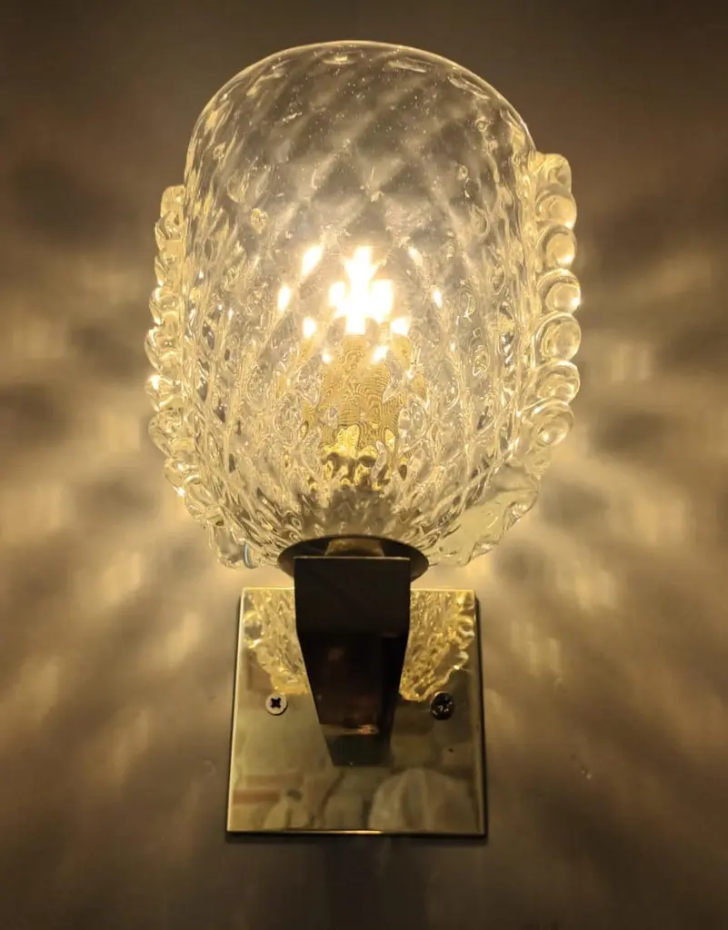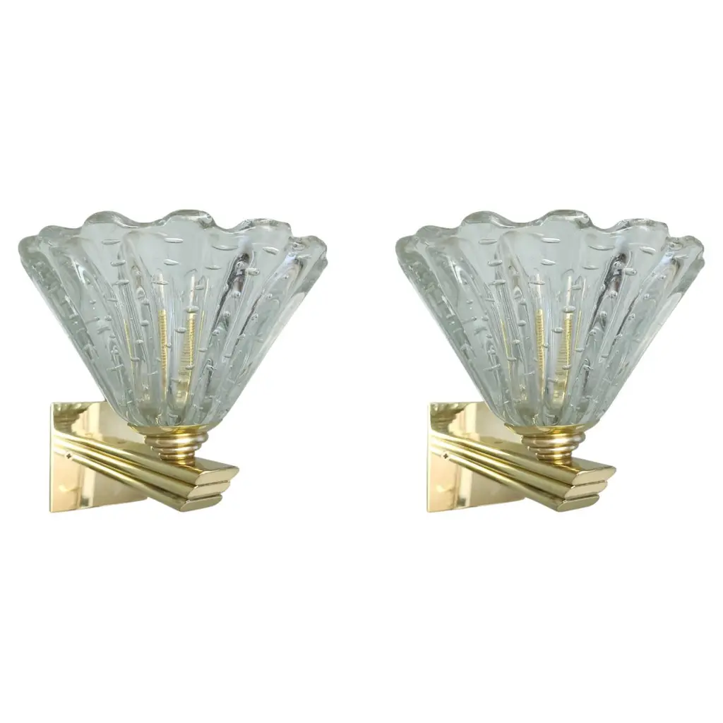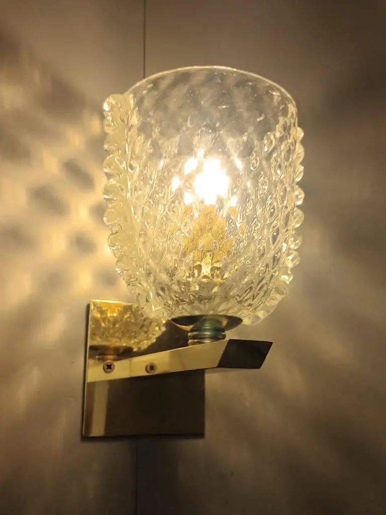 Italian wall lights with clear textured Murano glass shades mounted on brass frames / Made in Italy by Barovier e Toso, circa 1950s.Original mark on the backplate.Measures: height 9 inches, width 6 inches, depth 6 inches, backplate width 4 inches and height 4 inches.1 light / E12 or E14 type / max 40W2 pairs available in stock in Italy, price is for each pairOrder reference #: FABIOLTD H111