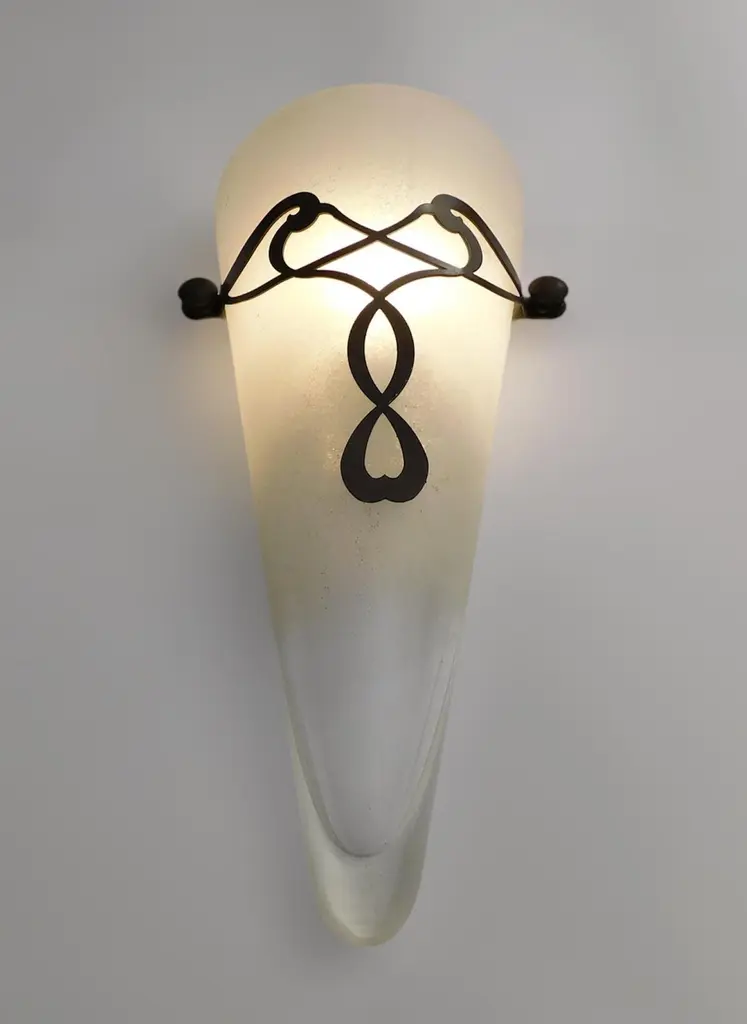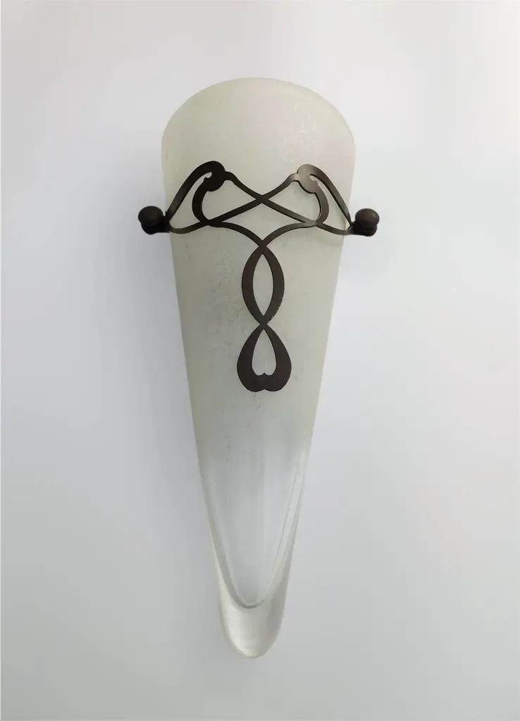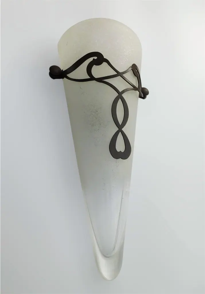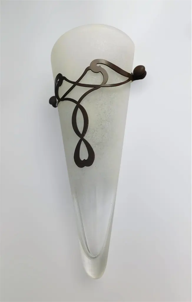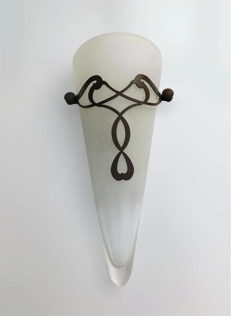 Italian wall light with frosted cone shaped Murano glass diffuser and bronze embroidery / Made in Italy, circa 1960sMeasures: height 16 inches / width 8.5 inches / depth 3.5 inches1 light / E12 or E14 type / max 40W2 pairs available in stock in Italy, price listed is for each pairOrder reference #: FABIOLTD L46