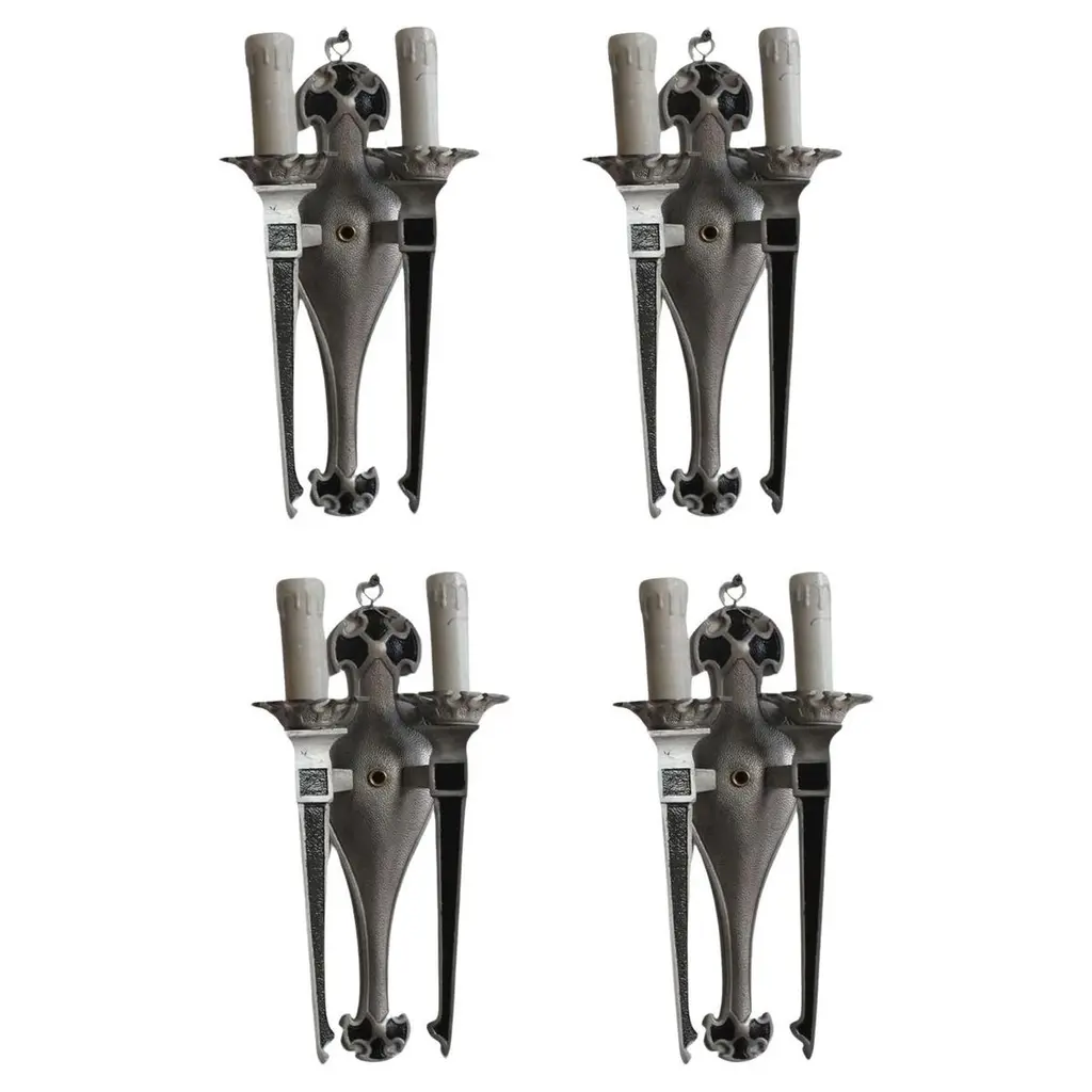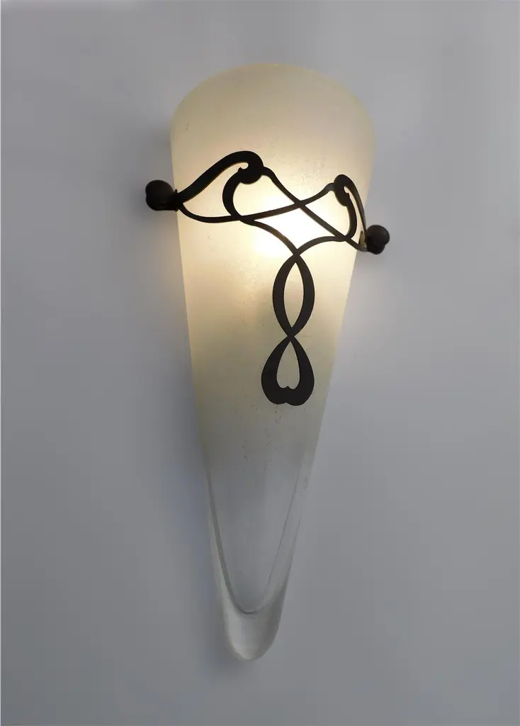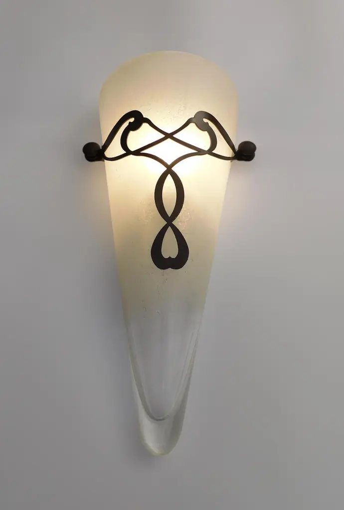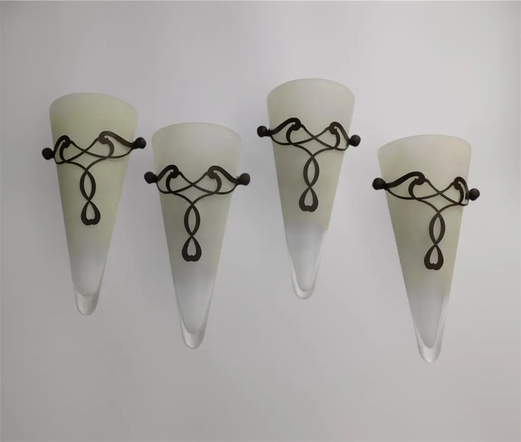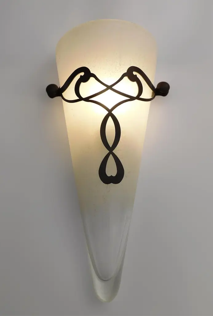 Italian wall light with frosted cone shaped Murano glass diffuser and bronze embroidery / Made in Italy, circa 1960sMeasures: height 16 inches / width 8.5 inches / depth 3.5 inches1 light / E12 or E14 type / max 40W2 pairs available in stock in Italy, price listed is for each pairOrder reference #: FABIOLTD L46