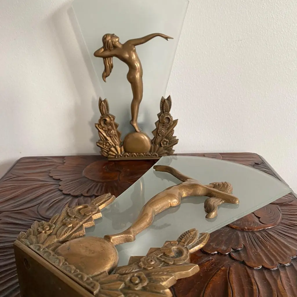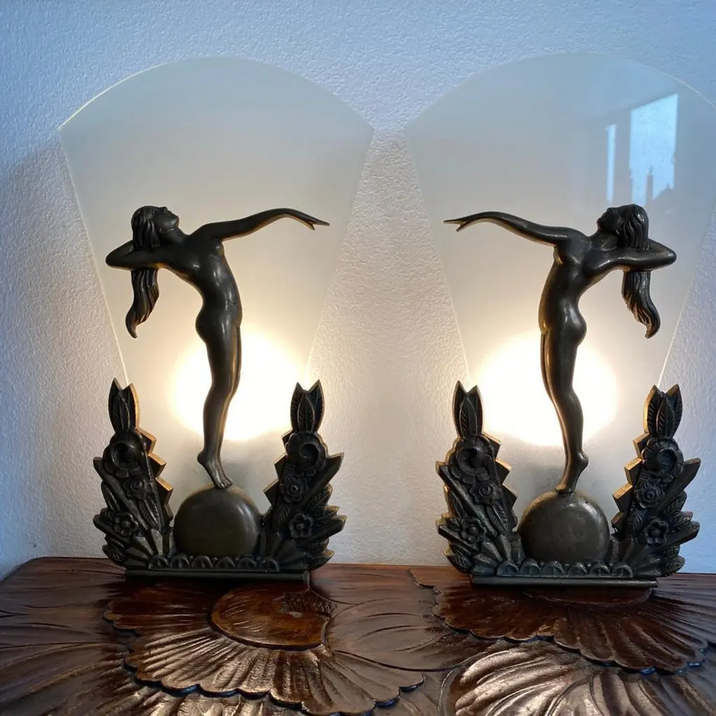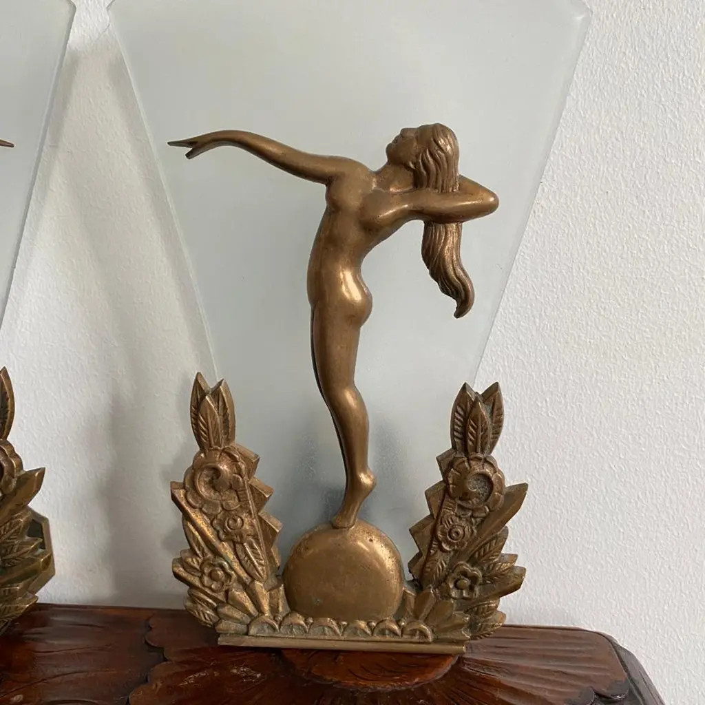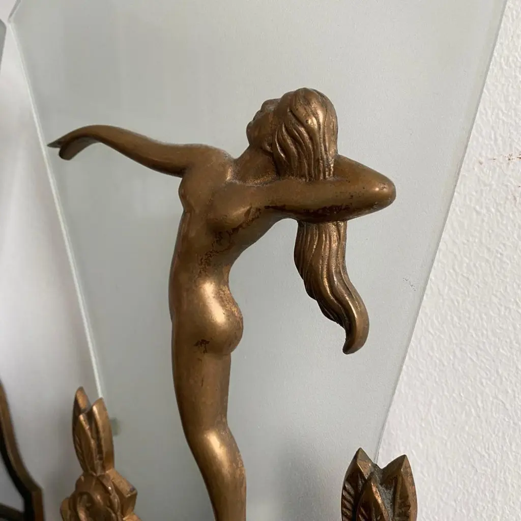 Pair of Charming Art Deco Wall Sconces in Bronze and Frosted Glass, Denmark Circa 1920's. Each sconce has a cast of a nude lady with long hair and one arm stretched out towards the other wall sconce.