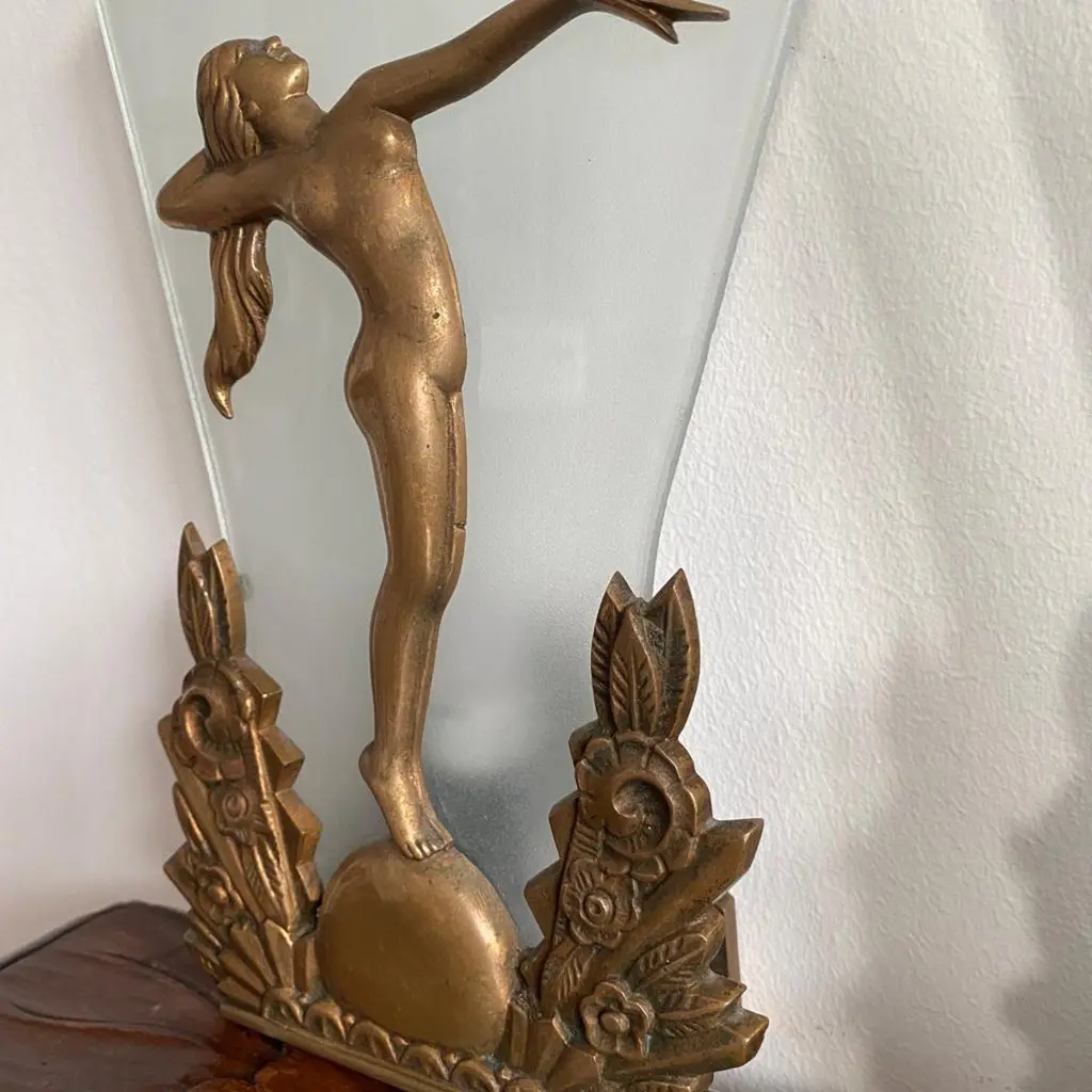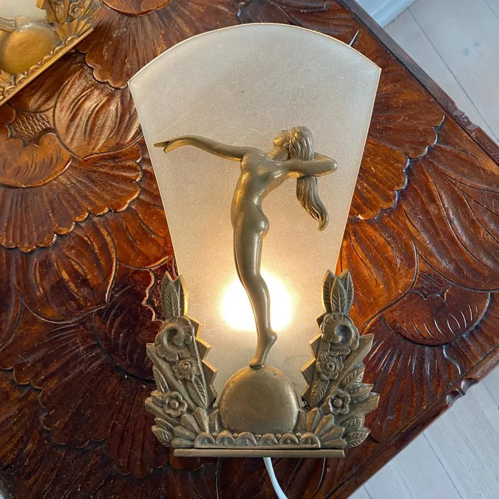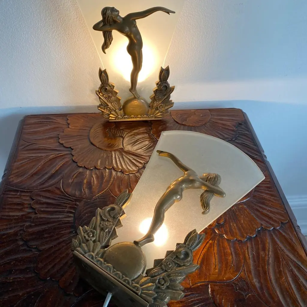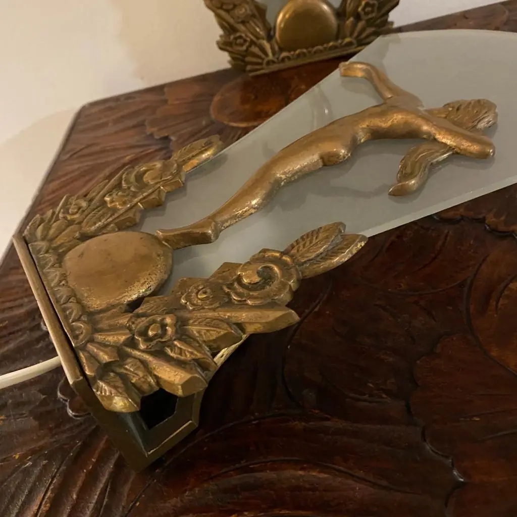 Pair of Charming Art Deco Wall Sconces in Bronze and Frosted Glass, Denmark Circa 1920's. Each sconce has a cast of a nude lady with long hair and one arm stretched out towards the other wall sconce.