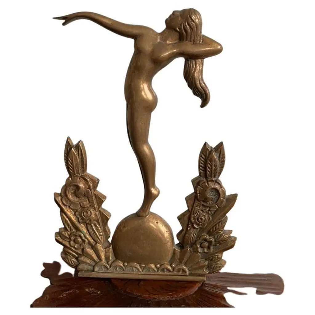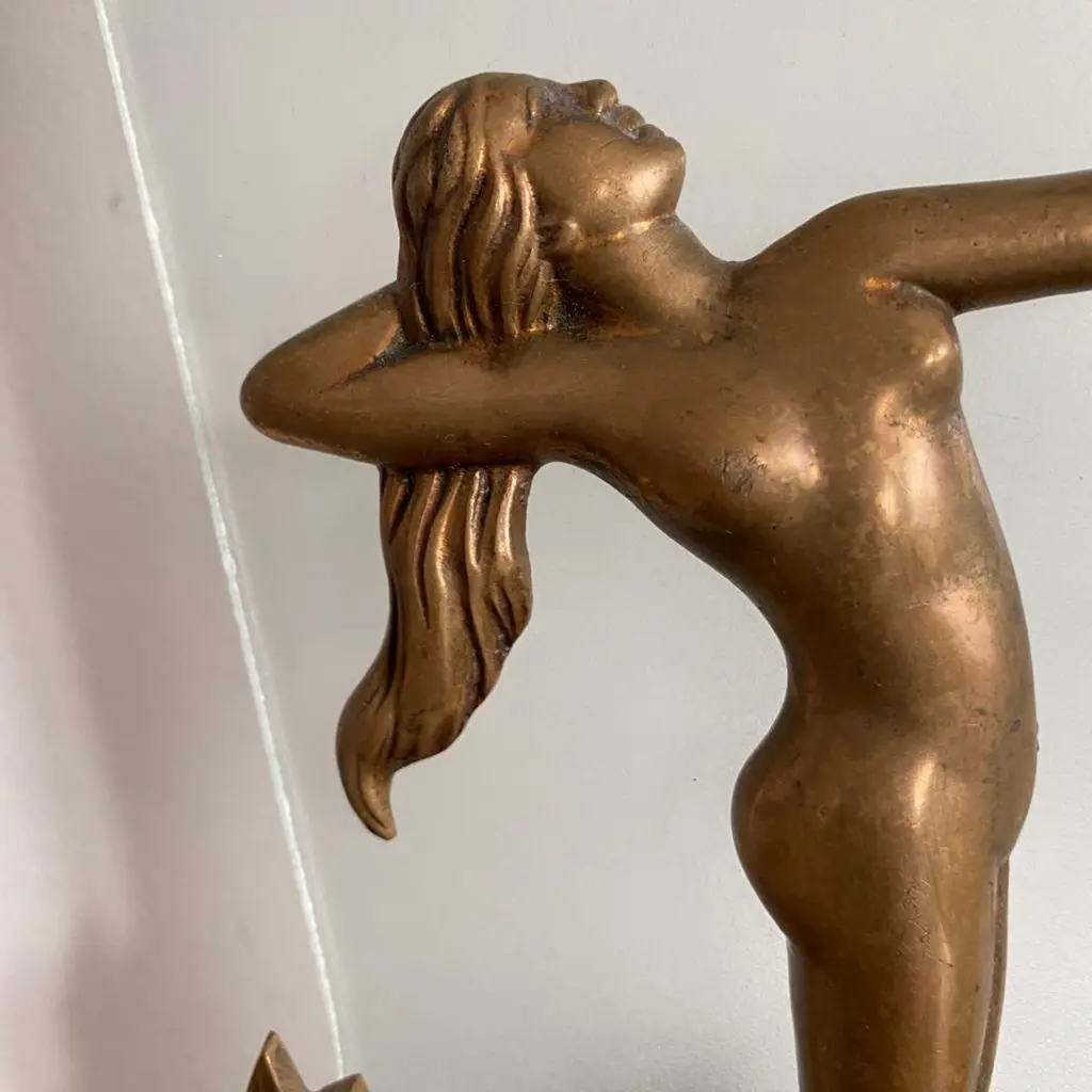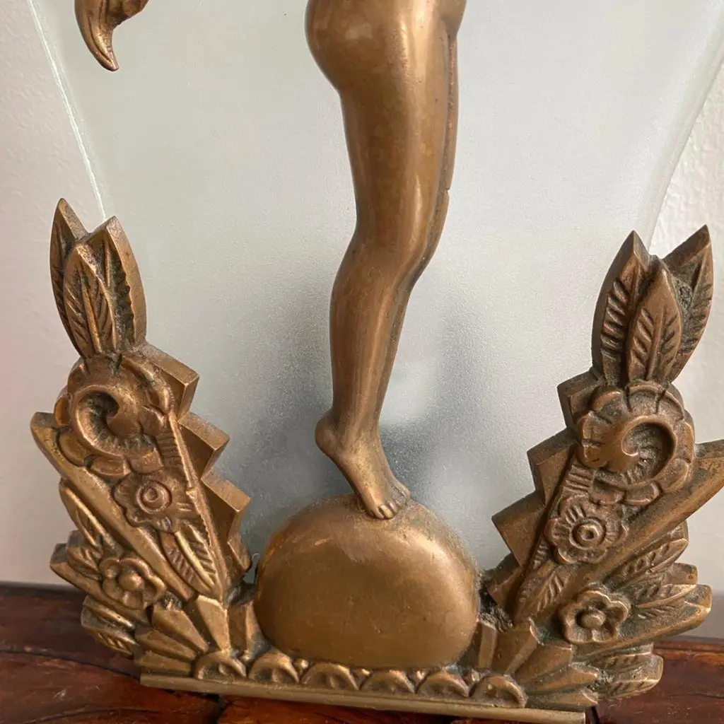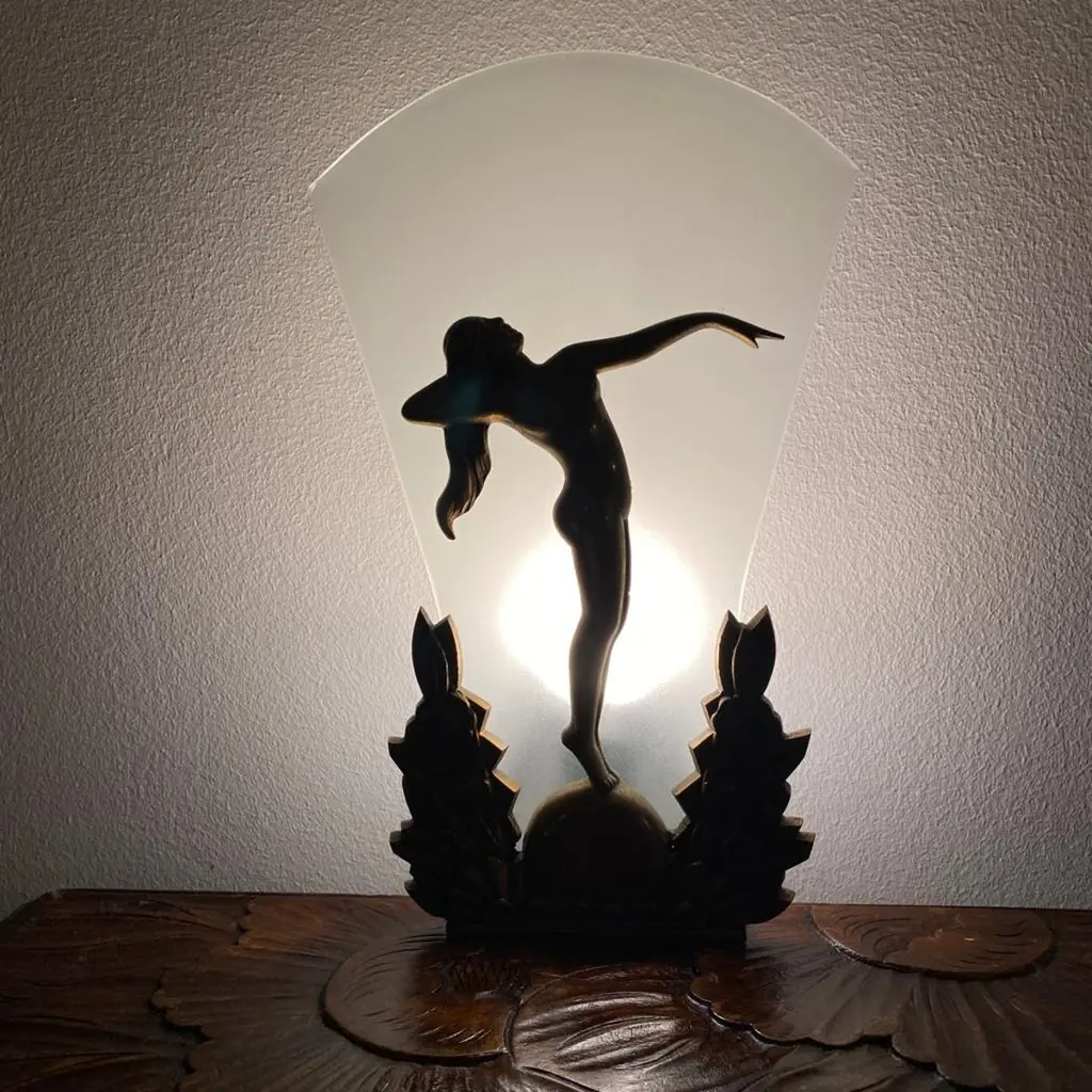 Pair of Charming Art Deco Wall Sconces in Bronze and Frosted Glass, Denmark Circa 1920's. Each sconce has a cast of a nude lady with long hair and one arm stretched out towards the other wall sconce.
