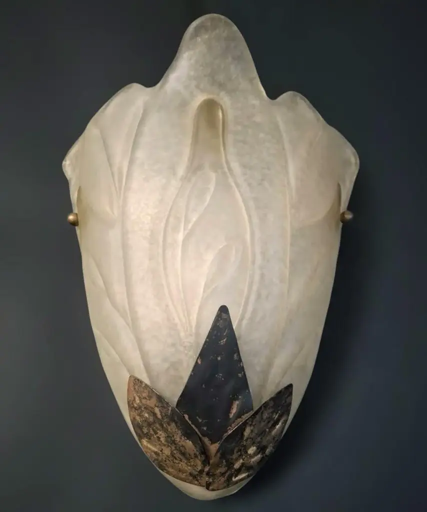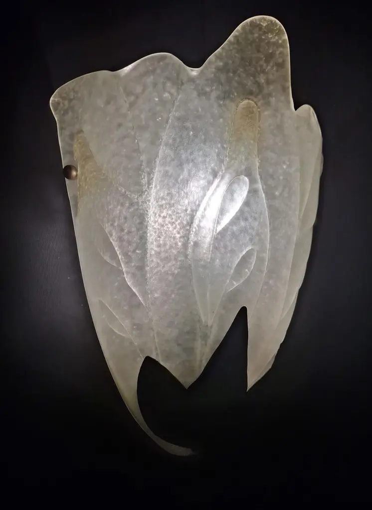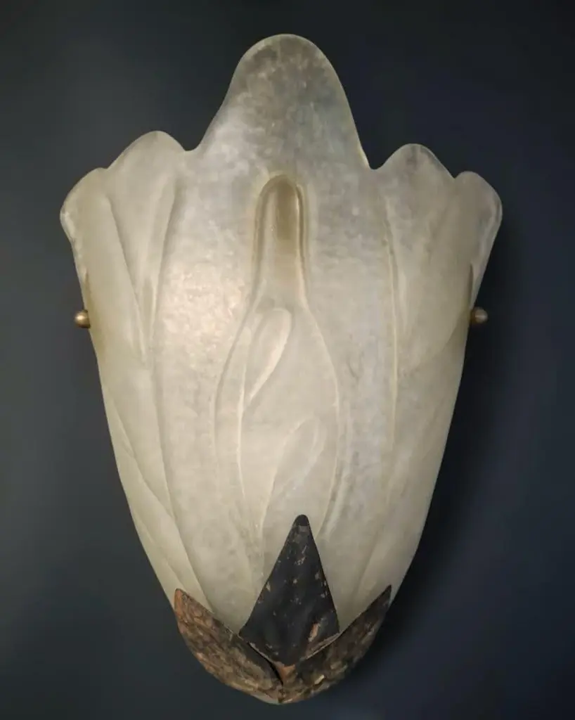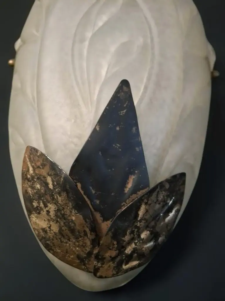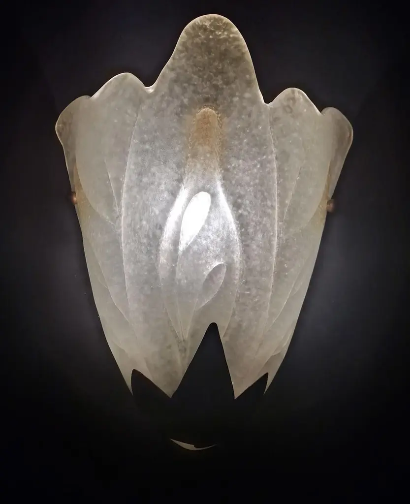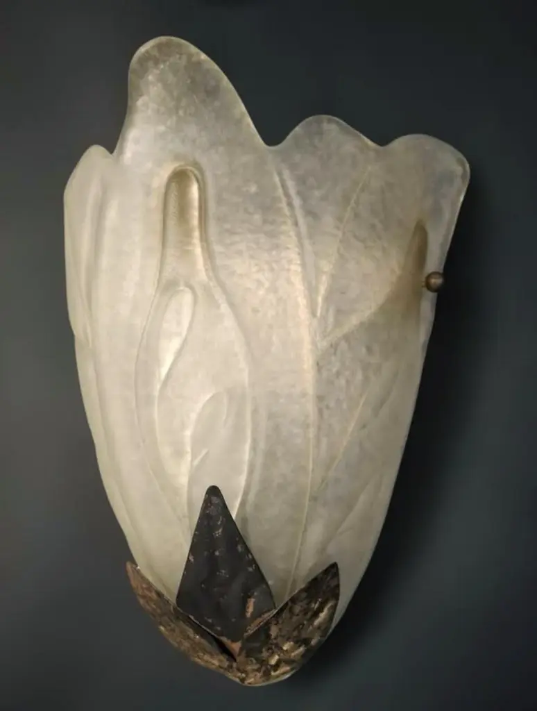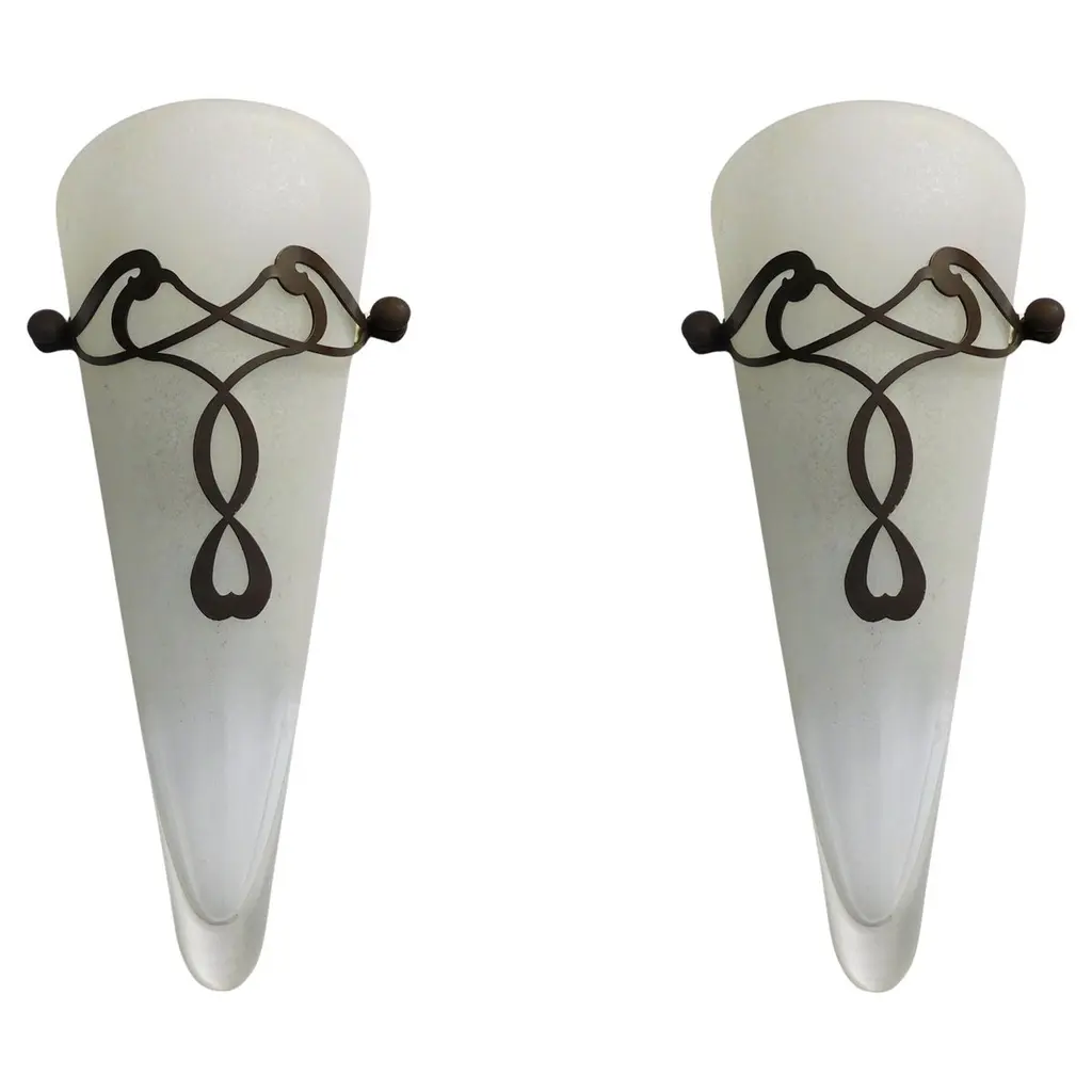 Vintage Italian Art Deco wall light with frosted white glass shield and metal leaves / Made in Italy in 20th centuryMeasures: height 12 inches, width 10 inches, depth 5 inches1 light / E26 or E27 type / max 60W2 pairs available in stock in Italy, price listed is for each pairOrder reference #: FABIOLTD K109