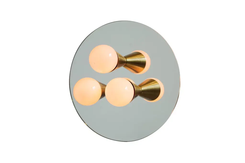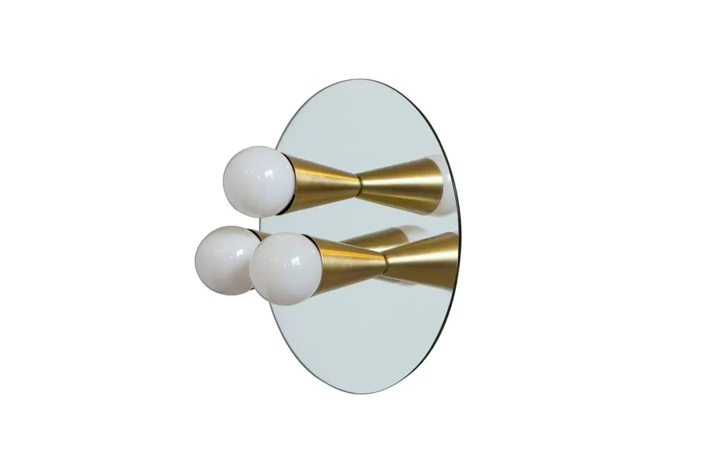 This listing is for a pair of the Echo three sconces. The price includes two lights.Simple, elegant and playful, the Echo Series is a line of surface-mount fixtures that can be used on a wall or ceiling. White or brass cones mount to mirrored glass to perfectly reflect each bulb, giving the illusion of lights floating in space.Canopy: White side-mount canopy included Lamping: Three E12 (candelabra) socketsVoltage: 110v Bulb Type: Requires three G16 1/2 bulb, bulbs not included Output: Bulbs available from 15-60 watts Dimming: Fully dimmable.UL Listed.