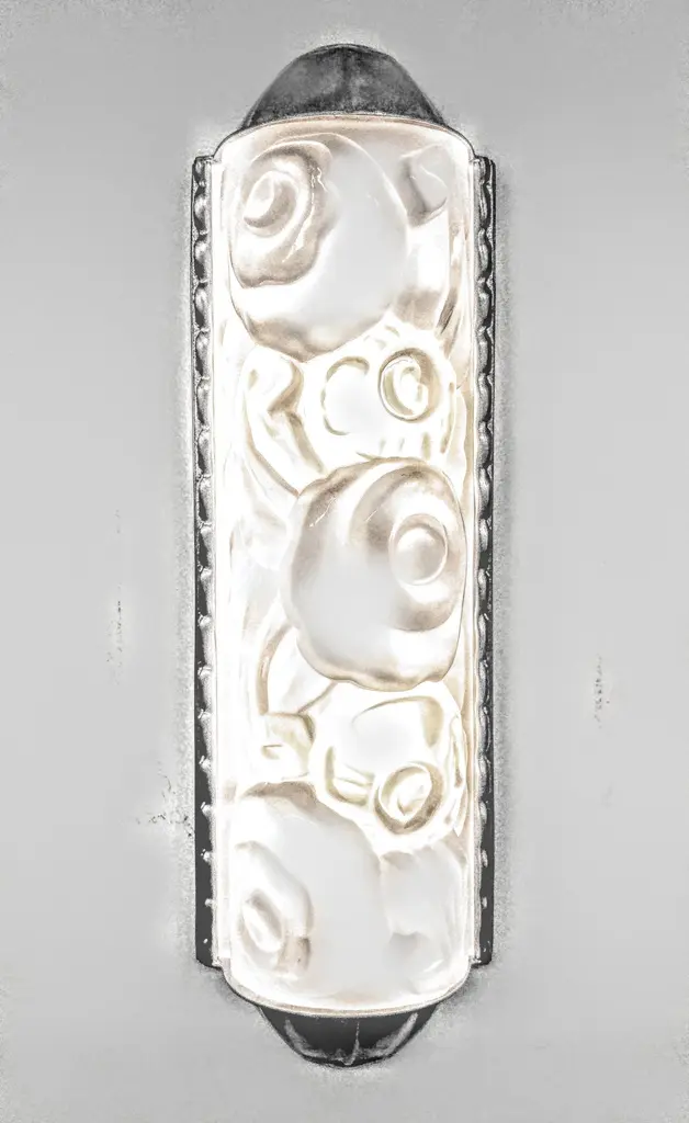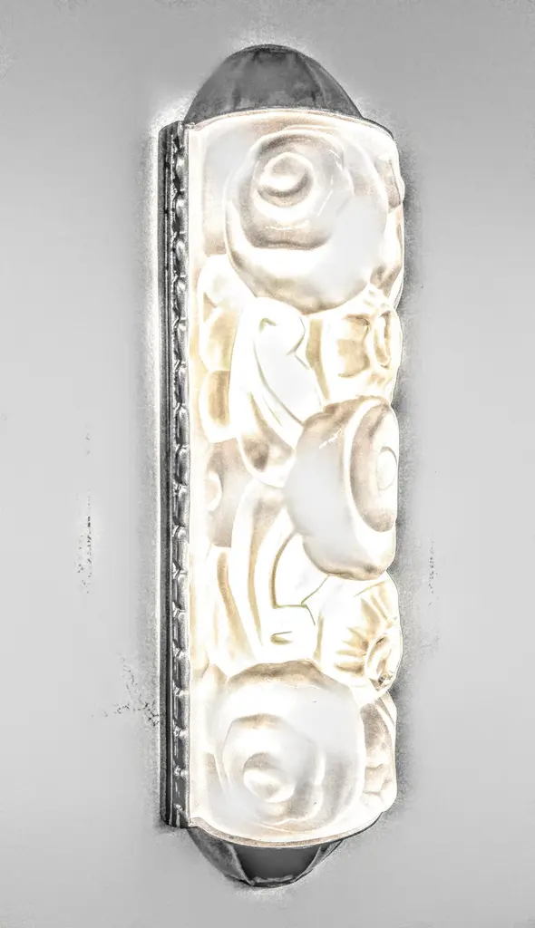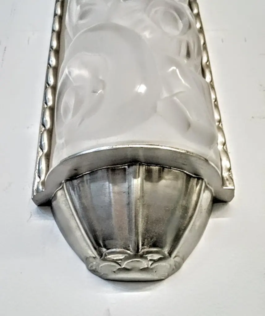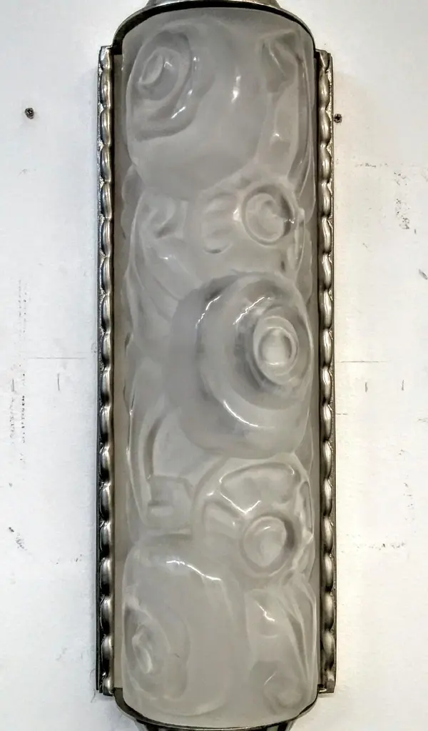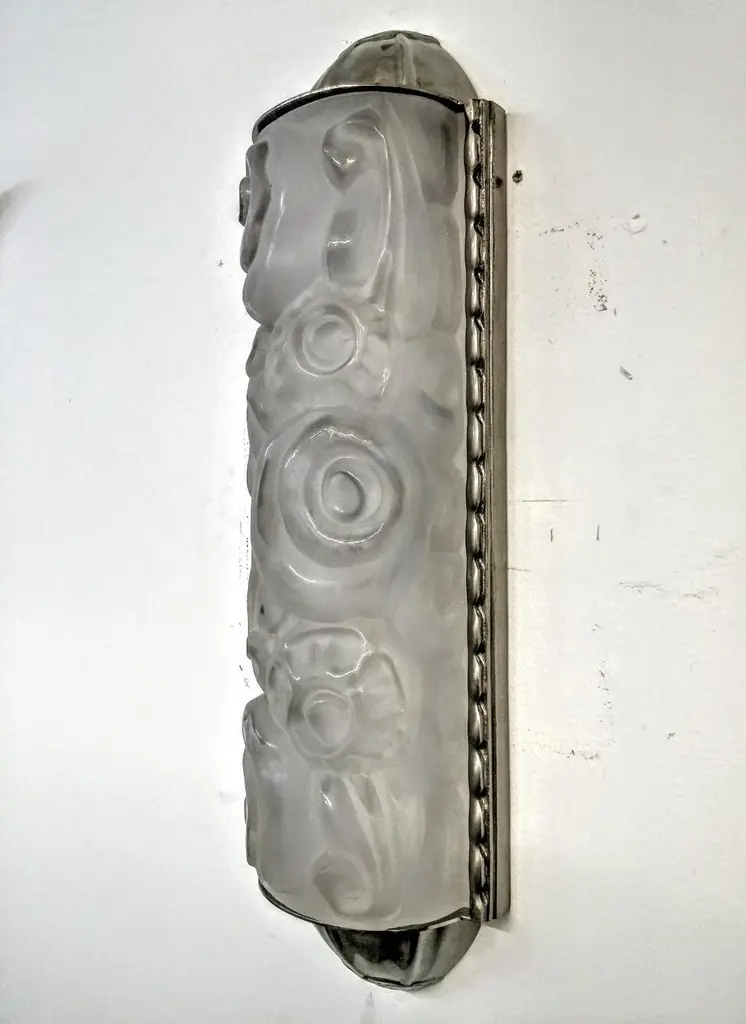 On Sale for a limited time...!A pair of wall sconces in grand scale 20.75" high by the French artist “Genet et Michon” in great condition. Clear frosted glass shades with flower motif details. Shades are held on both ends by decorative Nickeled Bronze frames. These sconces have the added benefit that they can be hung horizontally or vertically. ( two pairs available ) Each sconce has been re-plated in nickel and rewired for U.S. standards. Accommodates two candelabra bulbs (total 120 watts max.) Re-plating in different finishes upon request with additional cost. We are the rare source that has specialized exclusively in French Art Deco for over three decades, since 1991 with restoration, repair and plaiting for any lighting period located in Long Island City, N.Y. If you are searching for a particular item, we have additional inventory in our collections that may fit your needs. Please feel free to ask any questions by pressing the " ASK THE SELLER " button so we may assist you in finding a wonderful piece that's just right for you.