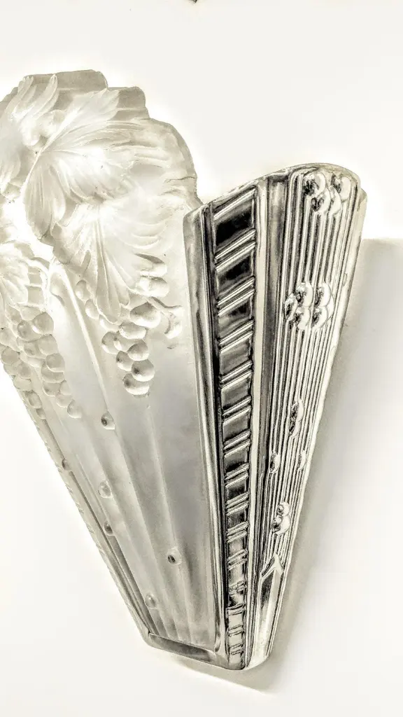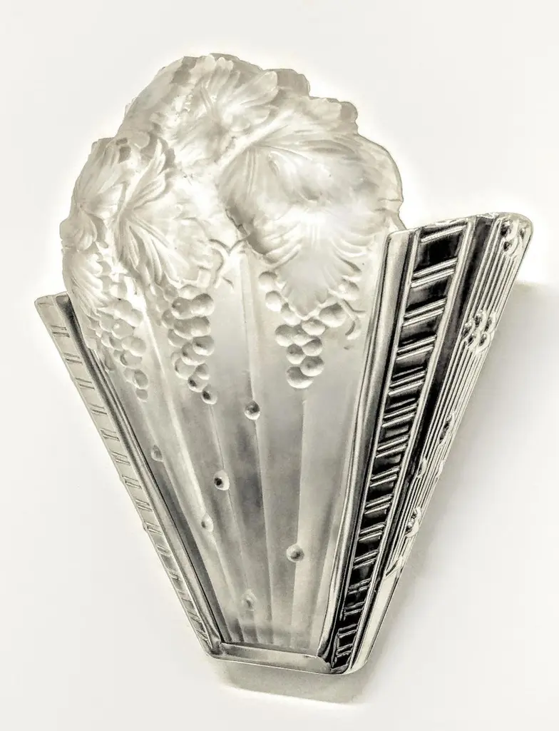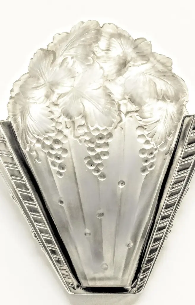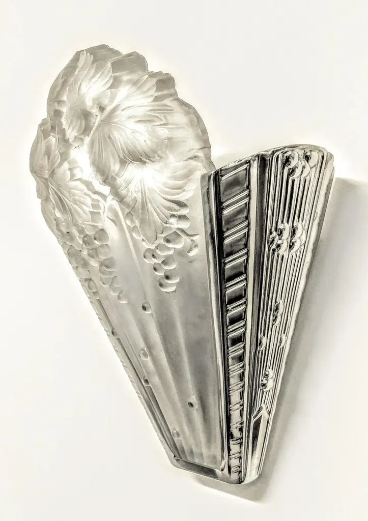 A stunning pair of French Art Deco wall sconces by the French artist "Marius Ernest Sabino" in clear and frosted molded glass shades with grapes vine motif. Held by a replated nickel bronze frame. Rewired to U.S. standards which accommodate a household bulb E-26 medium base (300 Watt max.) Re-plating in different finishes upon request. with no additional cost. Complimentary drop-off to New York City. We are the rare source that has specialized exclusively in French Art Deco for over three decades, since 1991 with restoration, repair and plaiting for any lighting period located in Long Island City, N.Y. If you are searching for a particular item, we have additional inventory in our collections that may fit your needs. Please feel free to ask any questions by pressing the " ASK THE SELLER " button so we may assist you in finding a wonderful piece that's just right for you.
