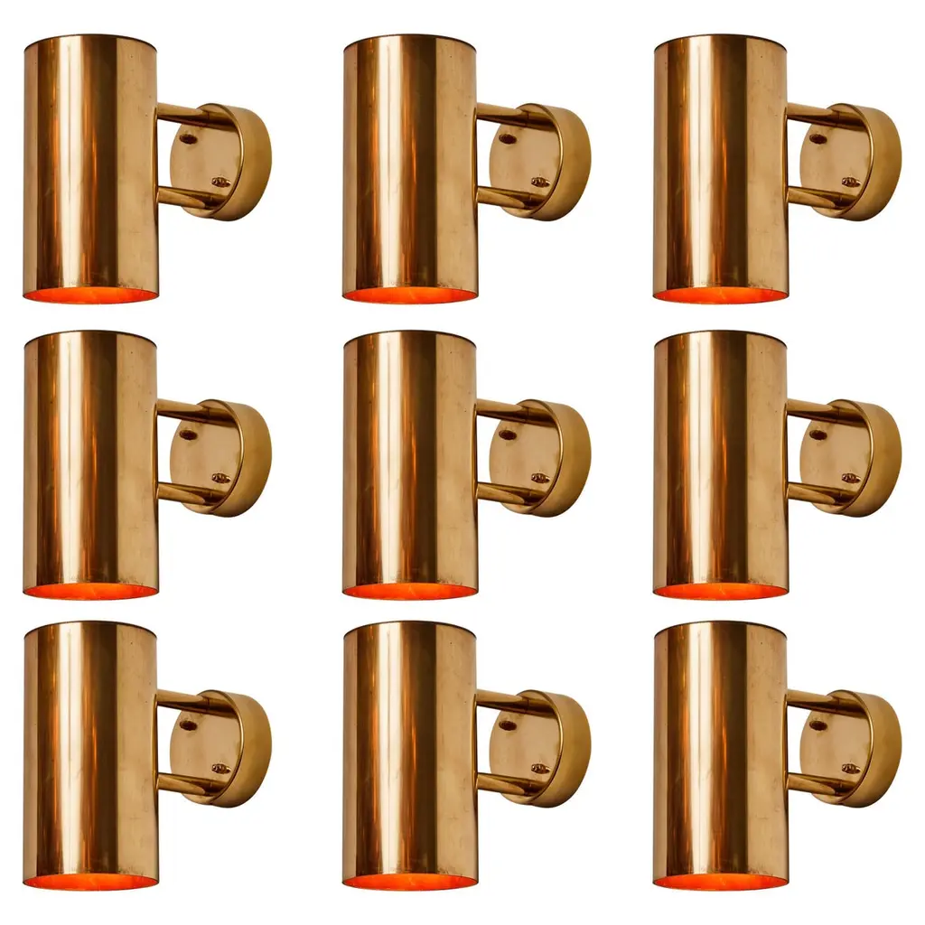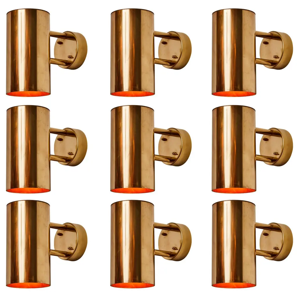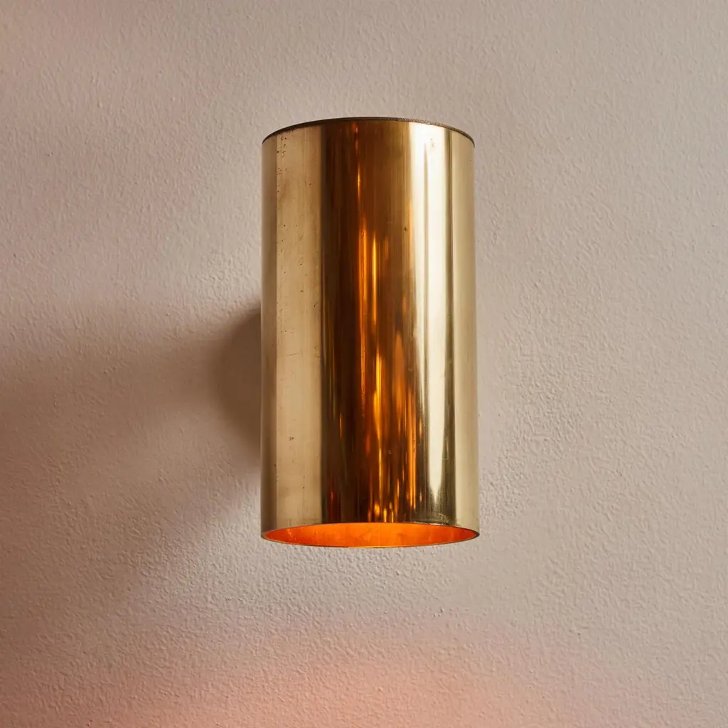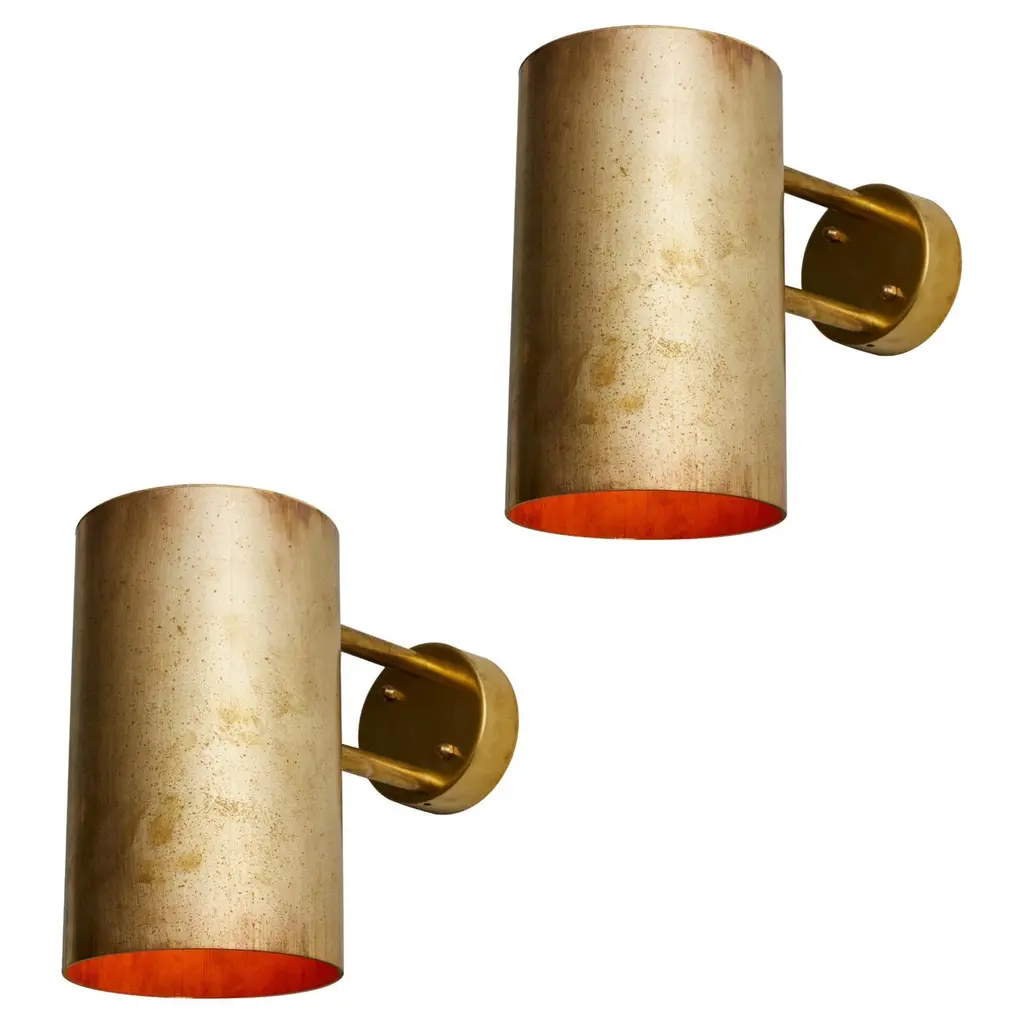 Pair of Hans-Agne Jakobsson C627/110 'Rulle' raw brass outdoor sconces. An exclusive made for U.S. and UL listed authorized re-edition of the classic Swedish design executed in raw unlacquered and unpolished brass. An incredibly refined design that is quintessentially Scandinavian. Suitable for indoor or outdoor use.Price is per pair. Available in unlimited quantities in choice of raw brass, raw copper, verdigris, darkly patinated verdigris, dark brown patinated, and white or black painted metal. Also available in a larger size - please see our separate listings. This listing is for pair of C627/110 Rulle sconces in raw brass.In stock and available for immediate fulfillment. Out of stock can take up to 5 weeks or longer. Please note that in-stock inventory and availability can change at any time. For time-sensitive orders, kindly inquire prior to purchasing.Professionally wired for US electrical. For indoor or outdoor use and hardwires to a US junction box. Accommodates a single standard medium base 100W equivalent dimmable LED bulb (or 60W incandescent), bulb not included. UL listed wet location.Please note only one representative example is featured in the photos. This lamp is fabricated in raw and unlacquered brass that will naturally patinate over time and can already show varied signs of patination through exposure to the elements, handling, storage, etc., which may result in variation and irregularitiesMade to order. All sales are final.