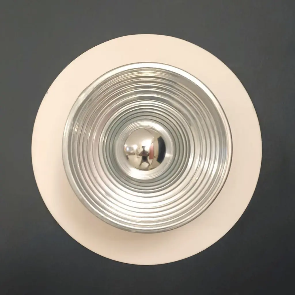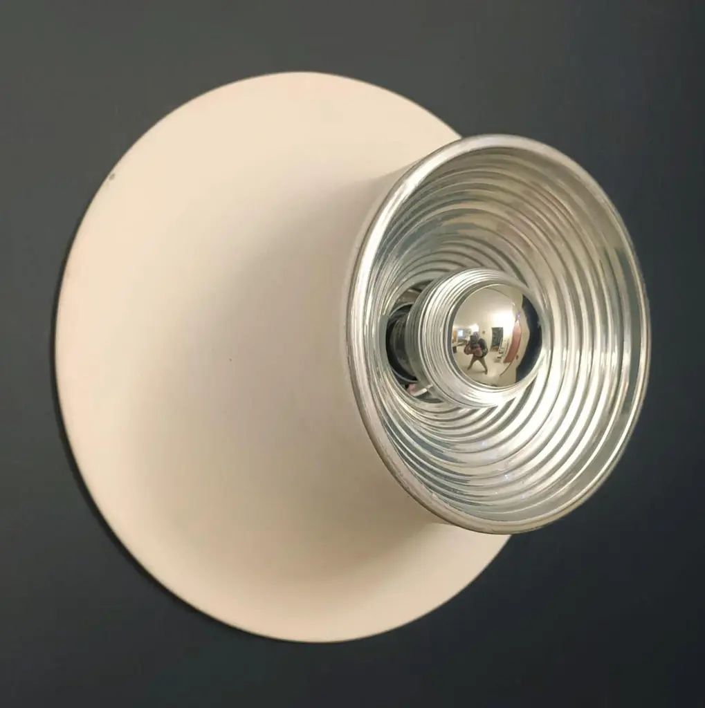 Vintage midcentury Italian wall lights or flush mounts with cream white enameled aluminum shades / Made in Italy, circa 1960sMeasures: diameter 12 inches, depth 5.5 inches1 light / E26 or E27 type / max 60W3 pairs available in stock in Italy, price is for each pair.