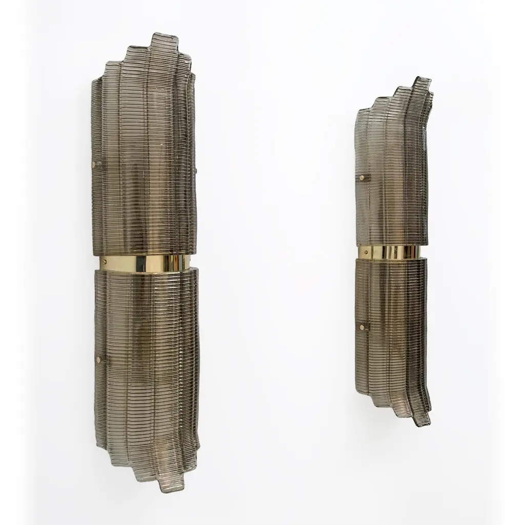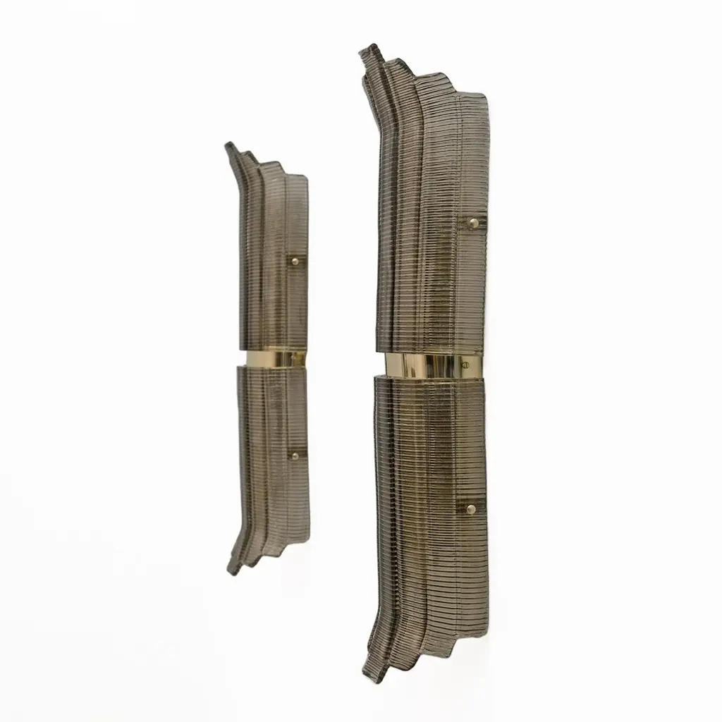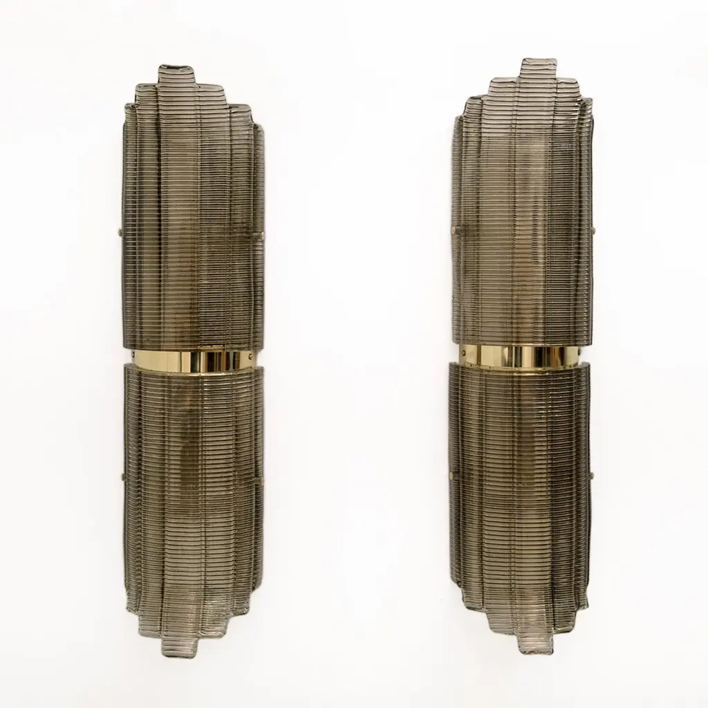 Pair of Smoked Murano Glass Wall Lights, crafted from textured glass and brass. The glass is ribbed and curved in design, creating a stunning decorative impact. Each wall light requires a medium socket bulb and is wired to US and European standards.Other pairs are available, please inquire for availability.We also sell in odd quantities, contact us for a quote. Additionally, our glassworks can produce larger quantities to meet your specific needs upon request.