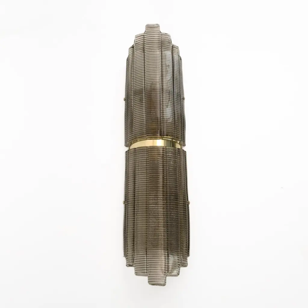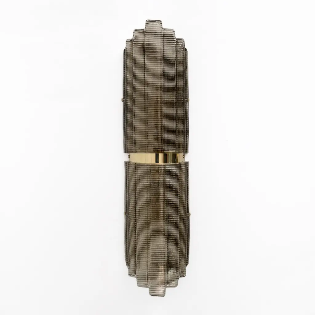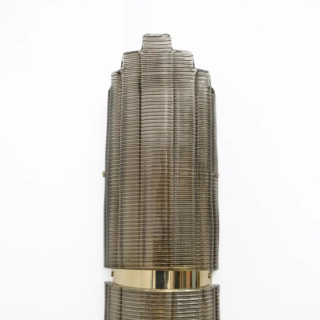 Pair of Smoked Murano Glass Wall Lights, crafted from textured glass and brass. The glass is ribbed and curved in design, creating a stunning decorative impact. Each wall light requires a medium socket bulb and is wired to US and European standards.Other pairs are available, please inquire for availability.We also sell in odd quantities, contact us for a quote. Additionally, our glassworks can produce larger quantities to meet your specific needs upon request.