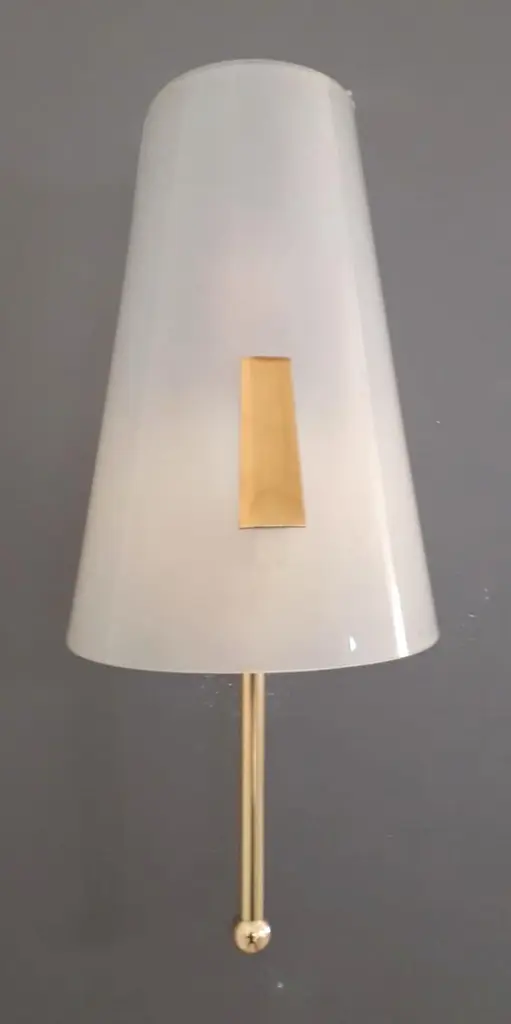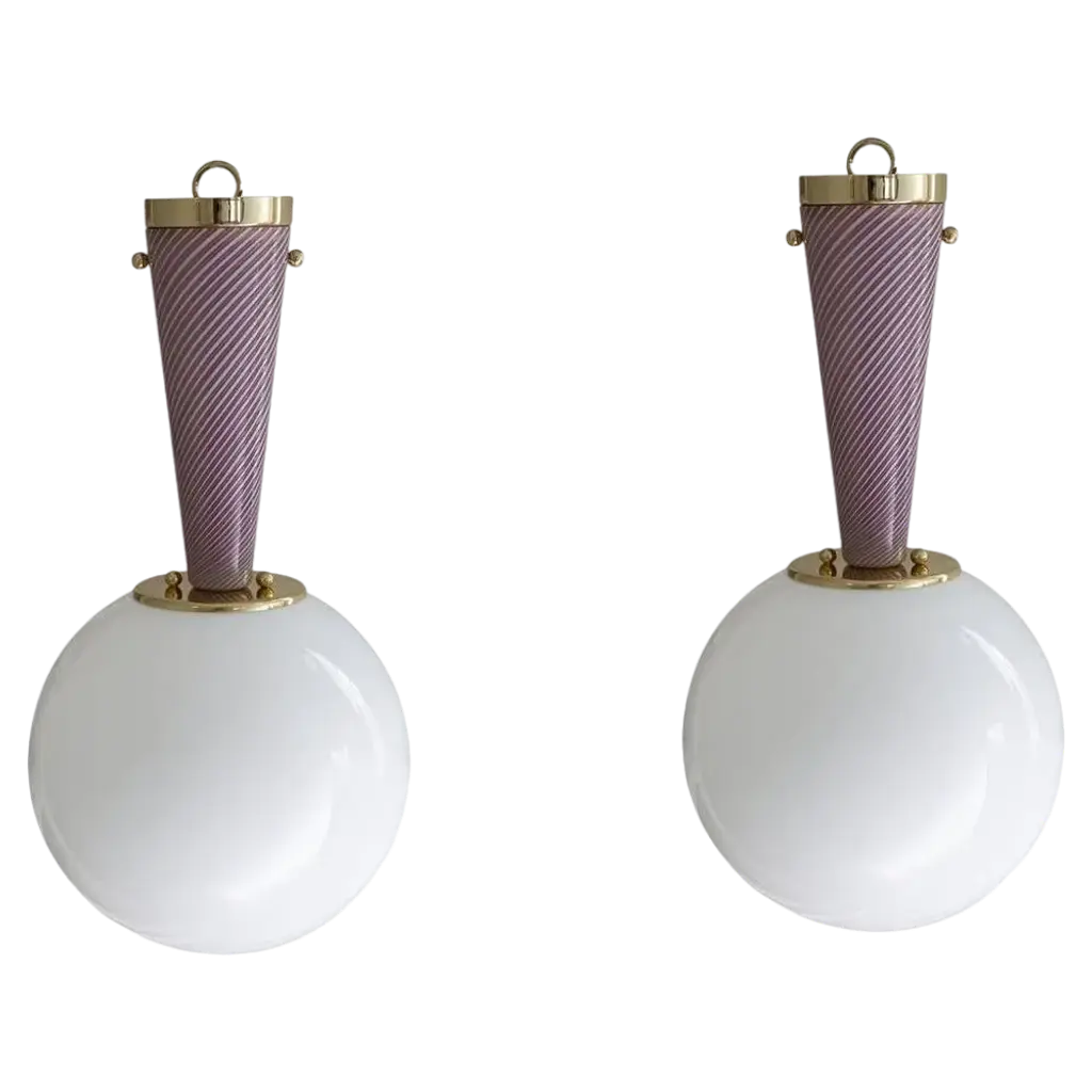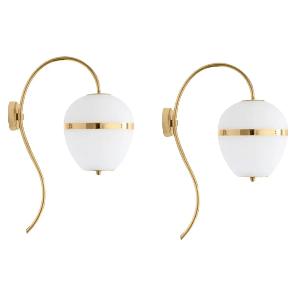 Vintage Italian wall lights with hand blown opaline Murano glass shades mounted on brass frames / Made in Italy circa 1960sMeasures: Height 11.5 inches, width 6 inches, depth 5 inches, backplate diameter 5 inches1 light / E12 or E14 type / max 40WOrder reference #: FABIOLTD W827