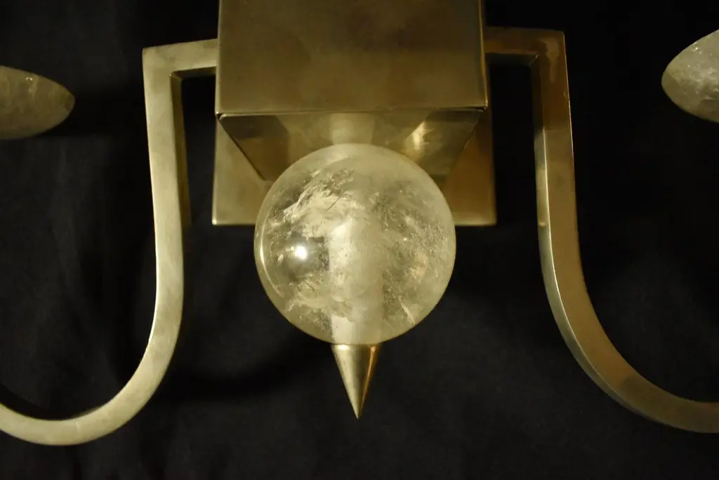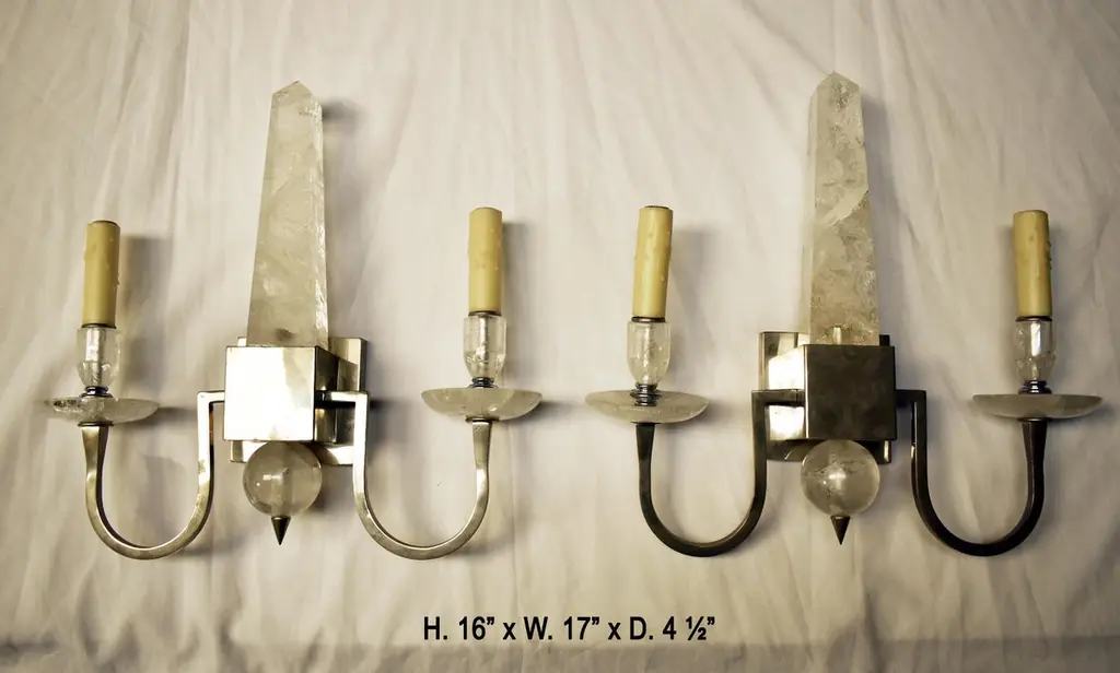 Striking pair of modern style rock crystal obelisk two-light Sconces, with chrome finish. (A)21st century. Each sconce is centered with a chromed square back plate and cube with a hand carved and polished Rock crystal obelisk and smooth ball, flanked by two scrolling arms with a smooth Rock Crystal bobesche and candle holder. The sconces make beautiful statement in modern homes as well as Neo-classical. Hand-made beeswax candle sleeves included. Electrified for the U.S. market. Measures: H. 16” x W. 17” x D. 5”.