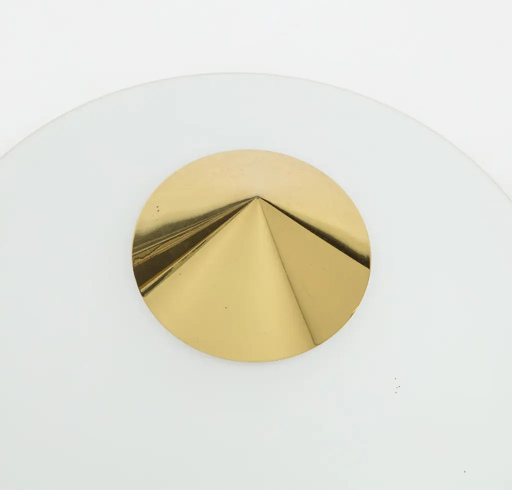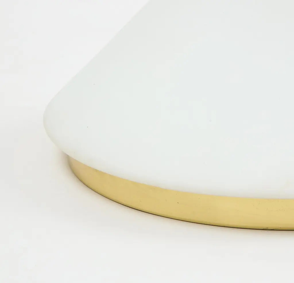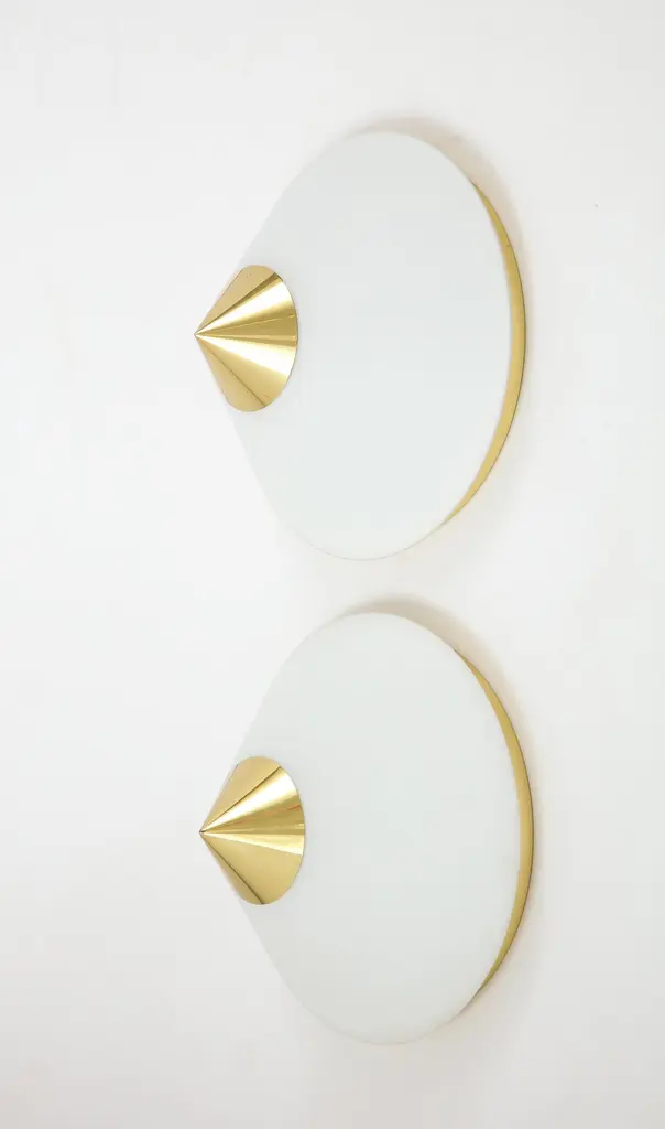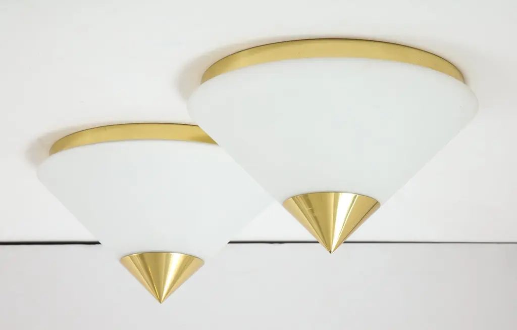 Pair of 1970s midcentury flush mount / sconce by Limburg.The large cone shaped opaline glass shade finished with a polished brass cap sits on awall plate that has been newly rewired for the US with a single light source Max 60 watts.They are priced by the pair and there are 3 pairs available.