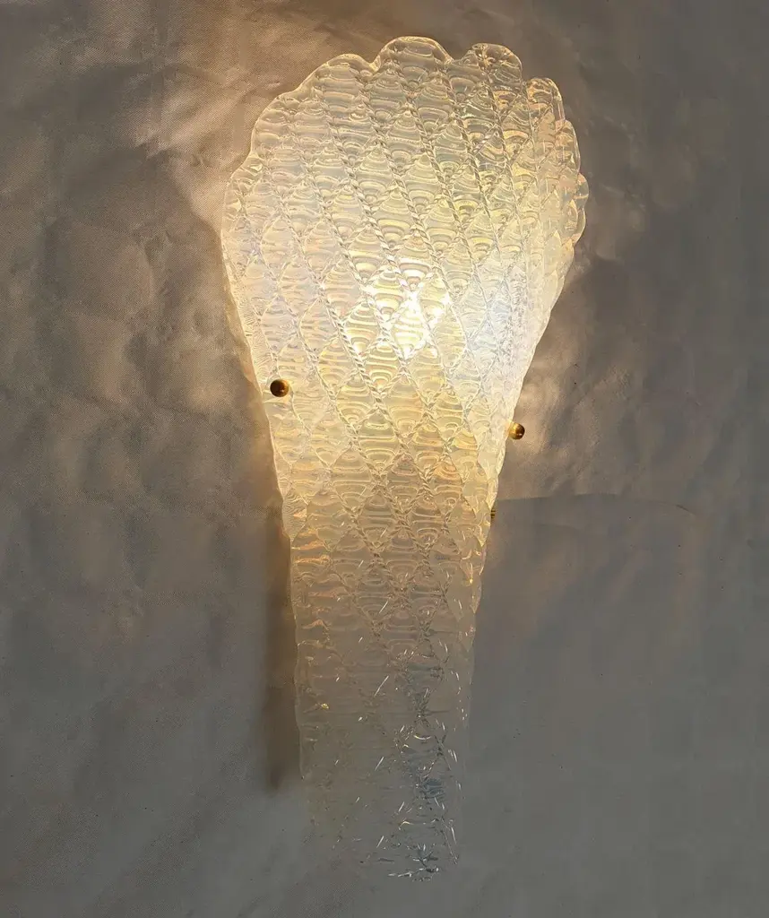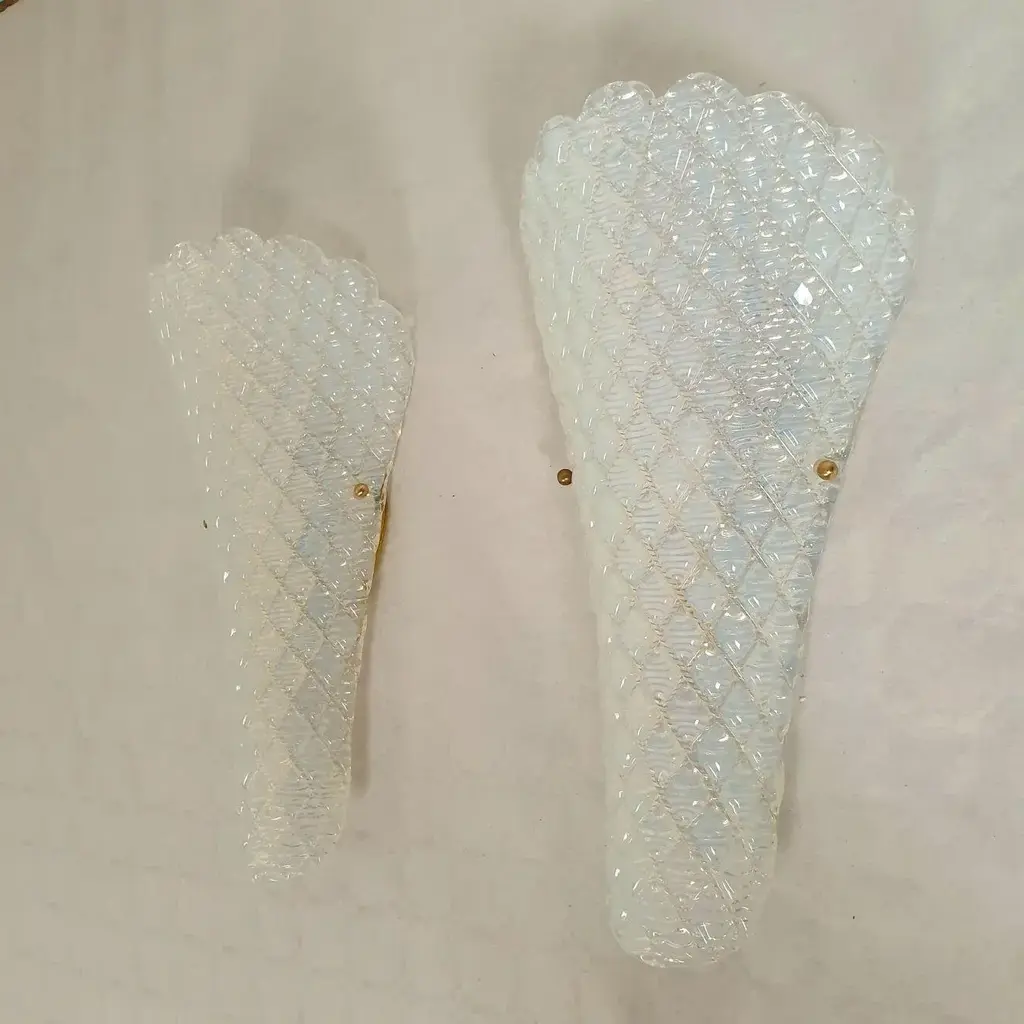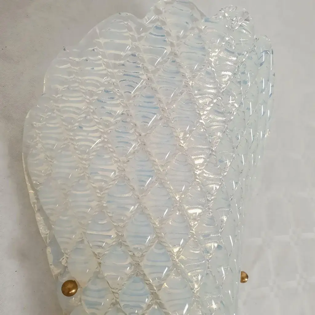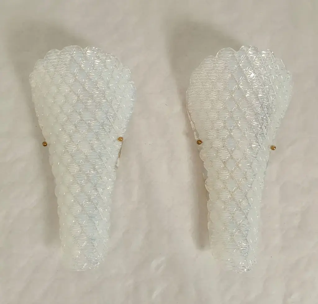 Pair of opaline Murano glass sconces, Mid Century Modern, attributed to Mazzega, Italy 1970s. Set of two pairs, or four sconces available. Sold and priced by pair. To inquire about the set of four, select 2 items in the menu. The Italian sconces are made of a single thick piece of Murano glass, curved, with a diamond pattern in relief and in an opaline color. This particular coloration of Murano glass produces light blue and white shades to amber and blue shades when lit. The sconces frame is in white painted metal. Each Mid Century sconce has one light and is rewired for the US using E12 or Candelabra base sockets. (can be rewired for Europe upon request) The opalescent Murano glass vintage sconces are in excellent condition