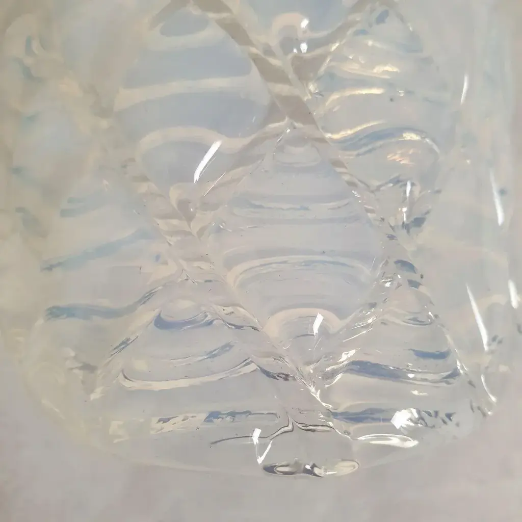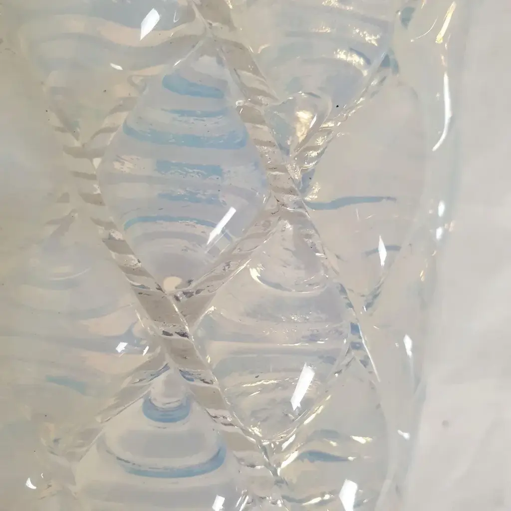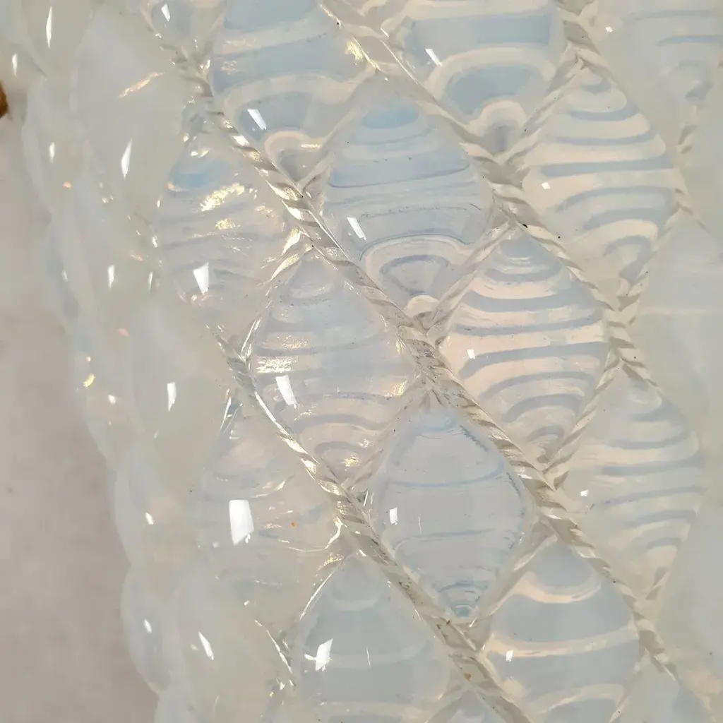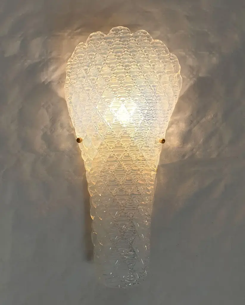 Pair of opaline Murano glass sconces, Mid Century Modern, attributed to Mazzega, Italy 1970s. Set of two pairs, or four sconces available. Sold and priced by pair. To inquire about the set of four, select 2 items in the menu. The Italian sconces are made of a single thick piece of Murano glass, curved, with a diamond pattern in relief and in an opaline color. This particular coloration of Murano glass produces light blue and white shades to amber and blue shades when lit. The sconces frame is in white painted metal. Each Mid Century sconce has one light and is rewired for the US using E12 or Candelabra base sockets. (can be rewired for Europe upon request) The opalescent Murano glass vintage sconces are in excellent condition